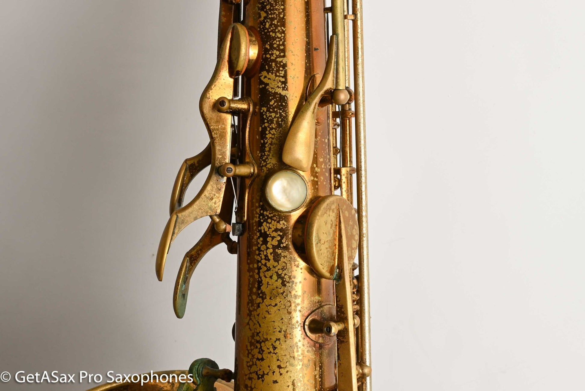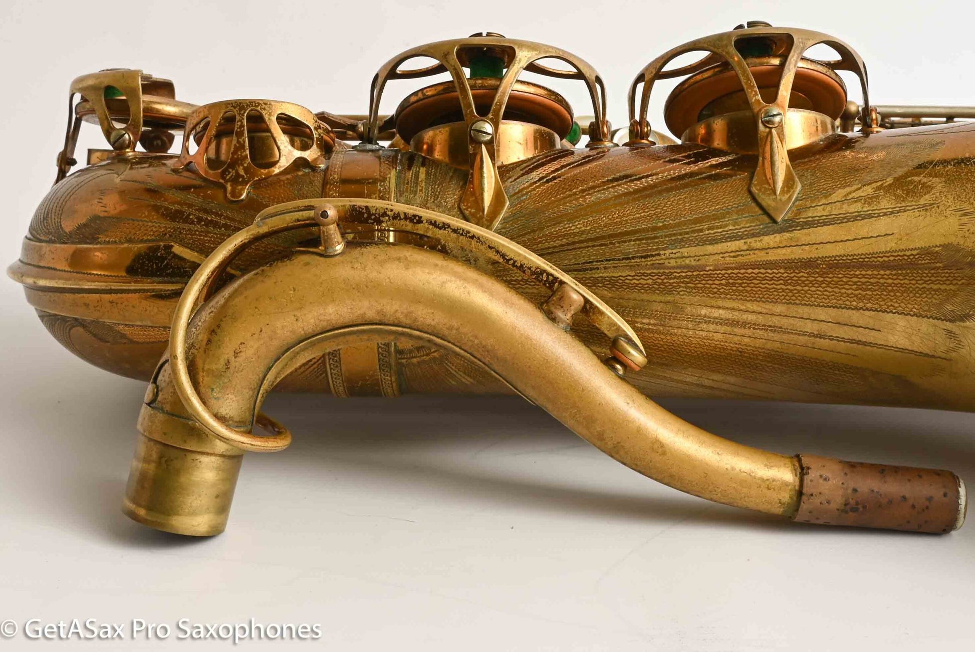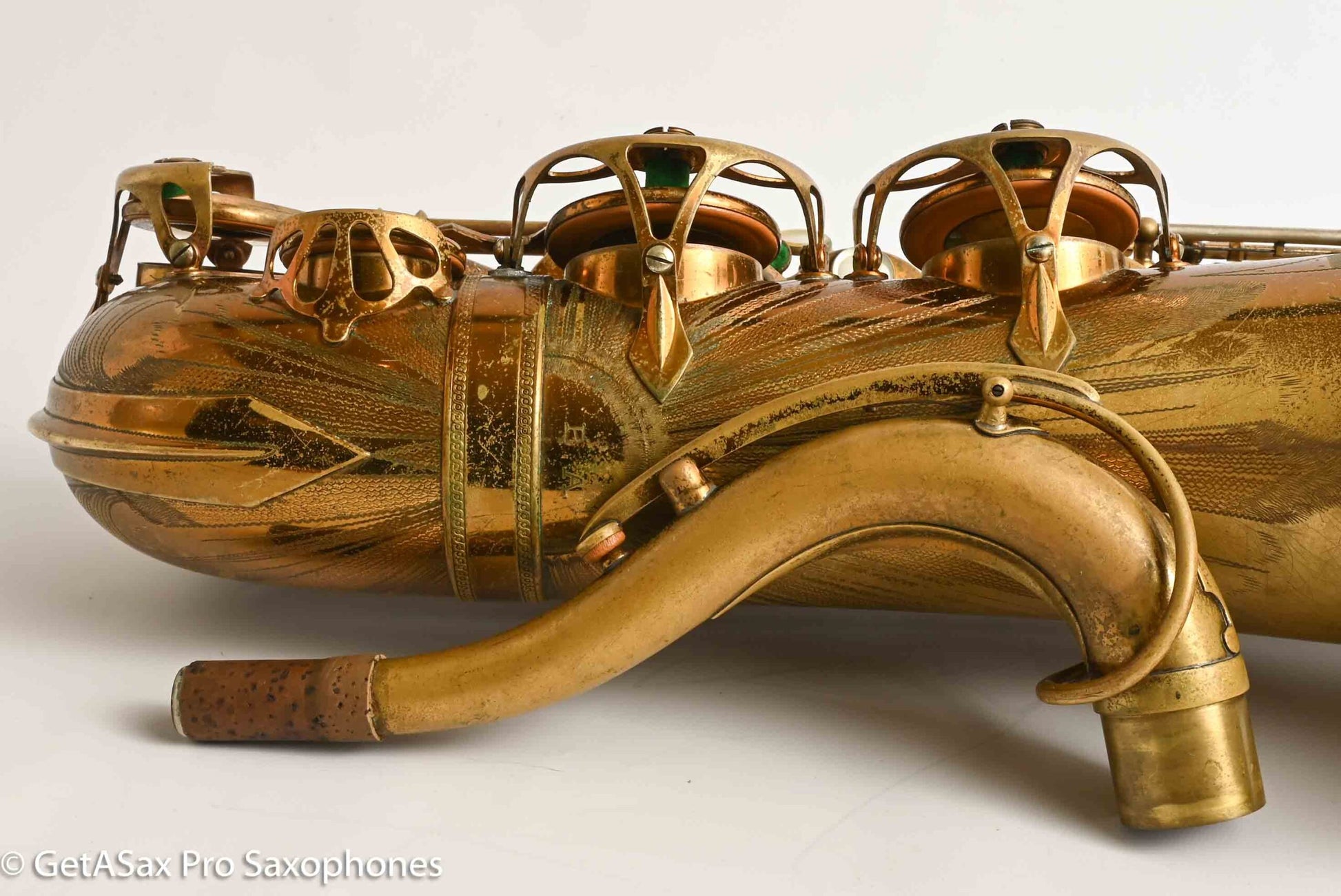 This tenor gets my rare distinction of being an ‘exceptionally fine player’, and it also is an extremely rare and fantastic example of a very early Selmer Balanced Action tenor with an American-engraving pattern that was only used for a short period on a few tenors. I think it’s really great. This horn plays basically like a Balanced Action – warm, velvety, with a lyrical core that is obviously Selmer. But it’s a little more spread and a little darker than a Late Balanced Action, almost like it’s partly Radio Improved (my favorite vintage Selmer tone) and partly BA (my second favorite vintage Selmer tone). But it has the more comfortable BA keywork layout, so it really is a special ‘unicorn’ sort of vintage Selmer that you never see. I’ve seen one other one of these ever, and I don’t think that one was original lacquer. This tenor recently got a complete overhaul done through GetASax with Italian leather Pisoni pads, and the nice made in USA reusable slightly domed brass resonators that I love on these horns. You won’t find a nicer BA, and certainly not for this price. Only one available!