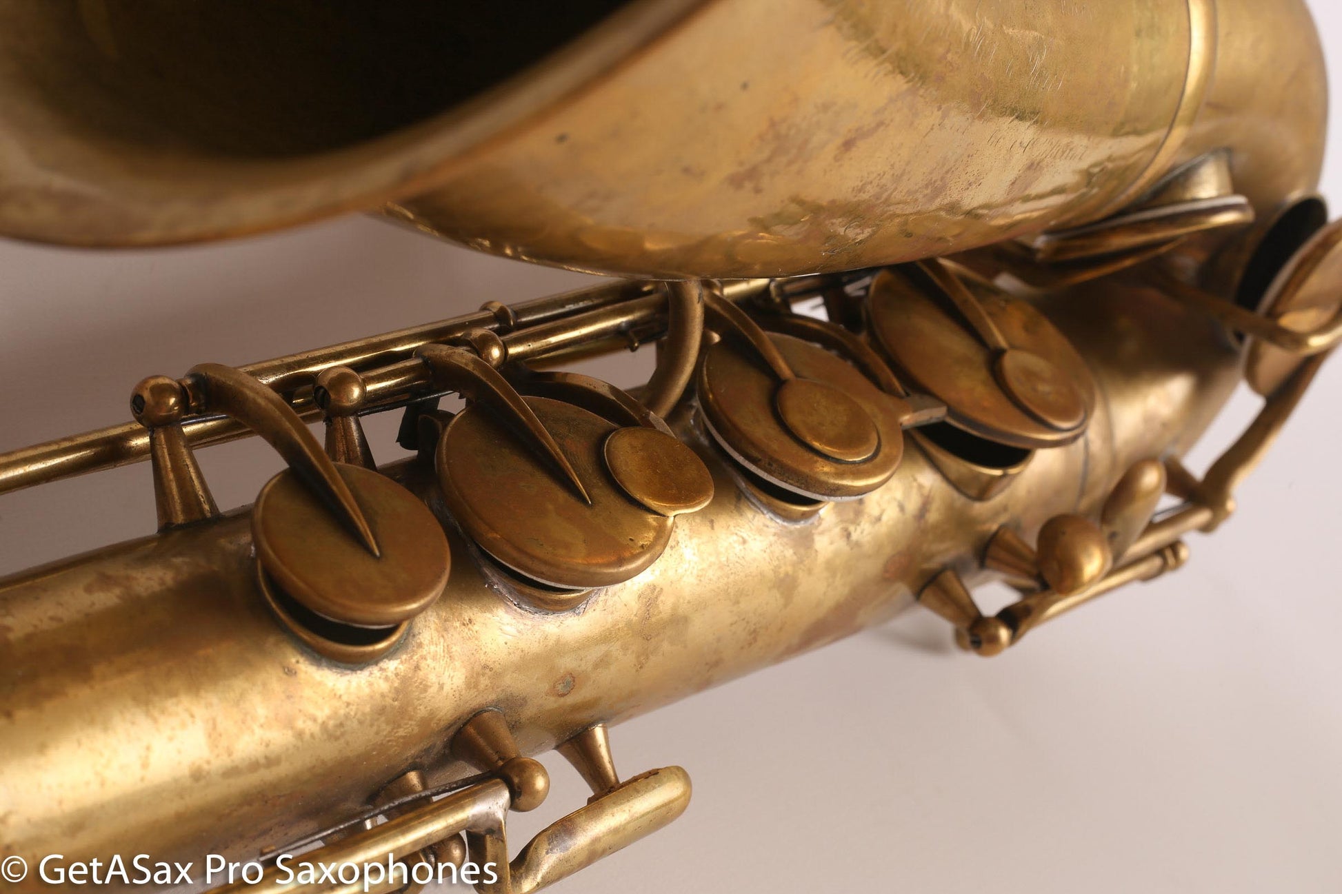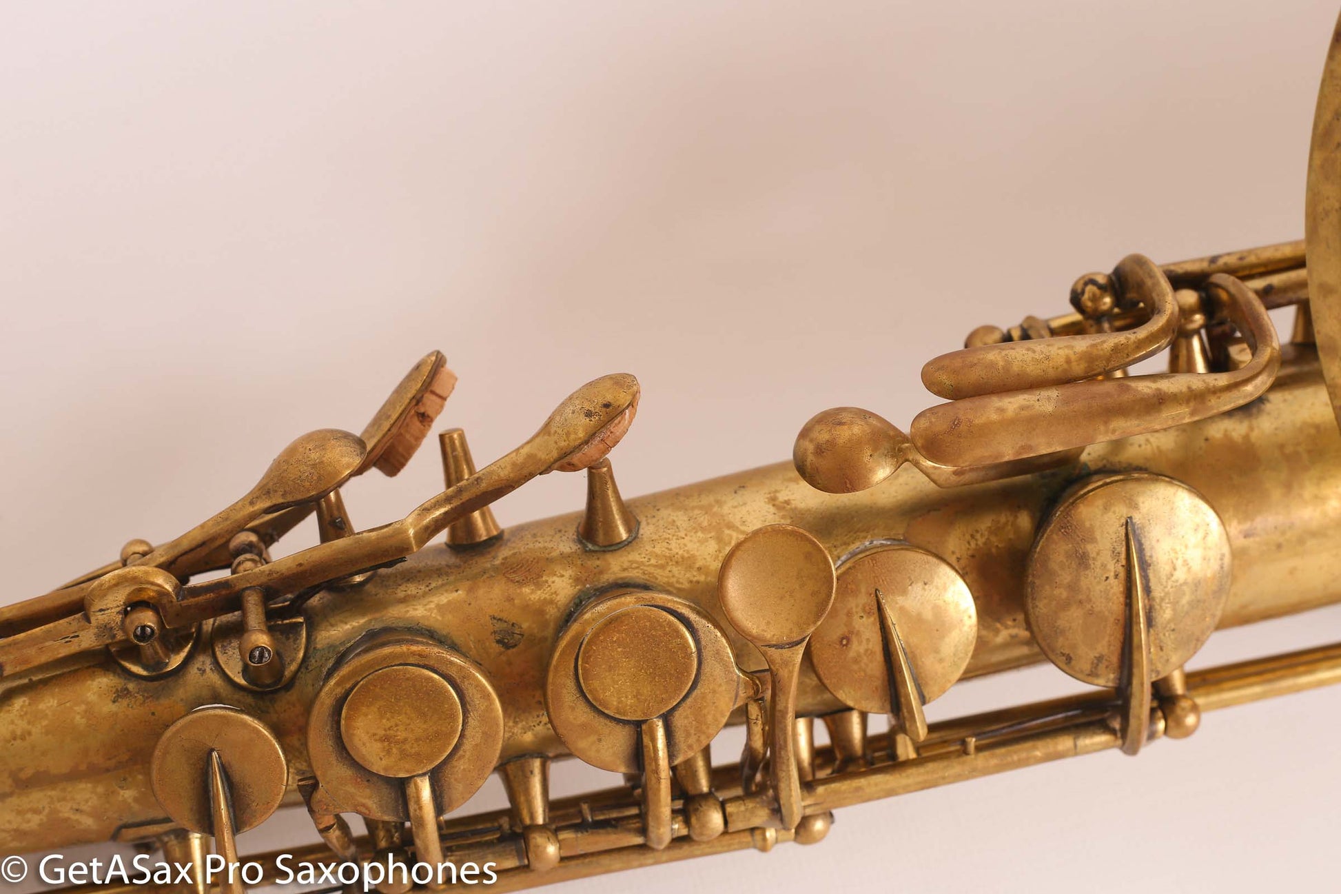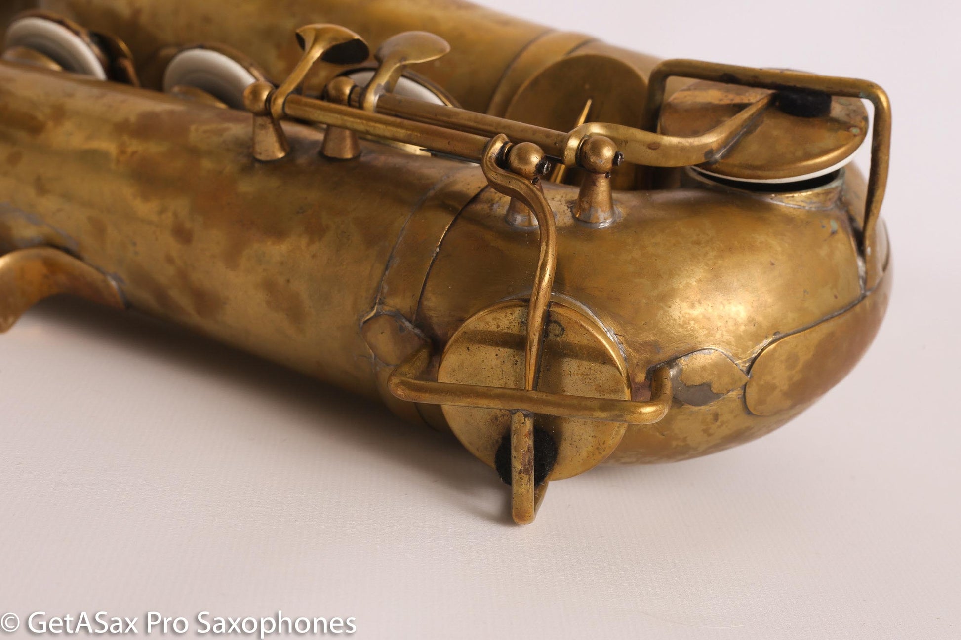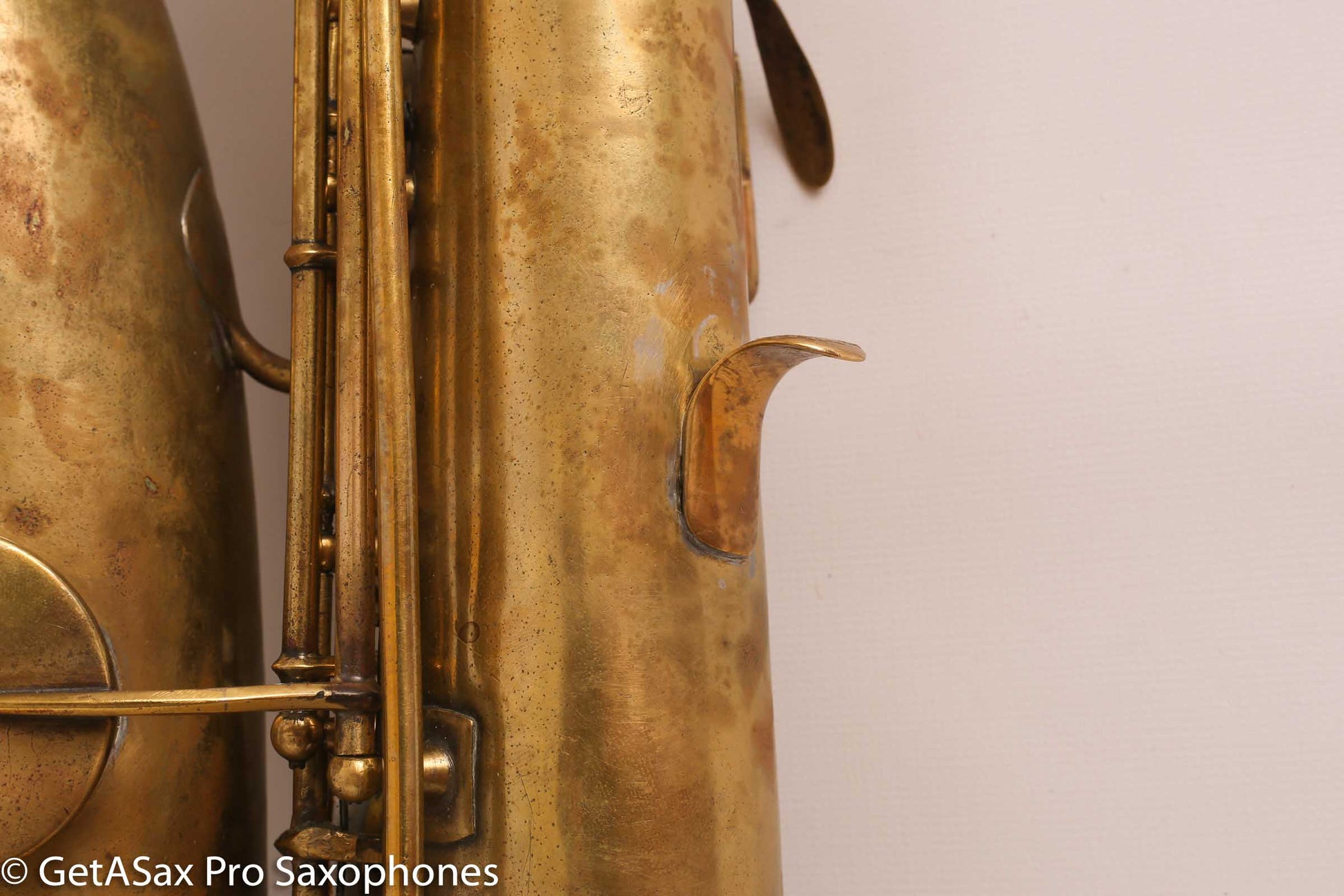 This alto got restored in Germany, but is still not in top playing condition. It plays, but it would play better with more work. The restoration included new suitable pads, leveling/silver-soldering of toneholes, rebuilding a tonehole, brass repairs and adjusting the mechanics to good playability.