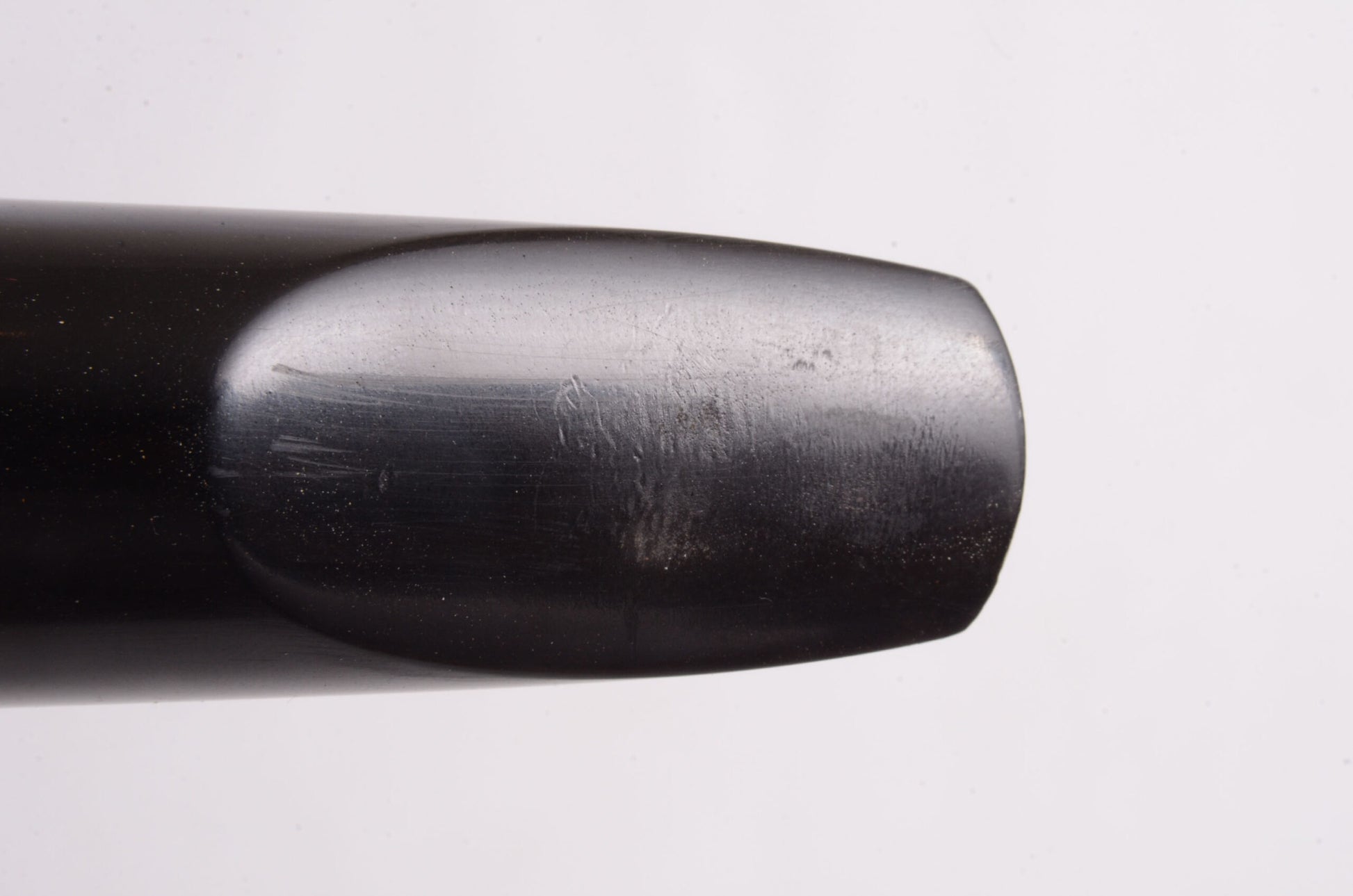 Nice vintage hard rubber Berg in a .122" tip, which is about right for a 110 stamp (probably Berg used a traditional wedge style gauge rather than a modern one that measures the opening at the very tip). This has the 1 baffle, so it's pretty bright but still sounds fat. Original facing, no significant damage or wear. Great mouthpiece! These remain undervalued in my book.