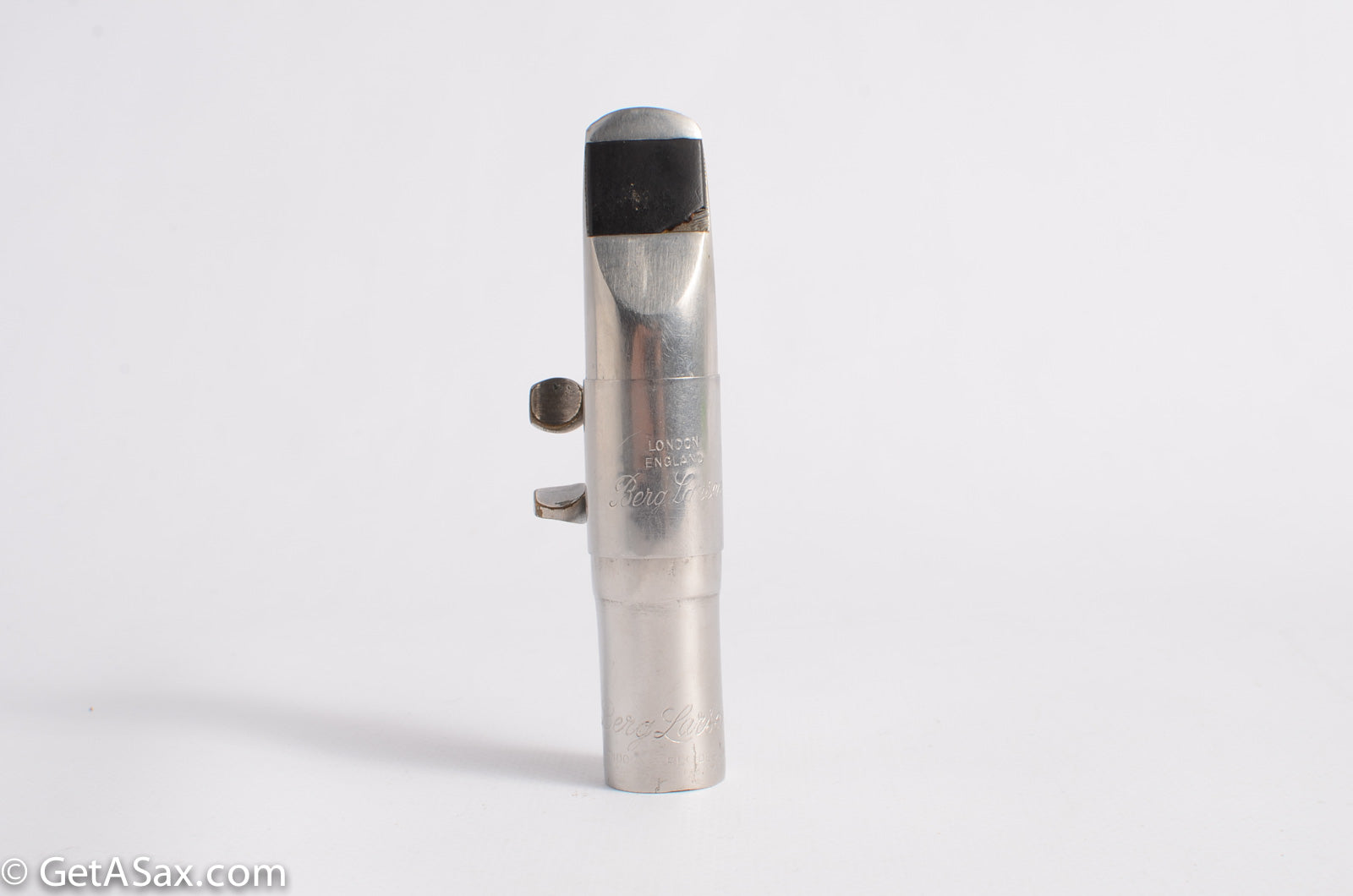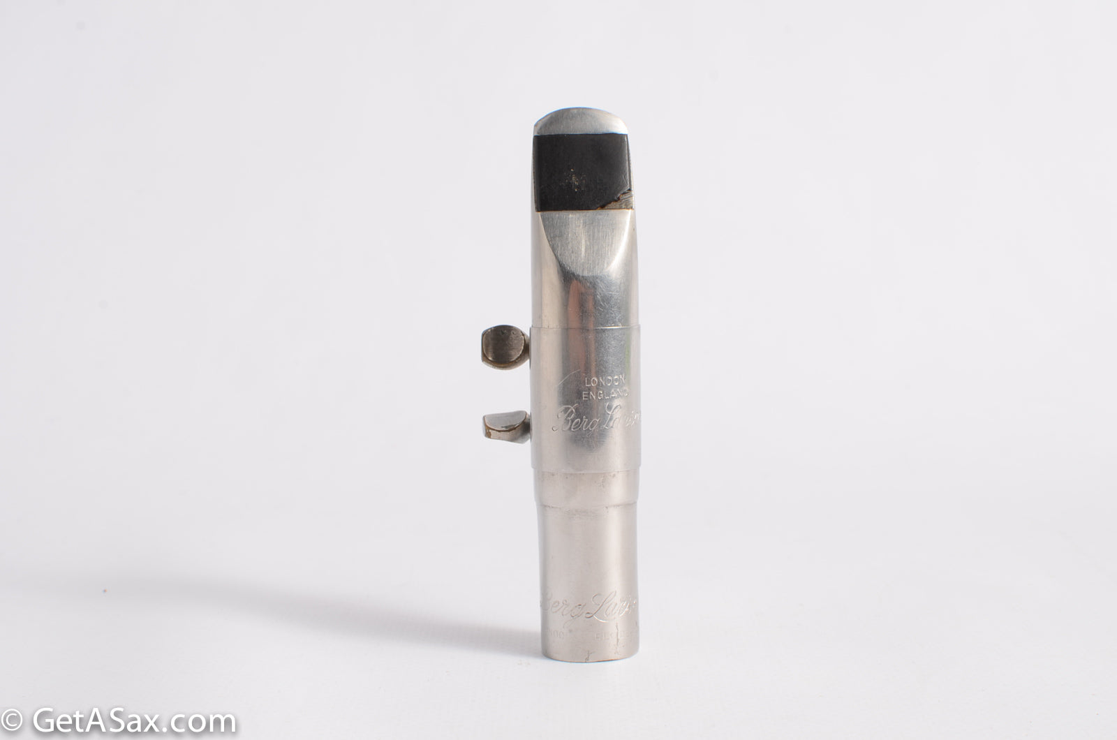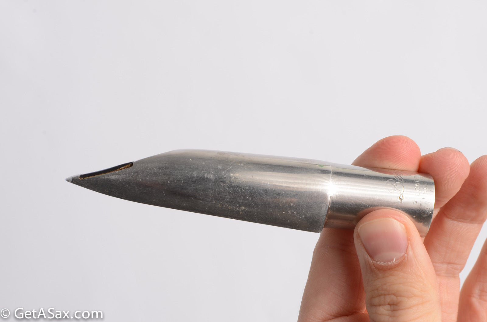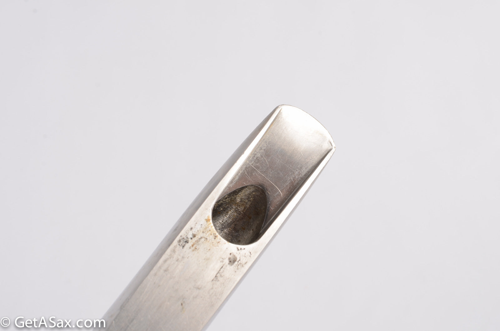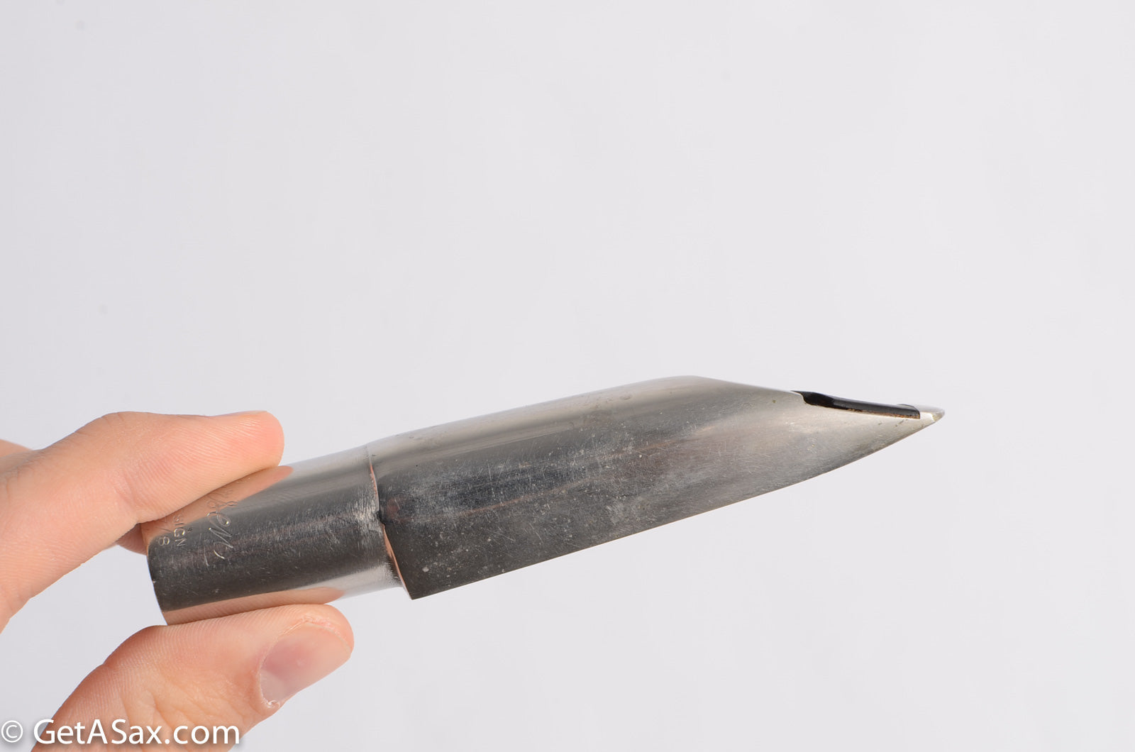This is a discounted Berg Larsen tenor mouthpiece that plays pretty well as-is, but would look better with a reface. It looks like someone rubbed the table with steel wool to clean it up, and also one corner of the beak has kind of a ding on it. Getting it refaced would correct both of those. Or you could just play it. This piece measures .109" so it's pretty close to the 110 stamp. The baffle is the 0 version, which is highest, and has the brightest tone. The bullet chamber has the finishing marks inside showing still.