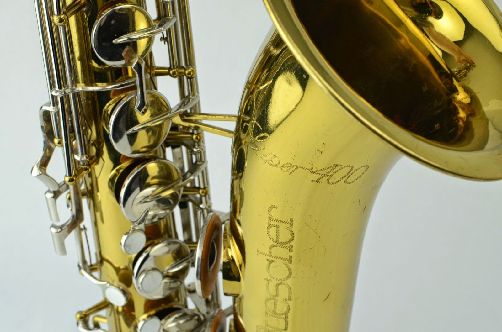 This is a nice, clean, original Buescher Super 400 tenor saxophone. It has original lacquer, original pads, springs, snaps, and a cool original case. This is a professional horn made in the USA that is basically identical to the more expensive "Top Hat and Cane" tenors, but which has simpler engraving. These horns all have a big, balanced tone that is medium between bright and dark, and excellent intonation. They work great for a wide range of playing situations. In terms of past damage, this horn has a few shallow dents (back of the bow area and one on the neck), and the low C/Eb post is slightly pushed in. These are all very minor. The neck brace also popped slightly off and been resoldered, which is very common on these tenors.
