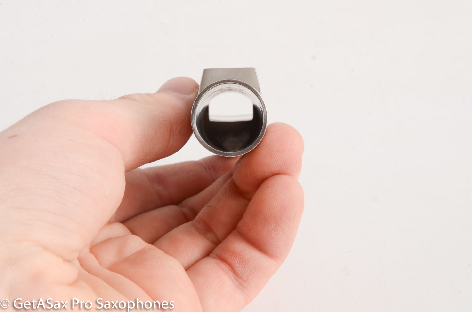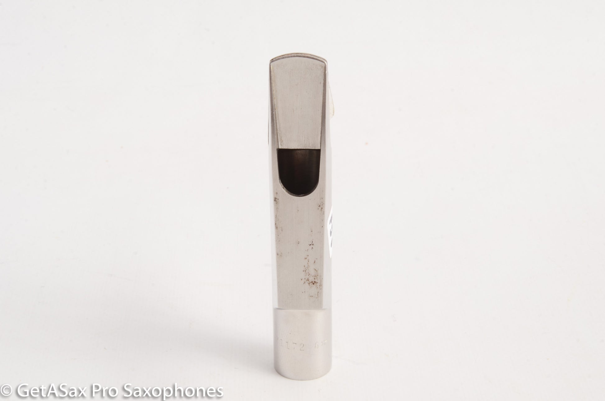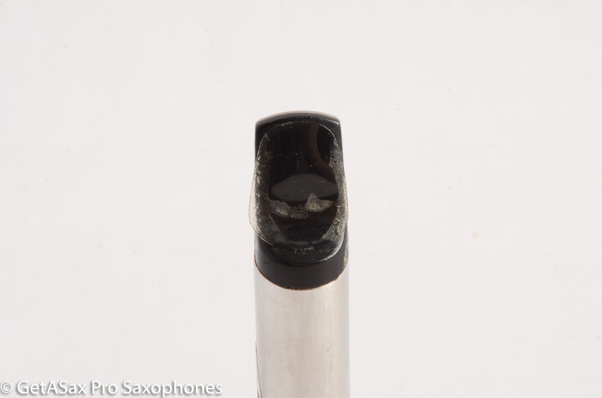 Guardala Studio like mouthpiece for 90+% less. Haha. Straight sidewalls, medium chamber after a high stepped baffle. Tip opening measures 0.096″. Not as bright as a modern high stepped baffle, more similar to Berg Larsen in that it has good projection while maintaining a dark lush tone. The unusual beak shape takes some getting used to, but it is interesting. The thick tip and low angle make the bite plate almost parallel to the reed.