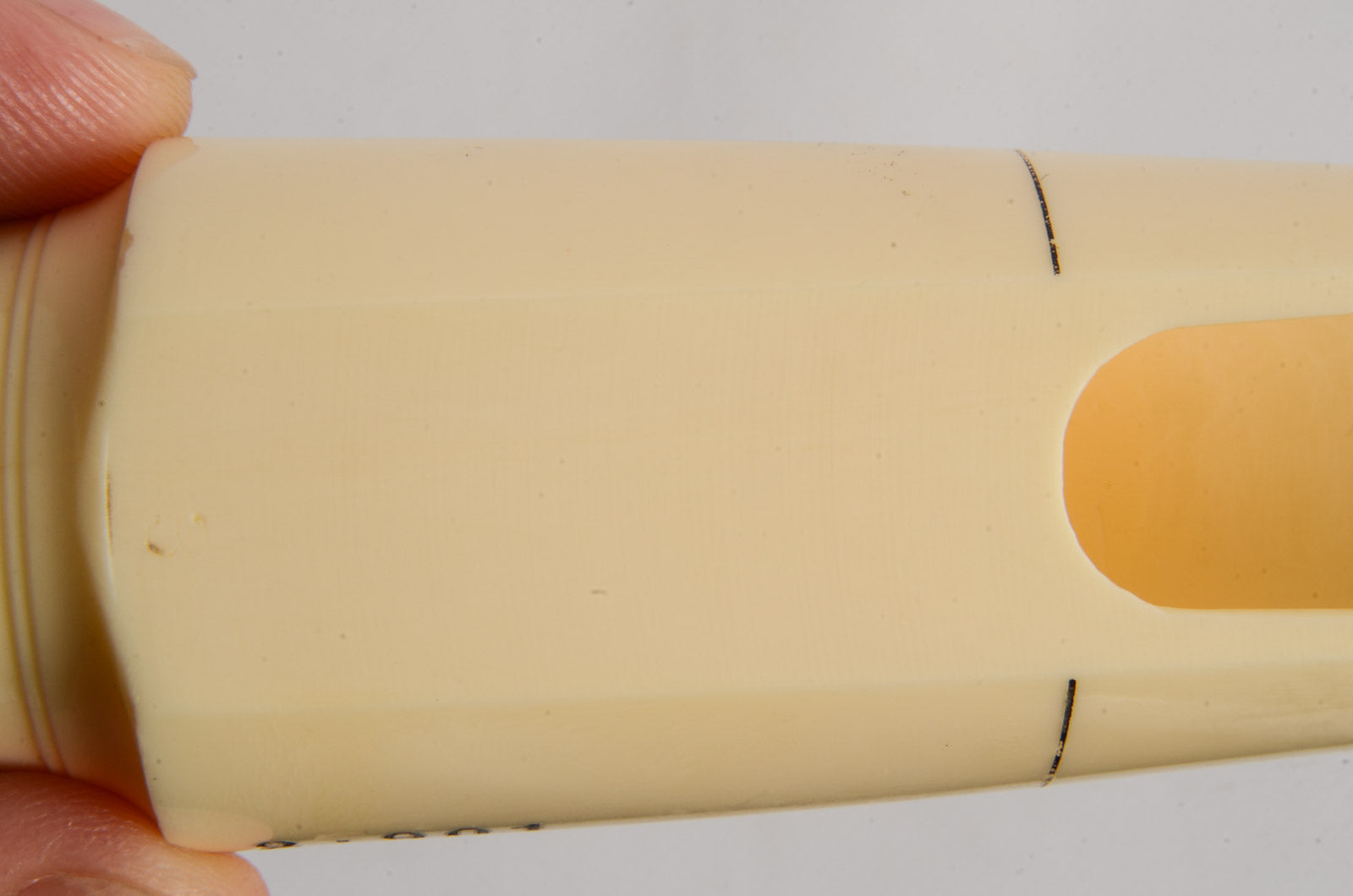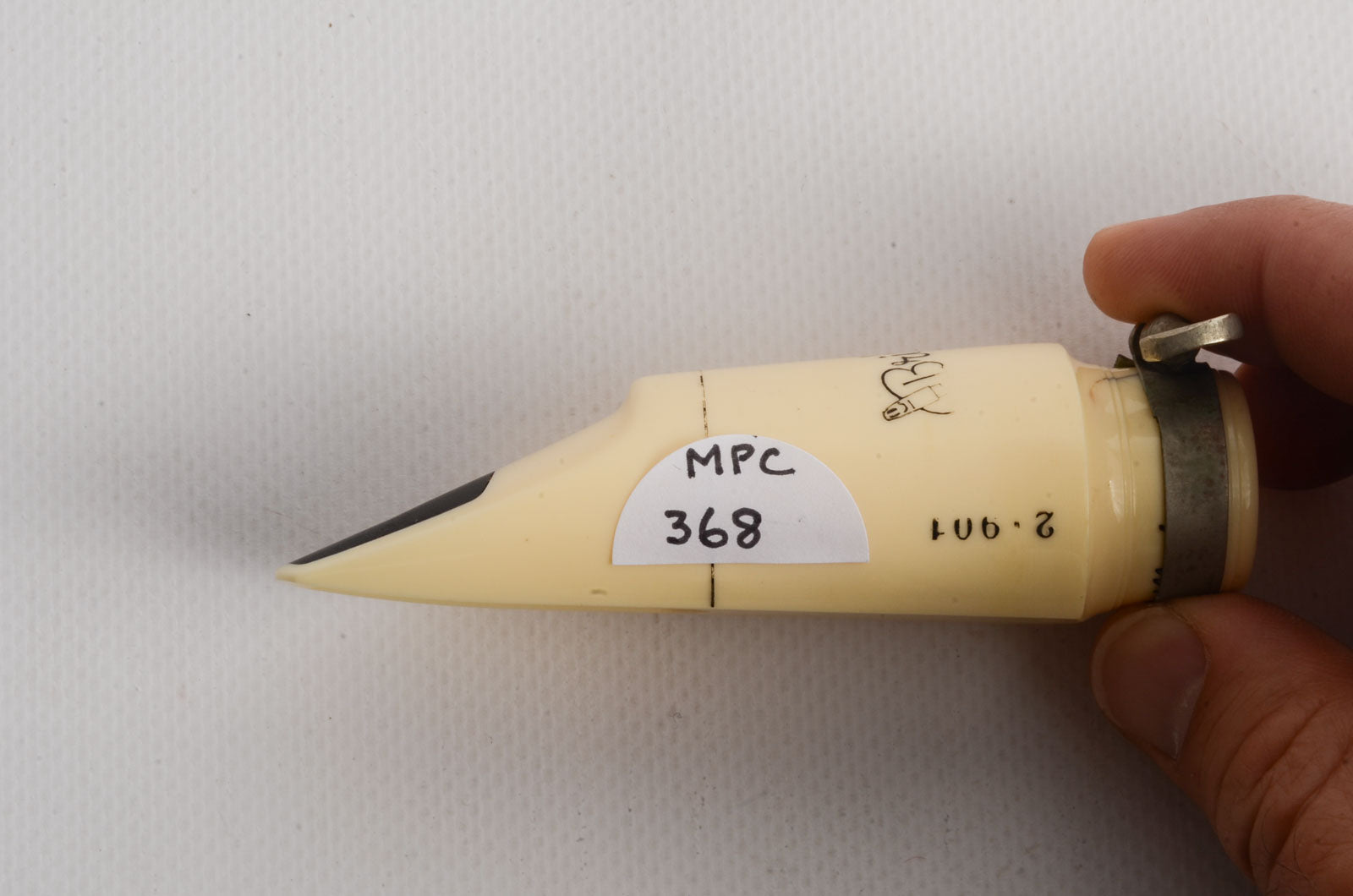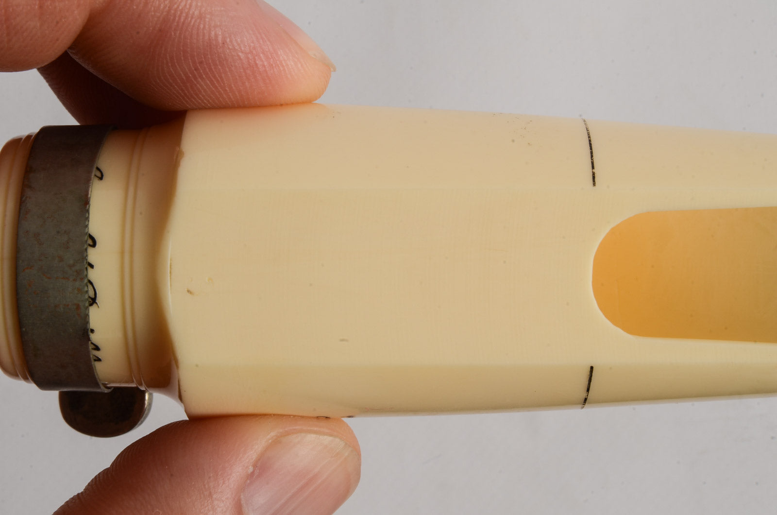 This Brilhart mouthpiece has a very mild rollover baffle and an open chamber. It has a tip opening of 0.069". The biteplate and rails are beautiful, and the clamping ring keeps the cracked shank together.