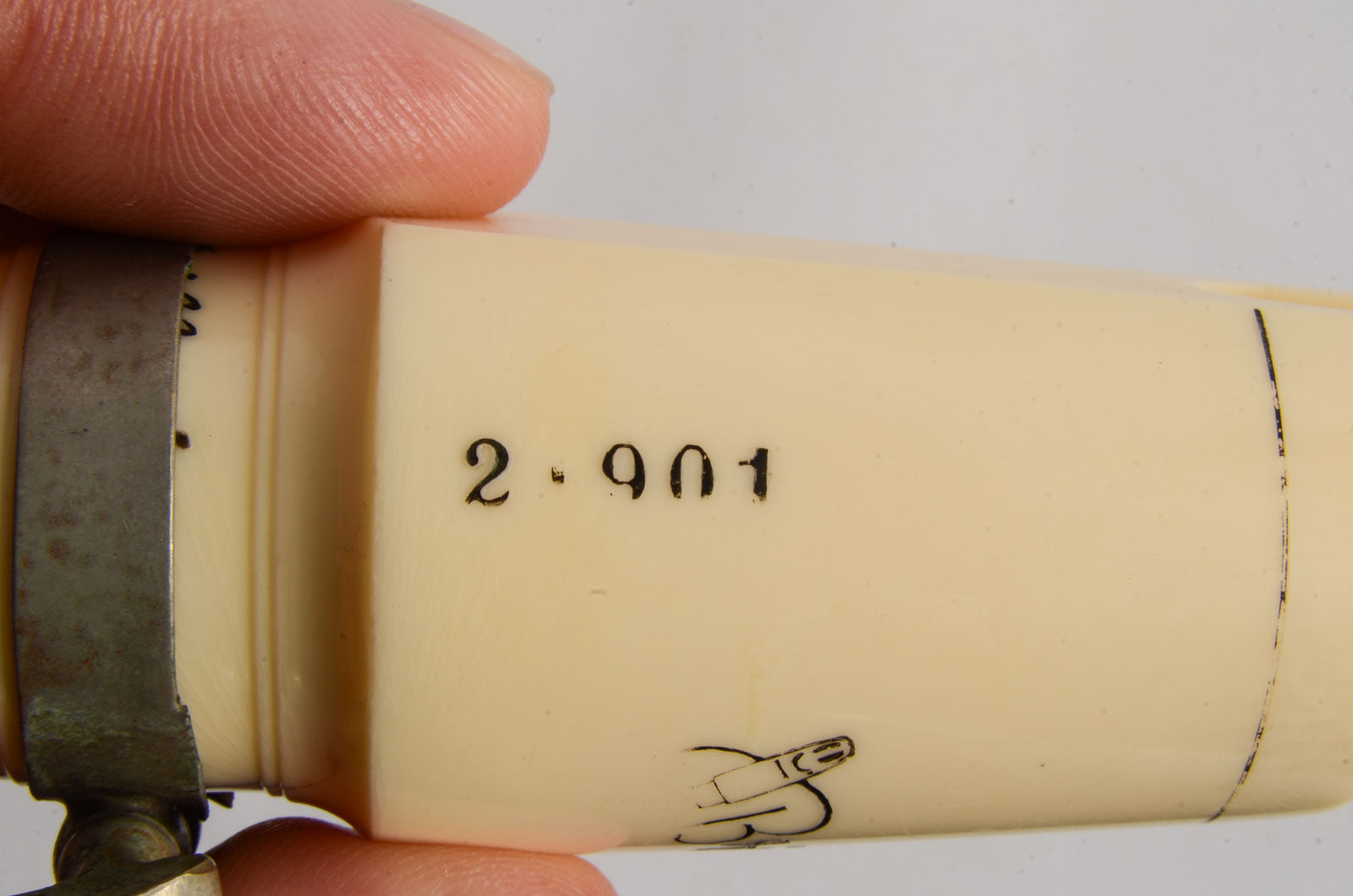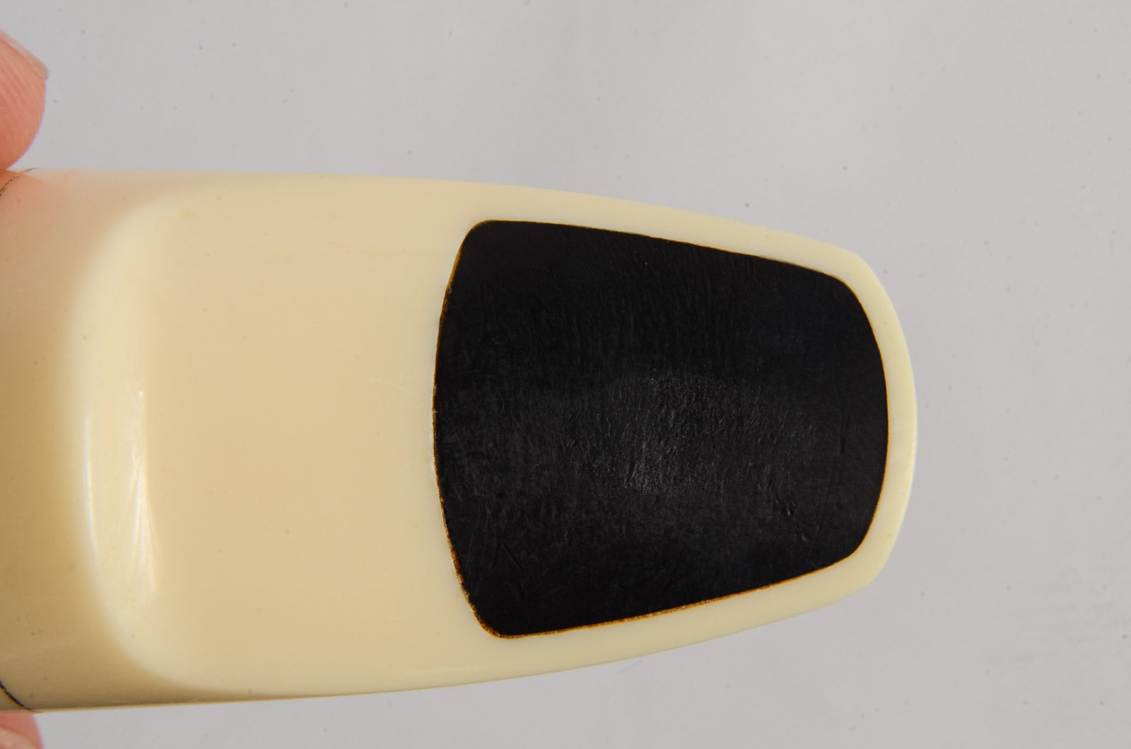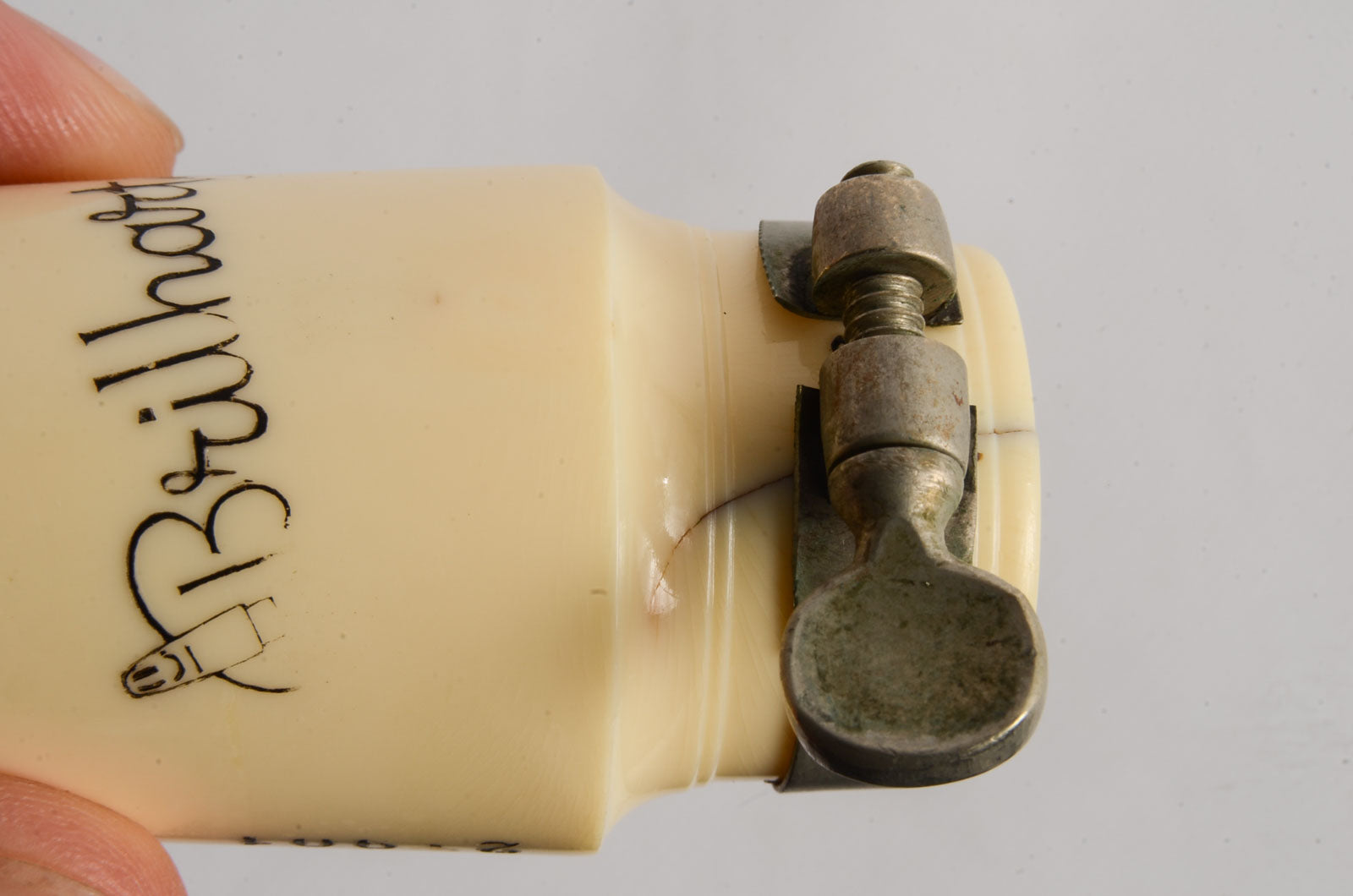 This Brilhart mouthpiece has a very mild rollover baffle and an open chamber. It has a tip opening of 0.069". The biteplate and rails are beautiful, and the clamping ring keeps the cracked shank together.