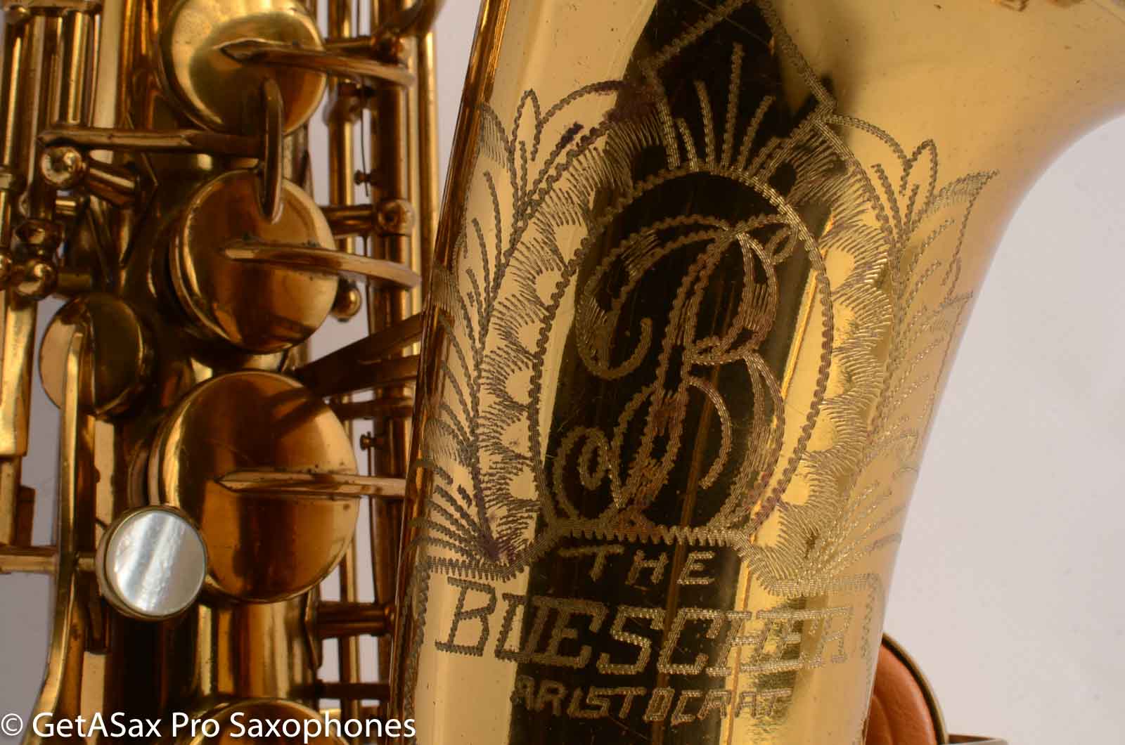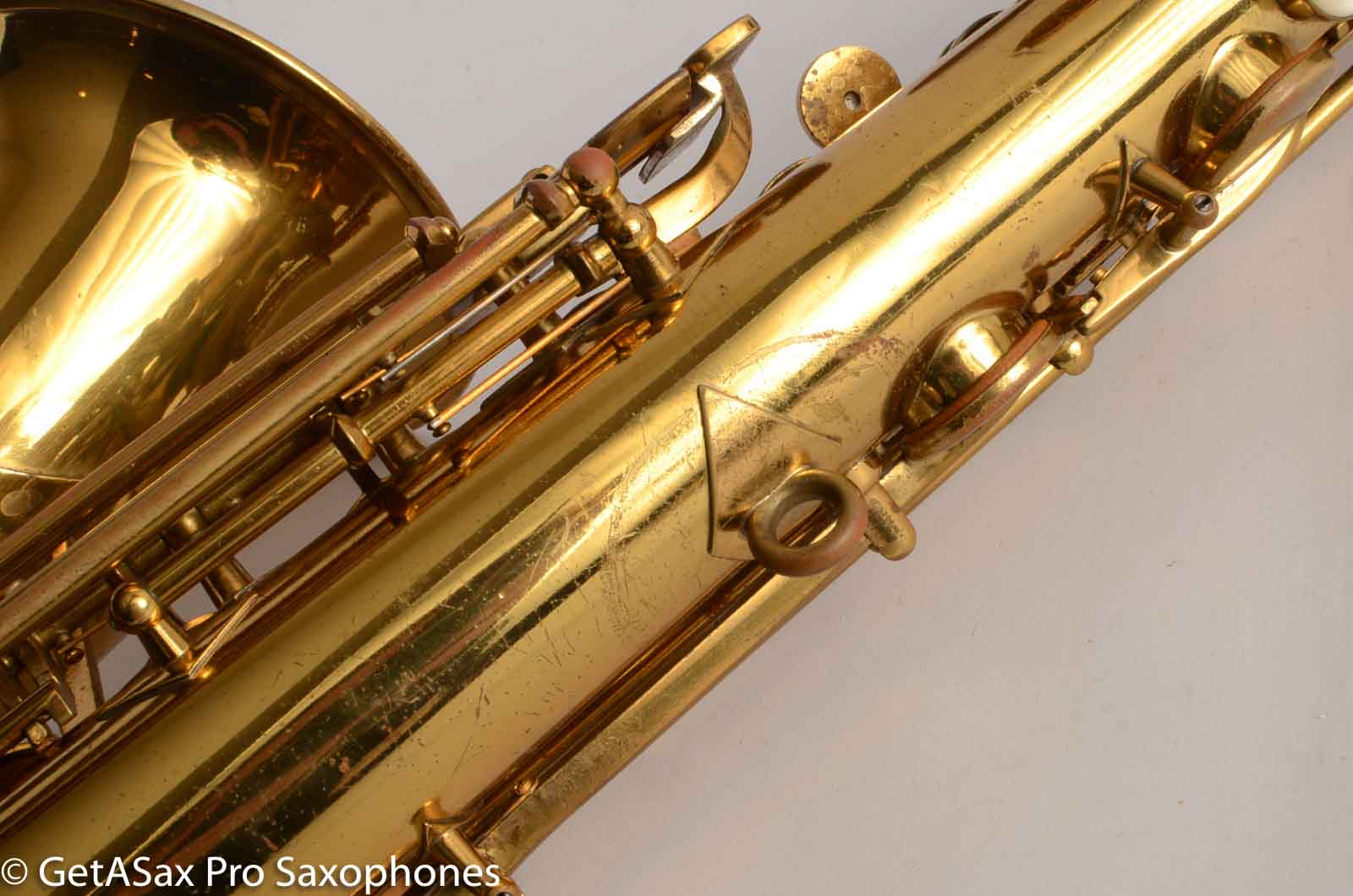 This is a 1949 Buescher “Big B” Aristocrat, so named for the ornate engraving of a, well, a Big B on the bell. This horn is in very good condition, and the typical wear around the fine engraving of the B on the bell is not present, which indicates that this horn has led a life mostly in a closet somewhere. There are no resolders or past dentwork to speak of, and it plays *way* better than it should on some very old pads, but you would want to get this repadded to play like it can, which is very, very well!