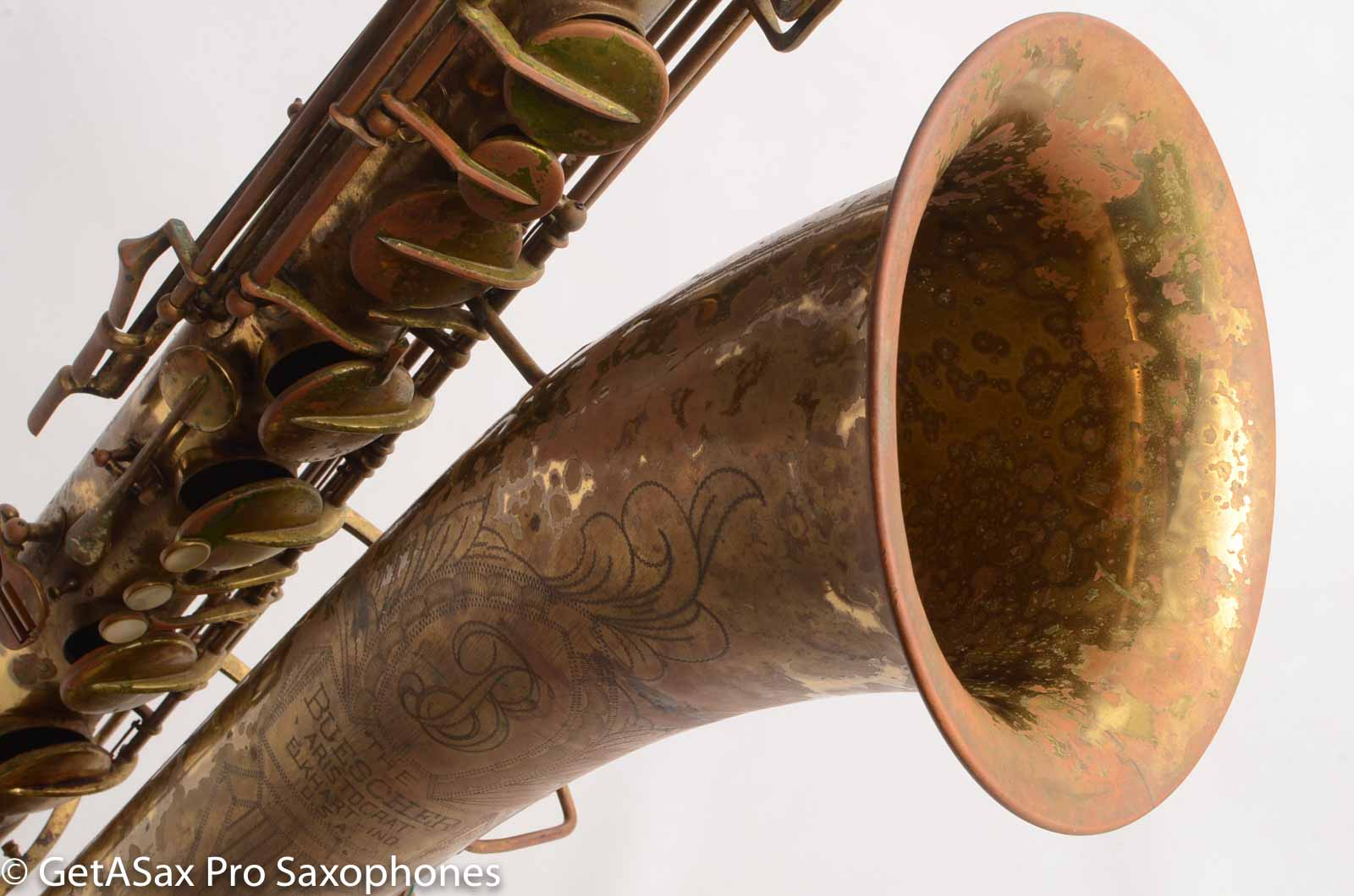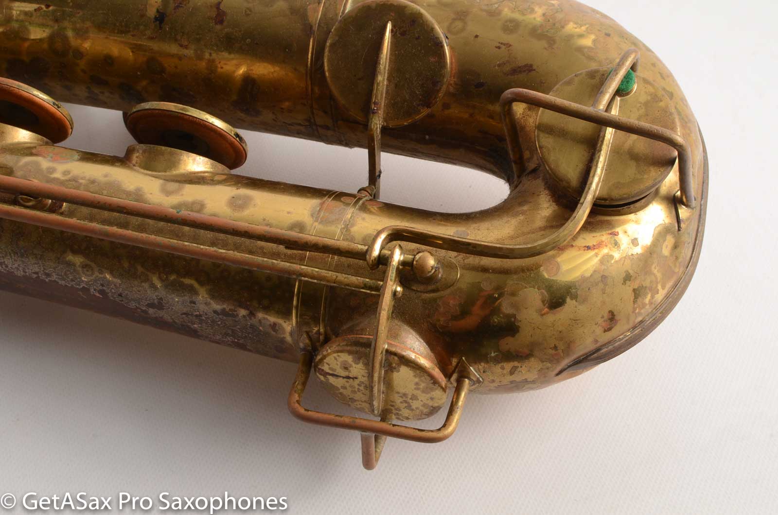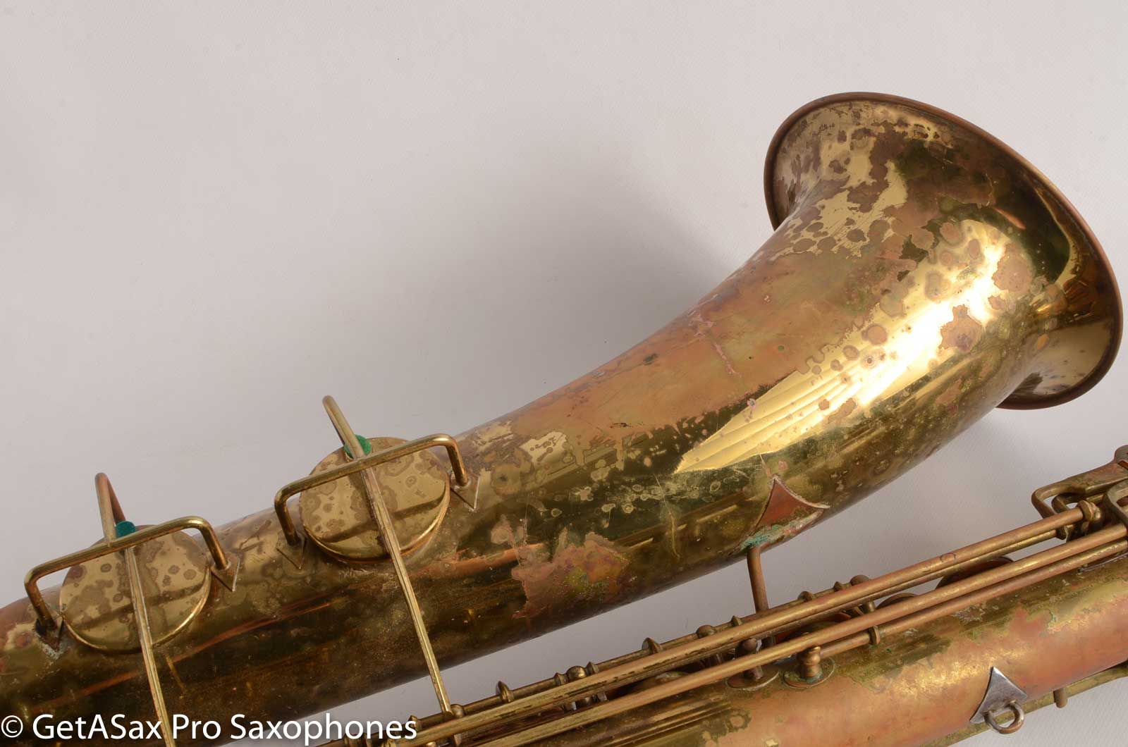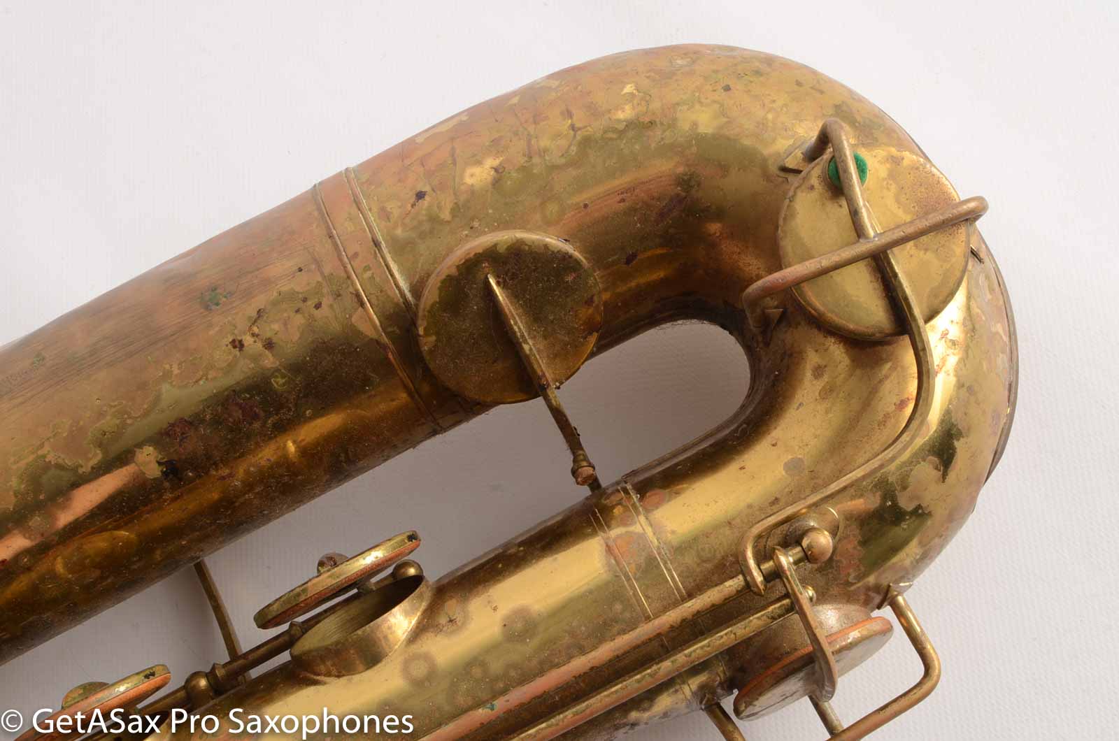 This Model 129 Buescher Big B baritone is in good shape for the price. It has older pads, and plays a bit on them. Original lacquer, resoldered neck receiver and brace. Check the photos for dents, dings, and other resolders. The tone is beautiful on this Bari, and for the price. it would be hard to beat. This Buescher Big B baritone is great fun to play. It has a big, warm tone with excellent intonation. Feel free to ask more questions on this one about condition. I can do a detailed in-hand description if you want.
