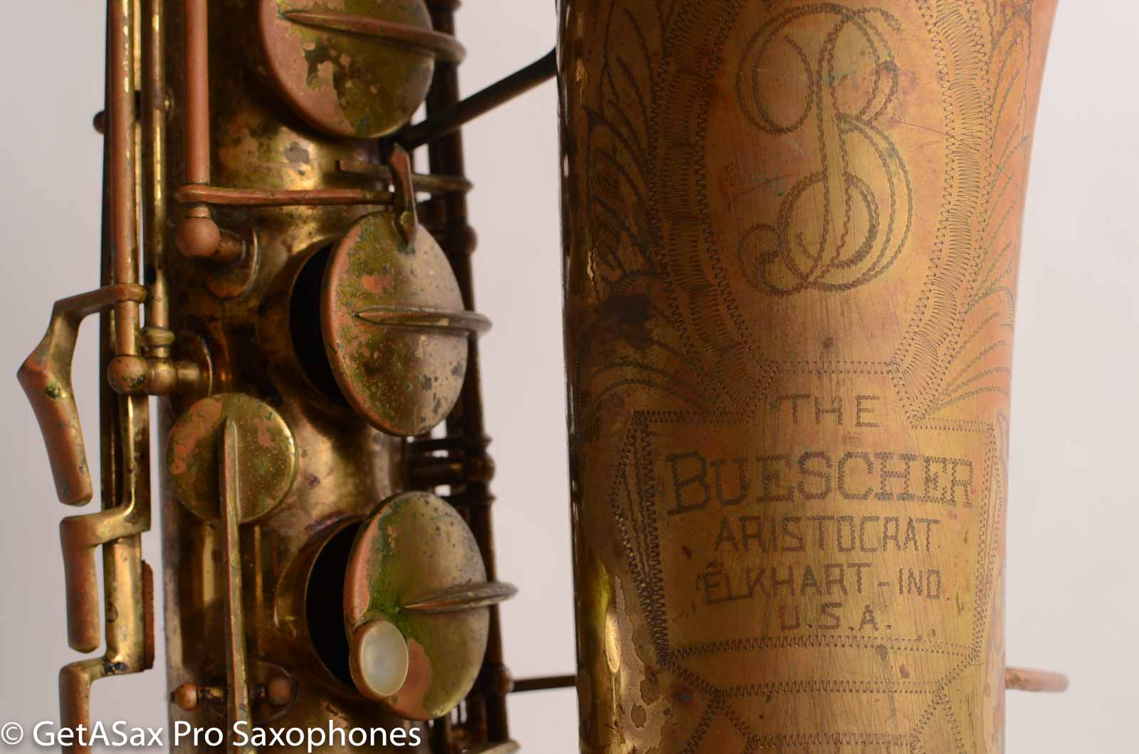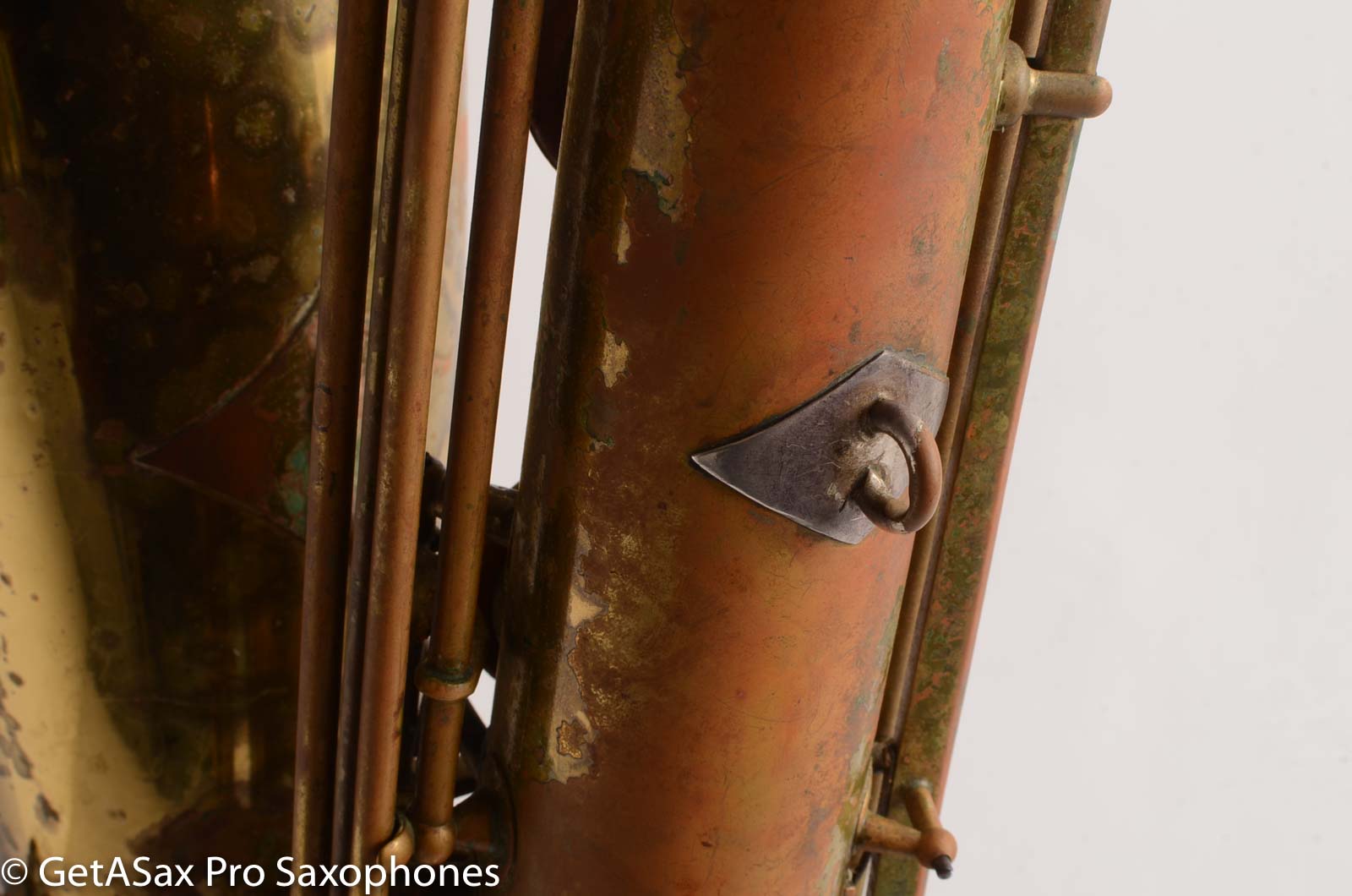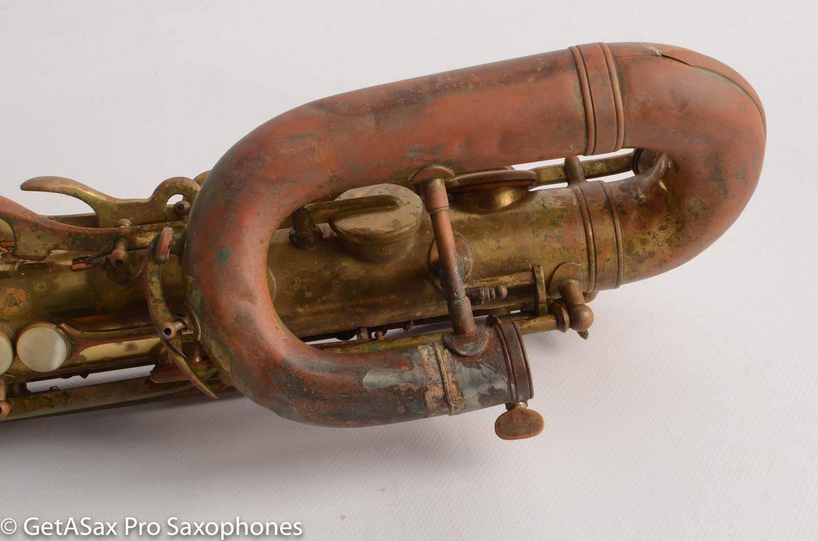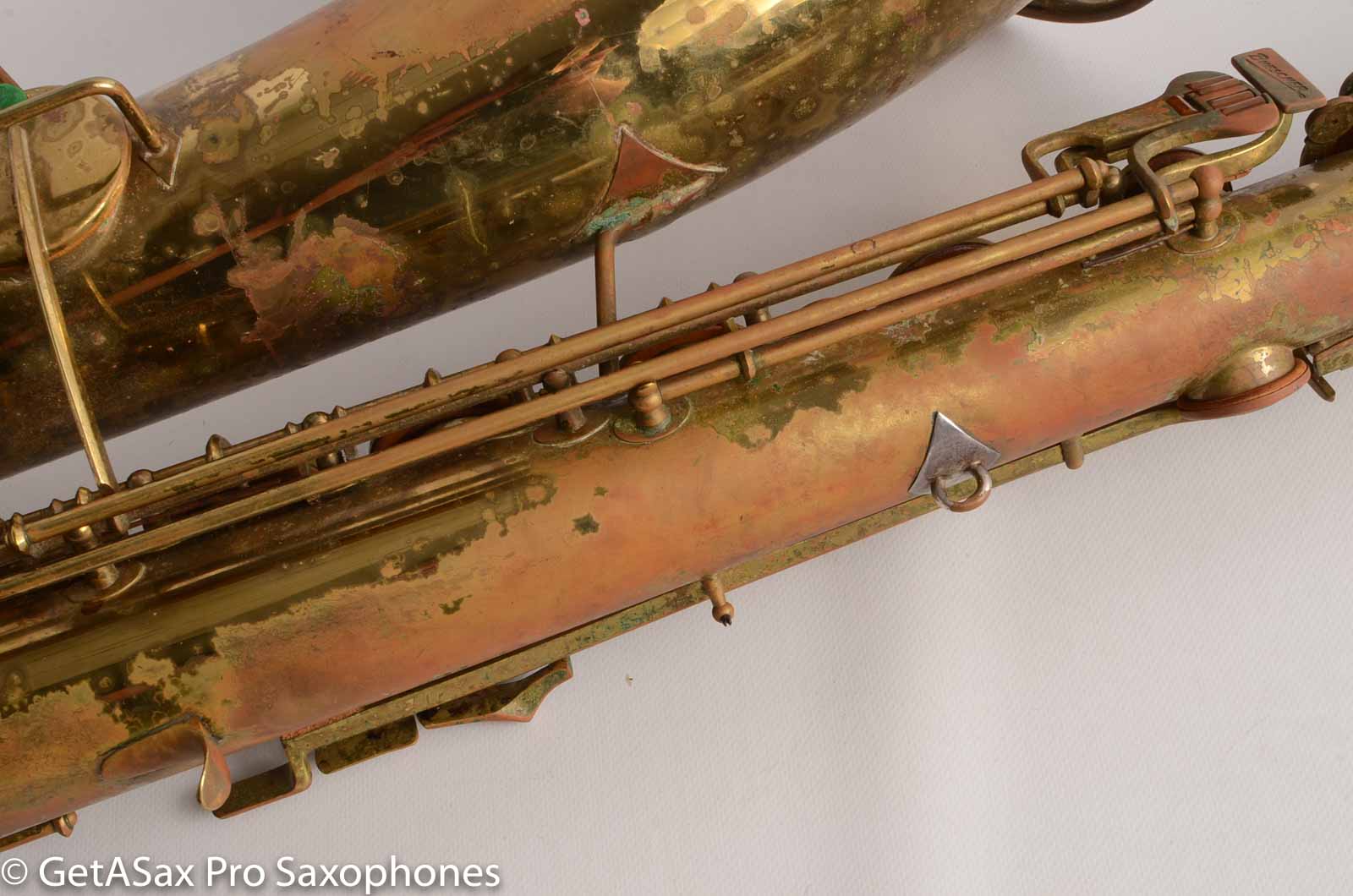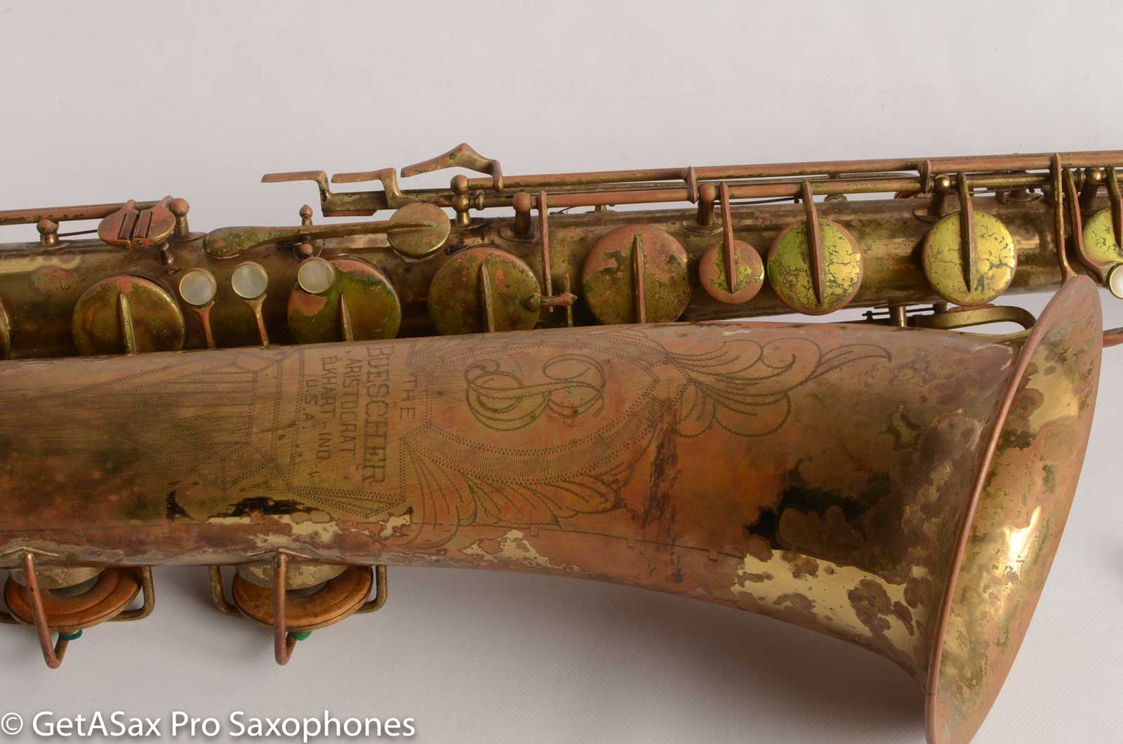 This Model 129 Buescher Big B baritone is in good shape for the price. It has older pads, and plays a bit on them. Original lacquer, resoldered neck receiver and brace. Check the photos for dents, dings, and other resolders. The tone is beautiful on this Bari, and for the price. it would be hard to beat. This Buescher Big B baritone is great fun to play. It has a big, warm tone with excellent intonation. Feel free to ask more questions on this one about condition. I can do a detailed in-hand description if you want.