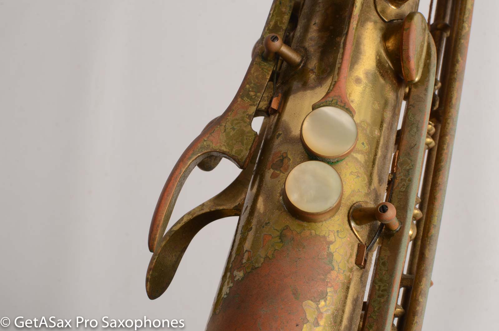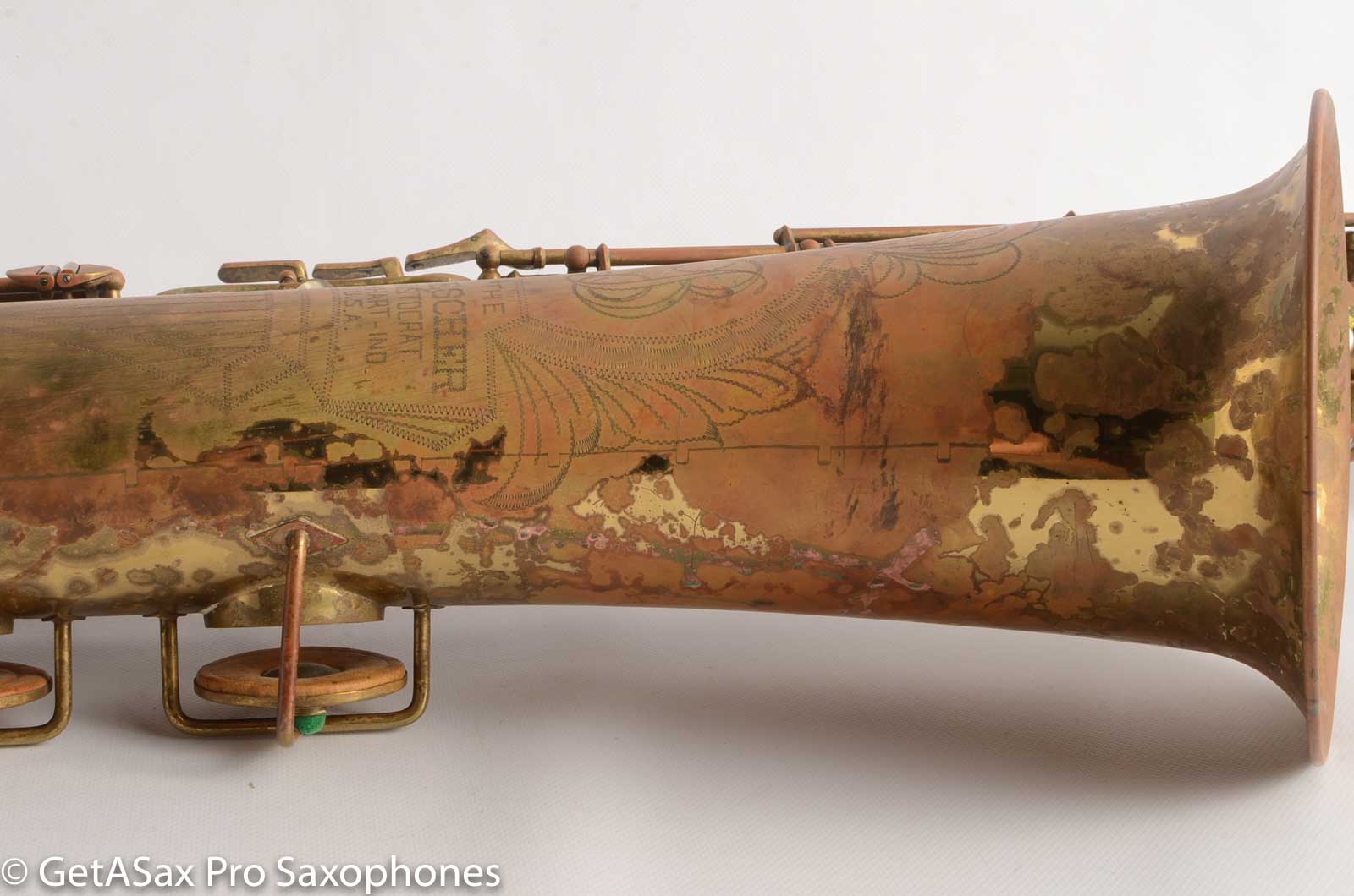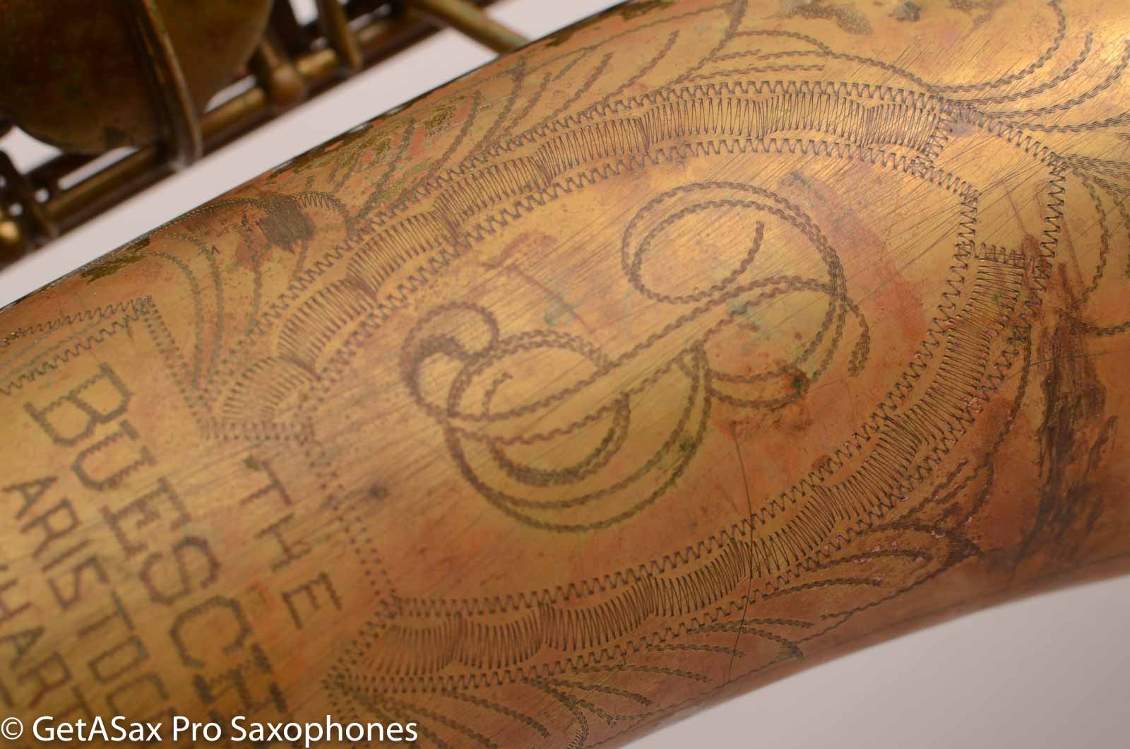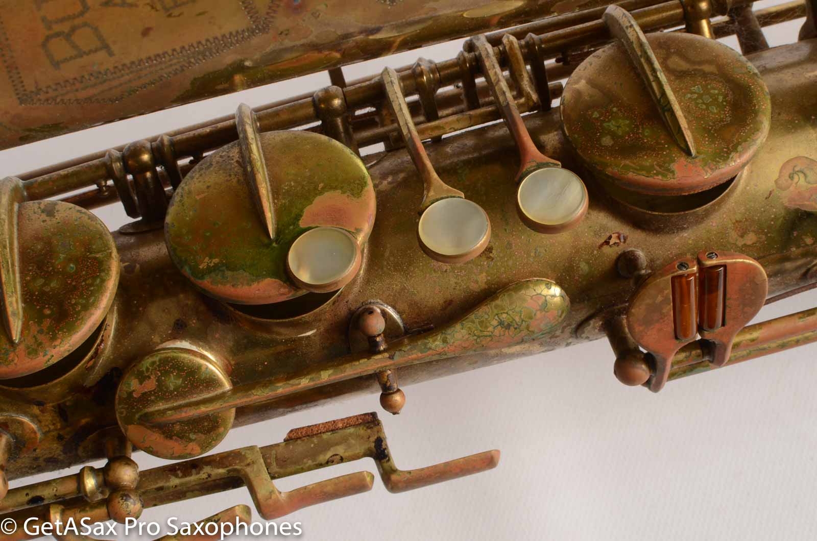 This Model 129 Buescher Big B baritone is in good shape for the price. It has older pads, and plays a bit on them. Original lacquer, resoldered neck receiver and brace. Check the photos for dents, dings, and other resolders. The tone is beautiful on this Bari, and for the price. it would be hard to beat. This Buescher Big B baritone is great fun to play. It has a big, warm tone with excellent intonation. Feel free to ask more questions on this one about condition. I can do a detailed in-hand description if you want.