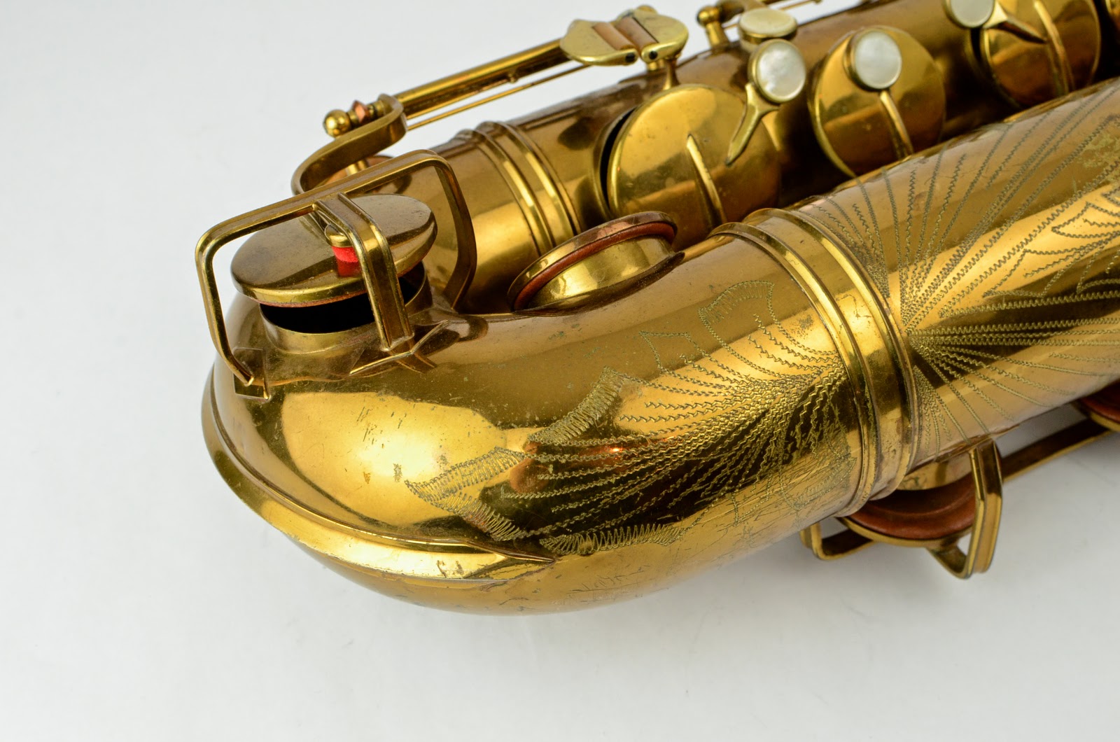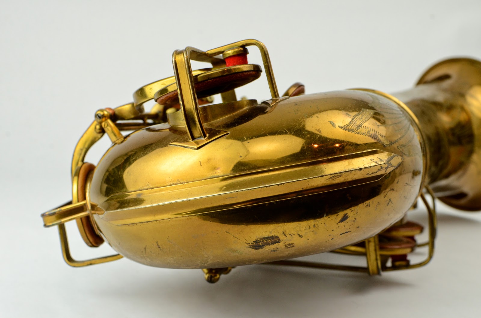 There are currently no dents, but some dents have been removed from the back of the bow, near Eb key guard. The bell flare has had a little bend removed, and you can still barely tell if you look edge on. The neck was also slightly pulled down - about a 2 on a scale of 1 to 10 - and it is now just the right angle and looks great. None of these repairs is anything serious - just run of the mill for a vintage saxophone, and everything is now as it should be.