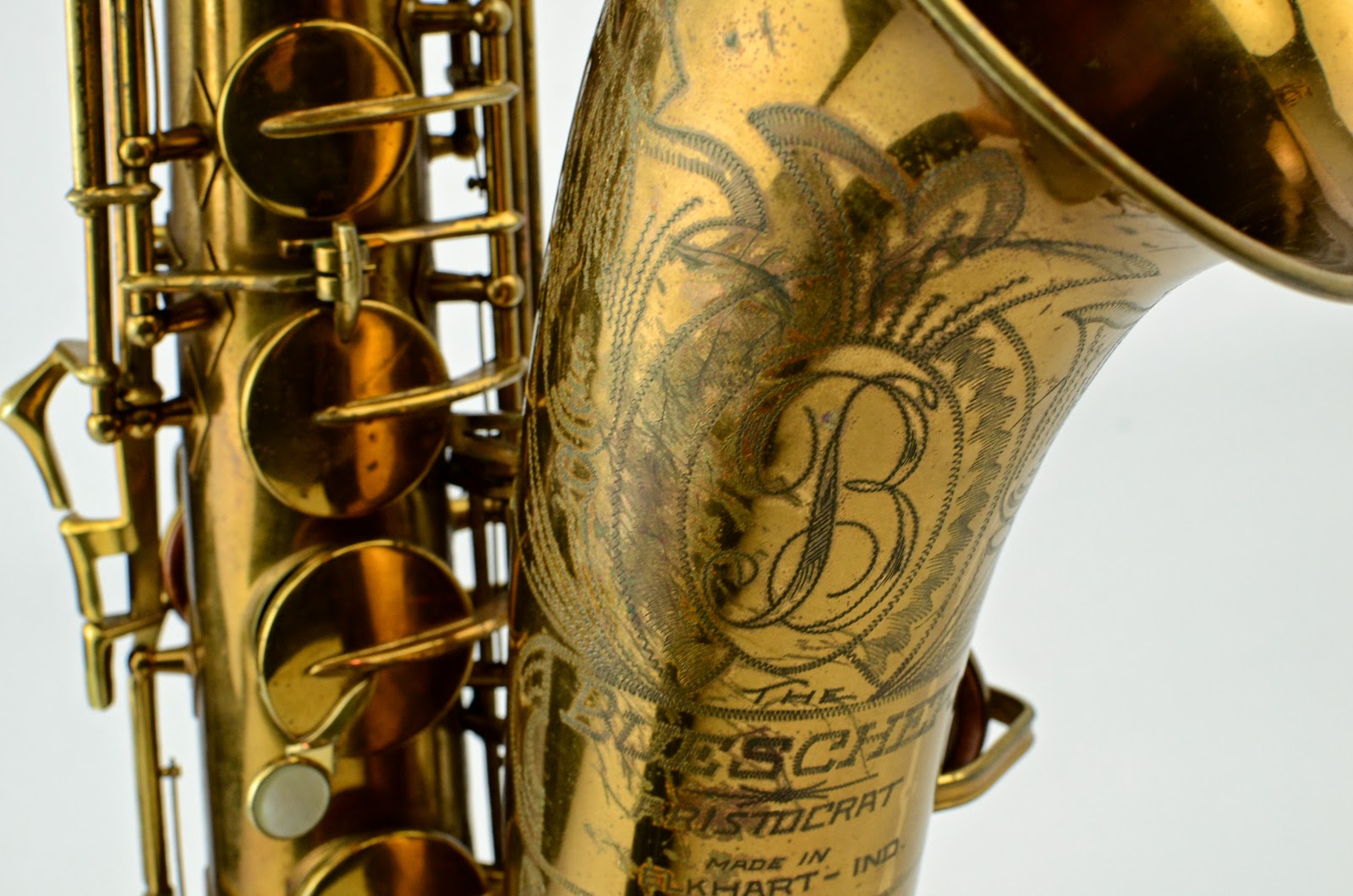 Here is a beautiful, original lacquer Buescher Aristocrat Big B tenor with small bell. It has a fresh top-quality full overhaul/restoration, and retains its original snap in pads and gold Norton springs! The lacquer is a beautiful golden honey color, and this is some of the best looking engraving of any vintage saxophone in my opinion. This horn sports the desirable smaller bell that only a subset of Big B tenors have. These horns are among the best American tenors ever made and were billed as a jazzier alternative to the 400 "Top Hat and Cane" line. These are excellent, professional tenors that are highly prized for their big complex tone, good build quality, excellent intonation, and all around satisfying playing experience.