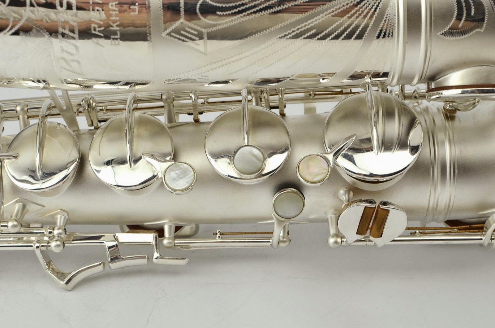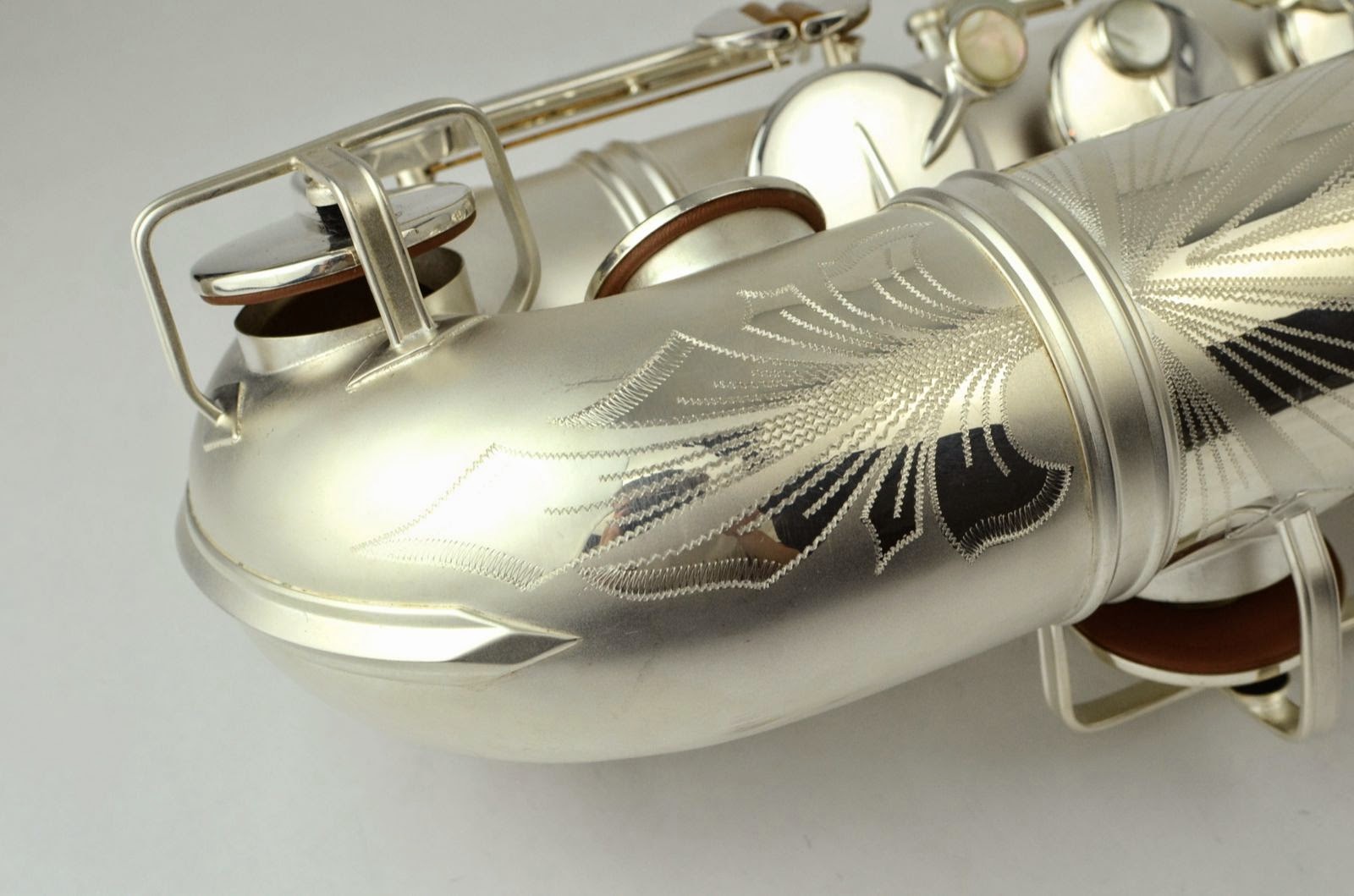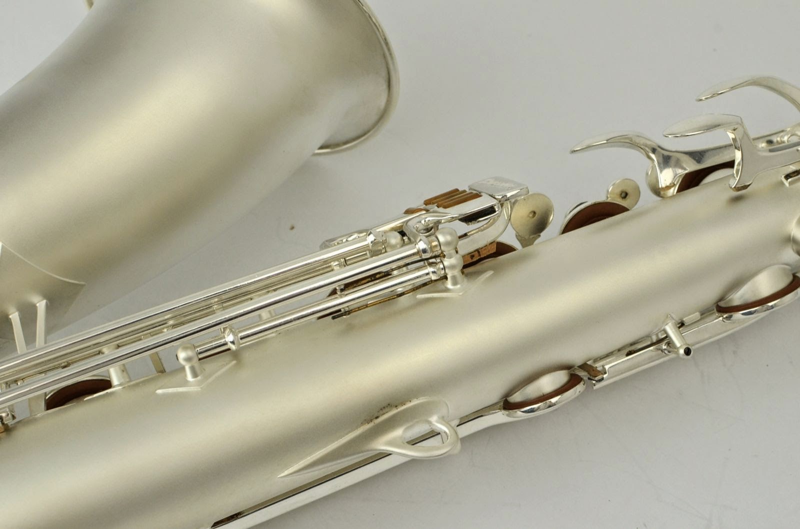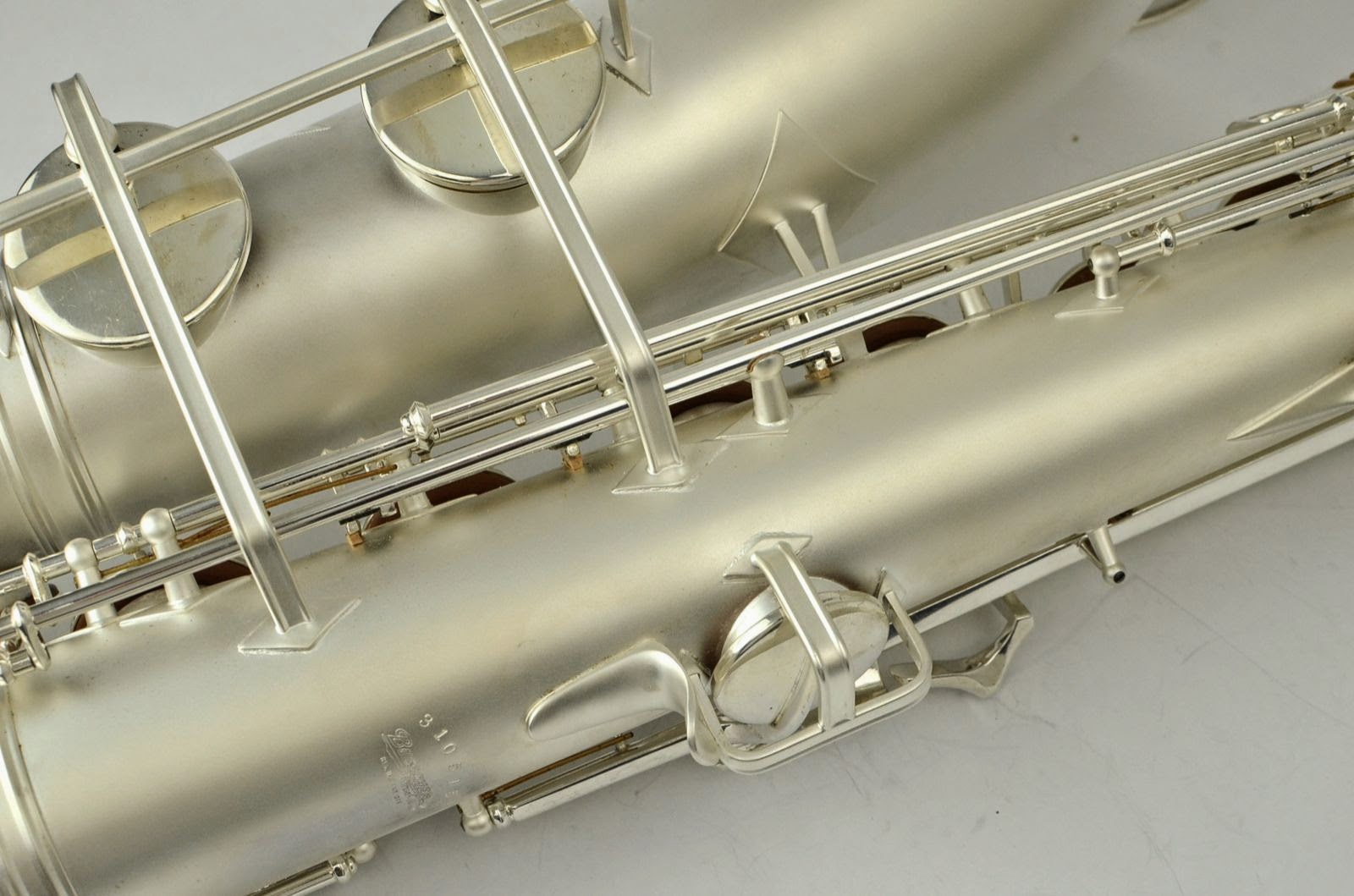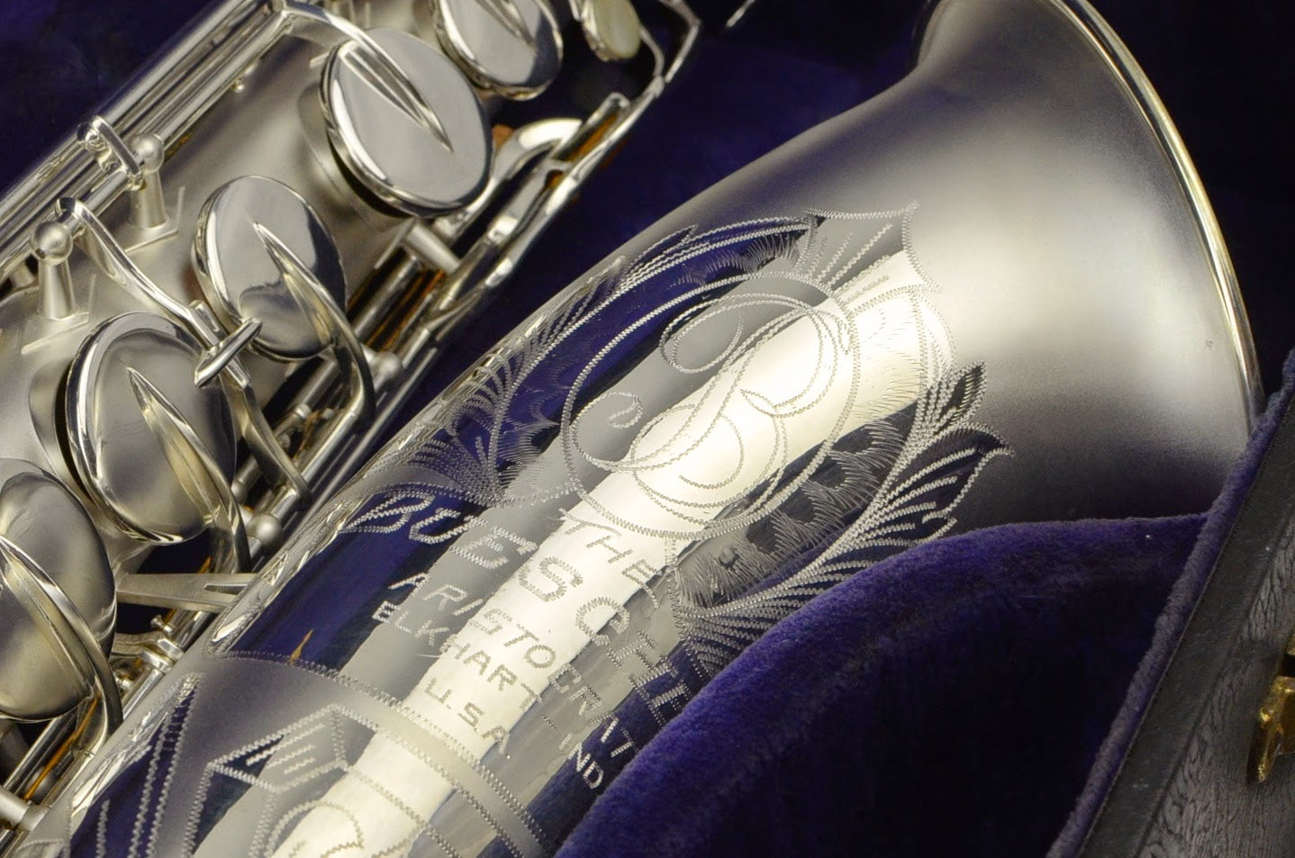 This is a beautiful freshly overhauled Big B tenor with small bell and gold wash. It was carefully re-plated, probably by Anderson Plating in Indiana sometime recently. It just got a fresh, high-end full overhaul by Aaron Barnard, who is one of the best techs in the USA. It's definitely a pretty saxophone, with gorgeous engraving and a dark gold wash in the bell. It sports the desirable smaller bell that only a subset of Big B tenors have. These horns are among the best American tenors ever made and were billed as a jazzier alternative to the 400 "Top Hat and Cane" line. These are excellent, professional tenors that are highly prized for their big complex tone, good build quality, excellent intonation, and all around satisfying playing experience.