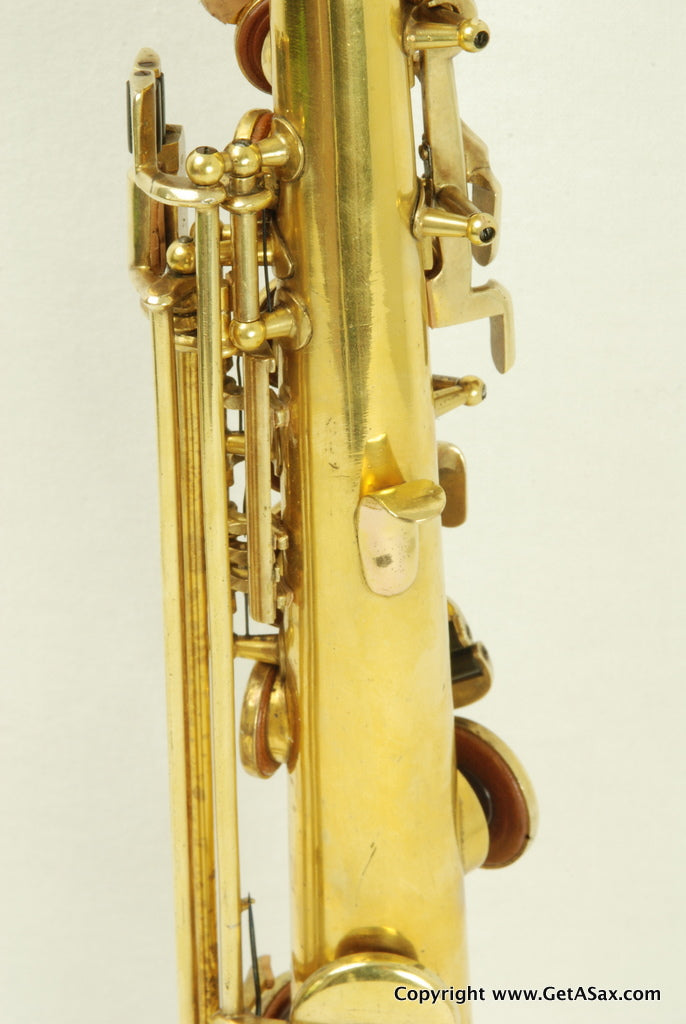 This is the best playing model sopranino ever made, with the best tone and with excellent intonation (for a 'nino). It is also extremely rare in gold plate and very beautiful. The gold plate is around 98% on this horn, and the only blemish is some scuffing behind the lip of the bell where a number had been engraved at some point. There are no past repairs on this horn. There was a tiny ding removed under the mouthpiece cork and it was repaired well.