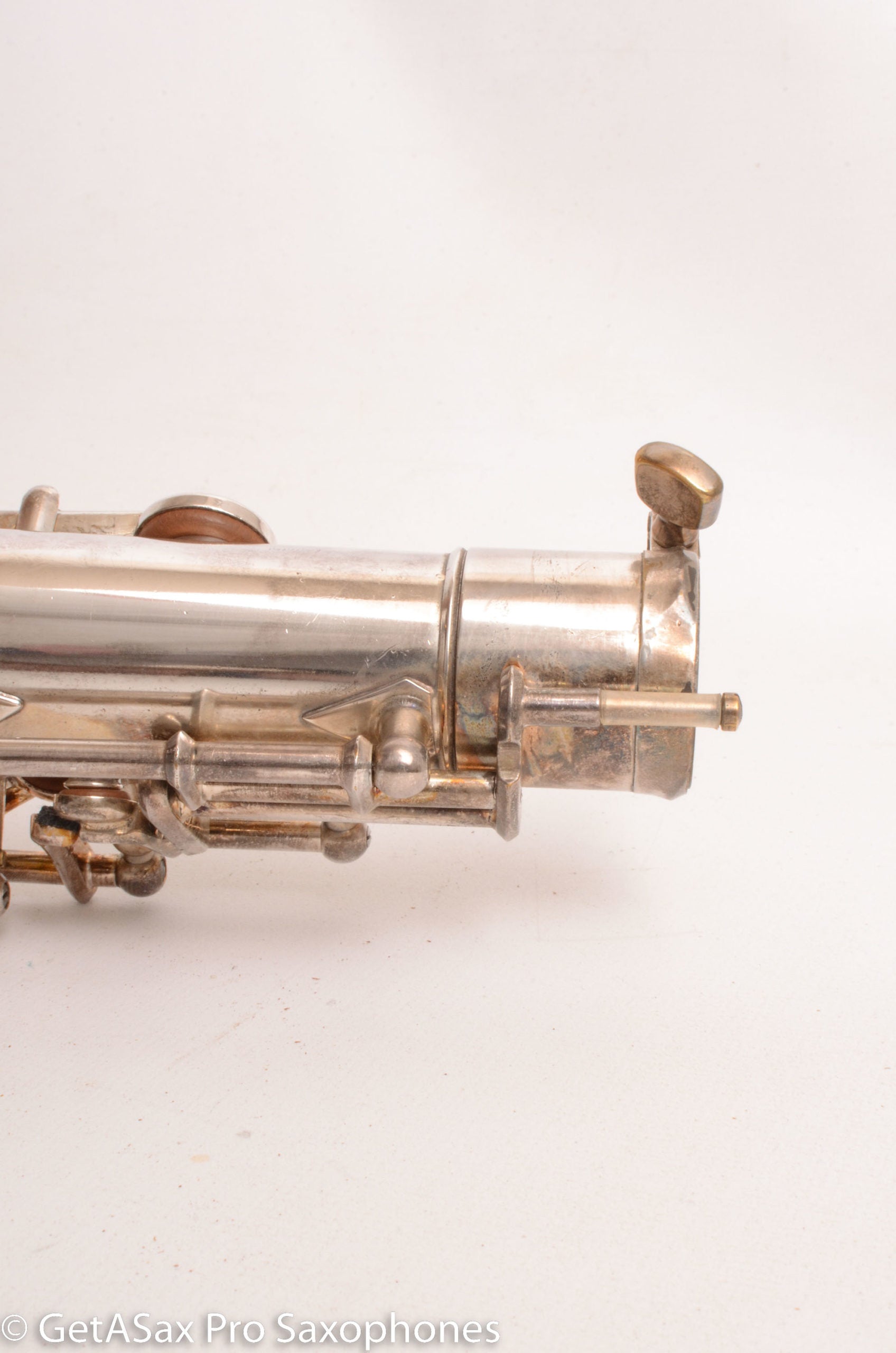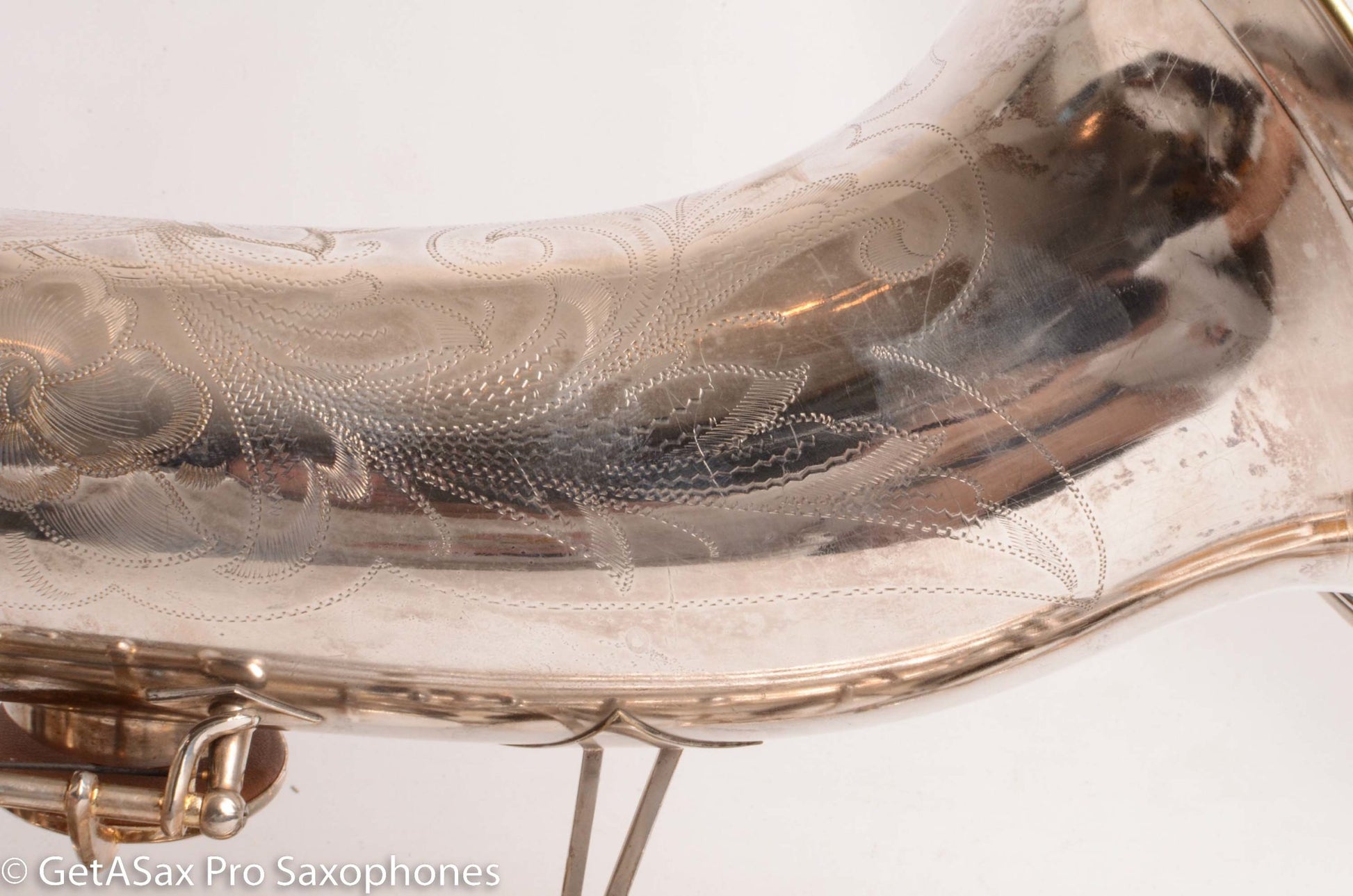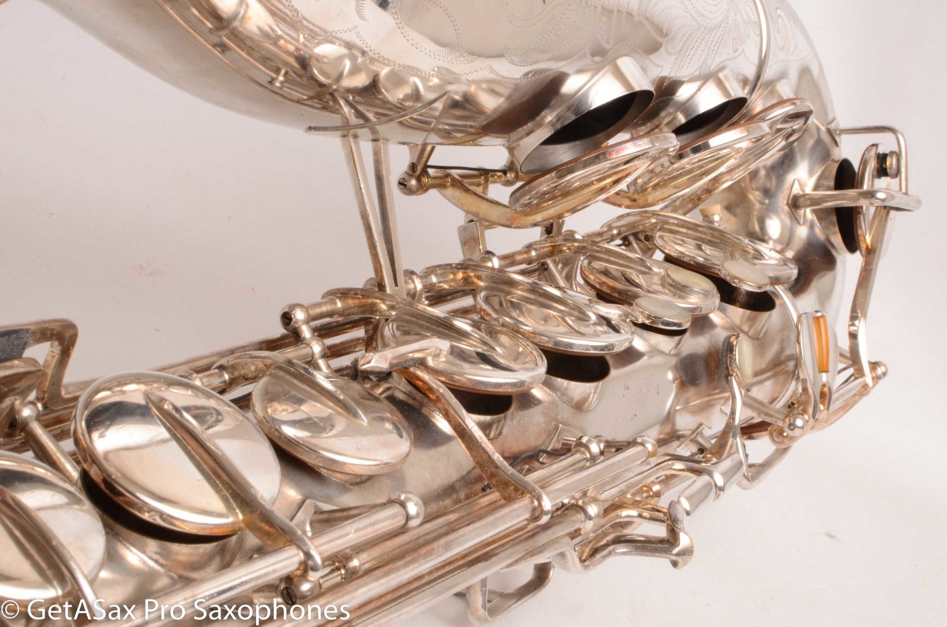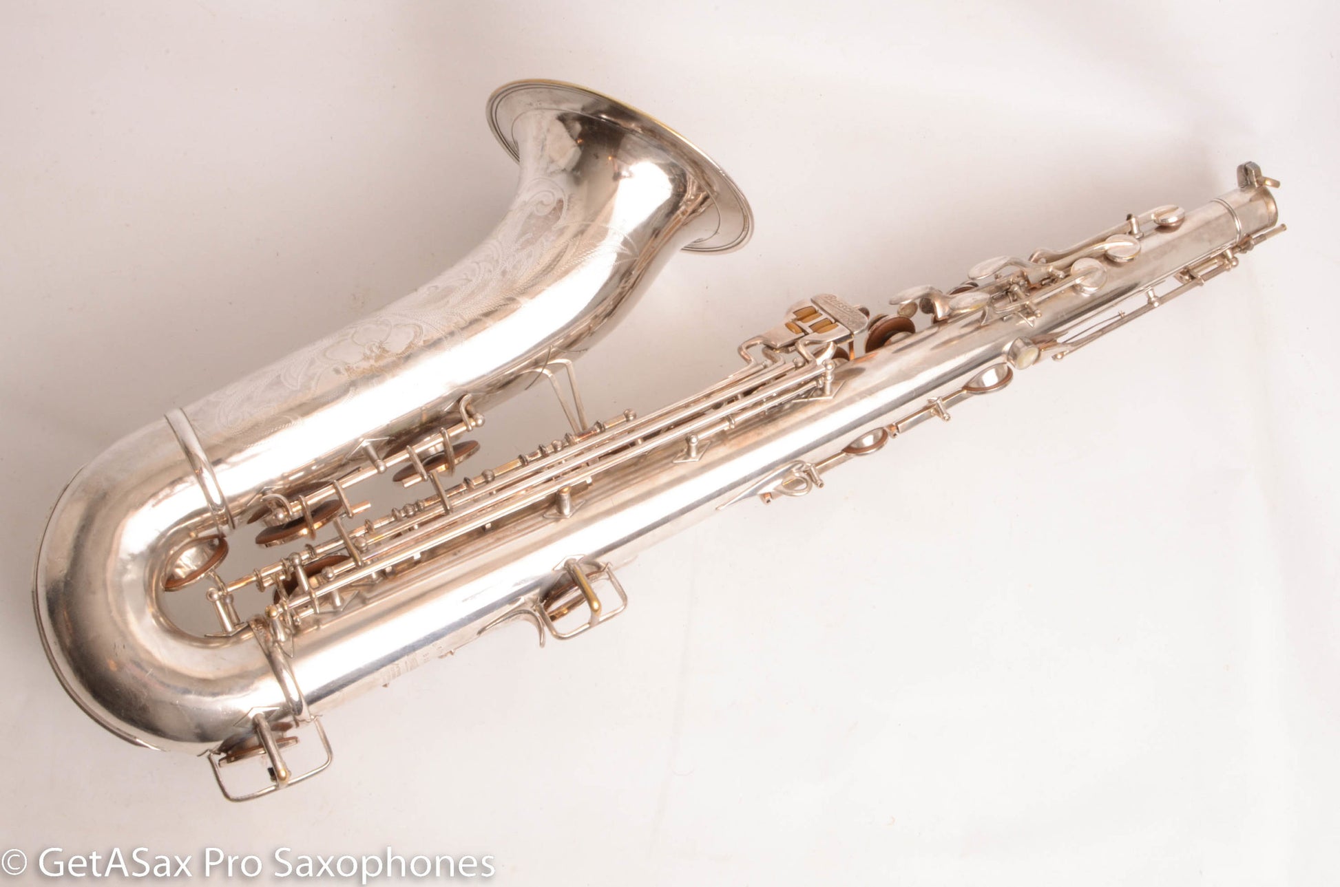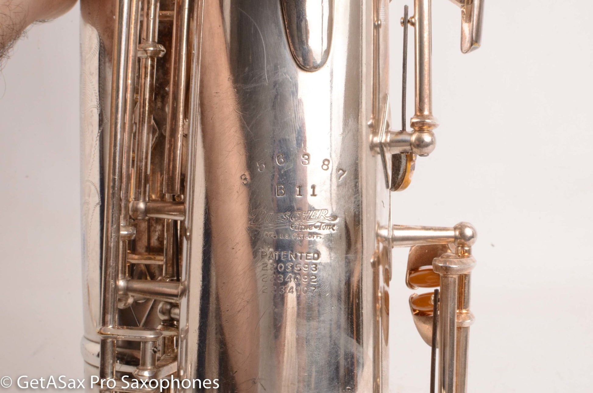 This is a 1955 Buescher Top Hat and Cane tenor saxophone in original silver plate finish. It’s hard to overemphasize how rare the tenors are in original silver plate. I have seen three original silver Top hat and cane altos, and one replated silver tenor that started as lacquer. But this is the only original silver one I’ve ever seen! There are probably some others out there, but I doubt that there are very many.