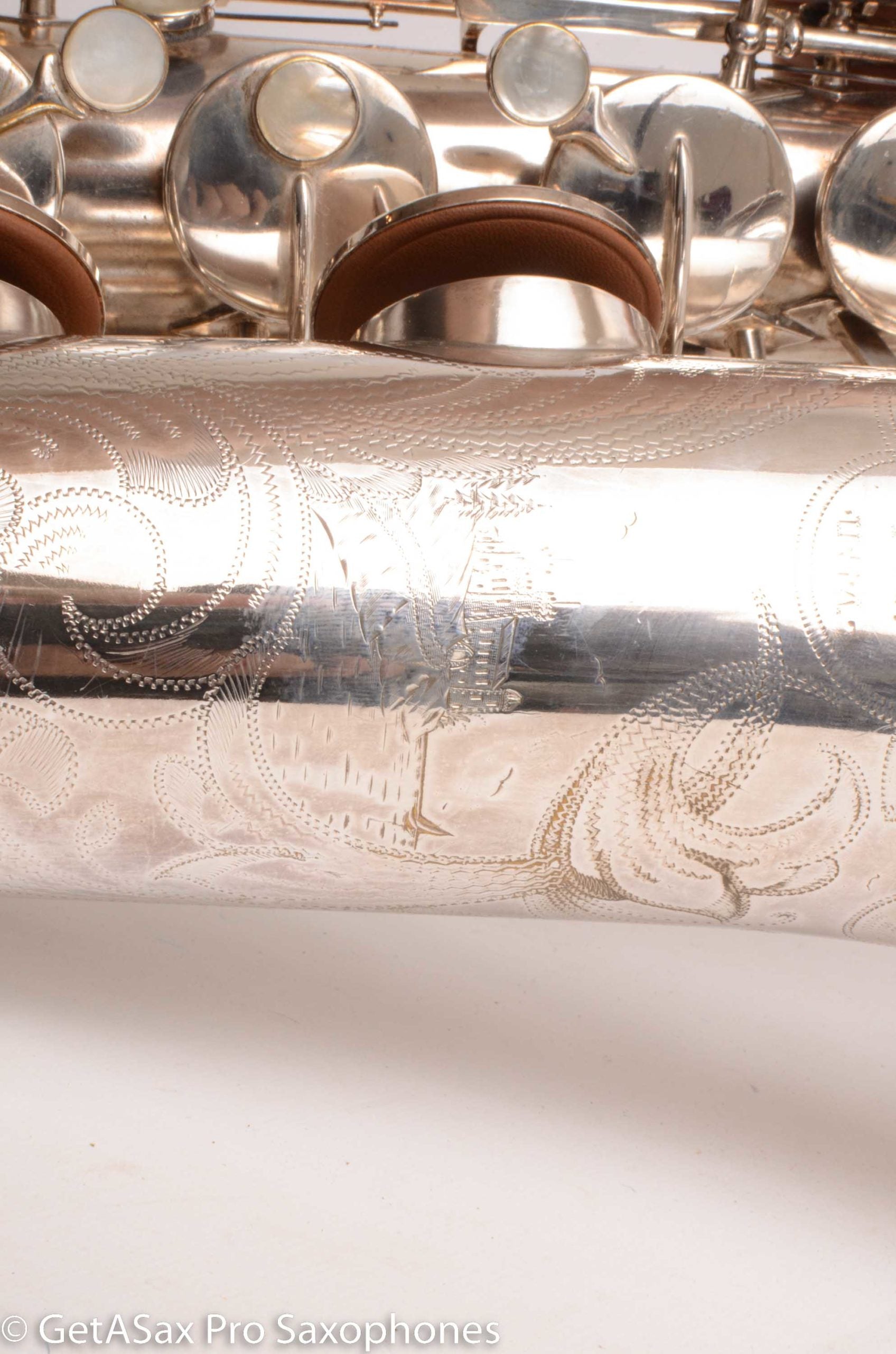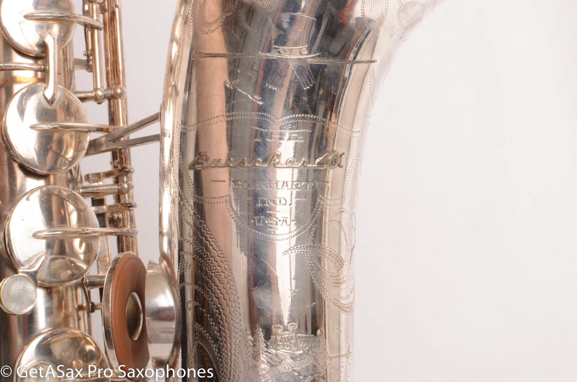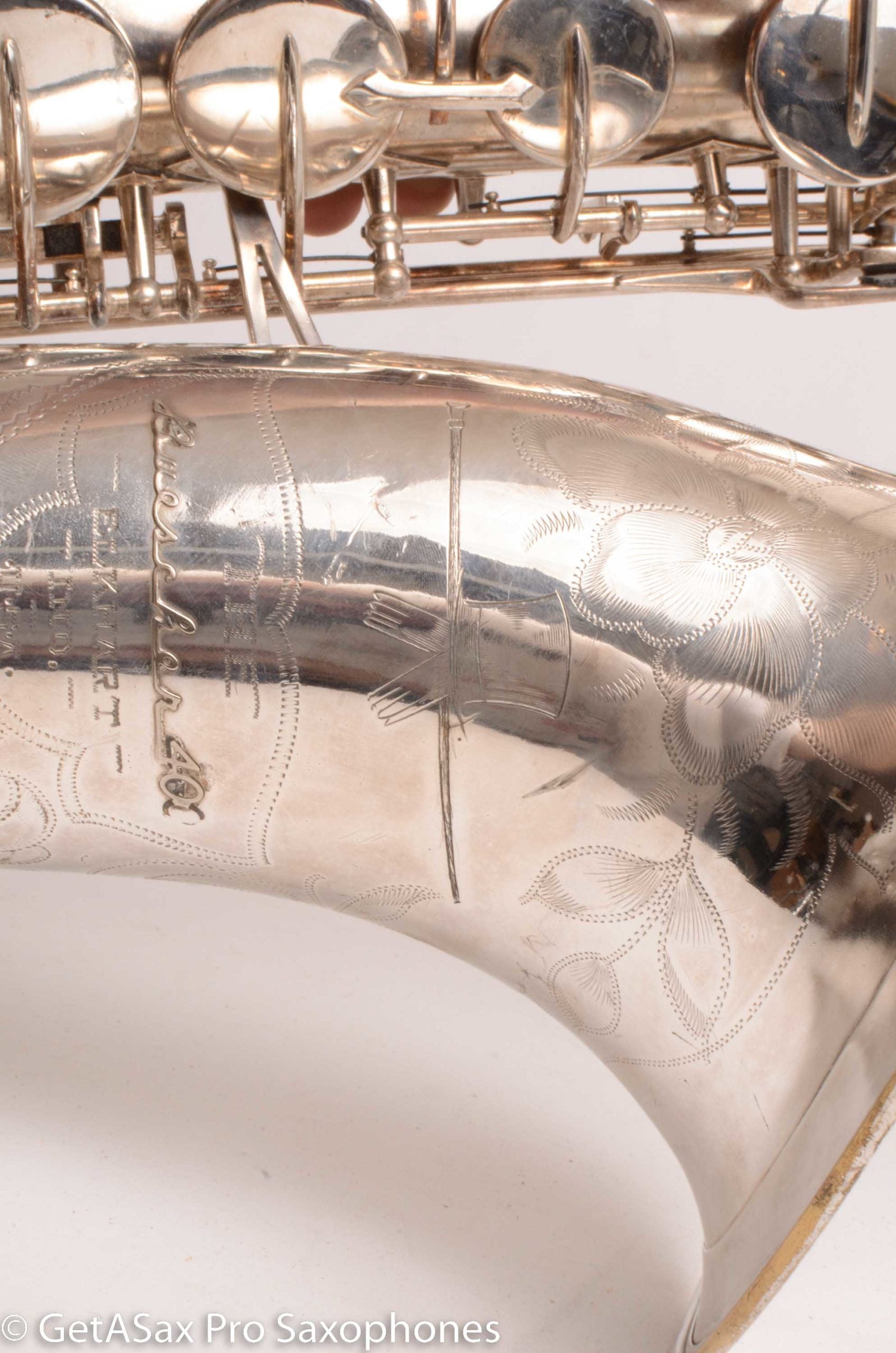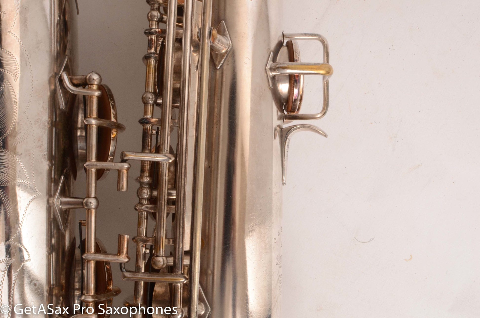 This rare beast also just got a complete overhaul done, and it has all new pads and is totally ready to go for the long-term, right out of the case. You’d be hard pressed to find a nicer example of a Buescher Top Hat and Cane tenor anywhere! I’ve seen a few nice original lacquer examples in recent years, and they sold for basically this price minus the overhaul cost, which means you’re getting the rare silver plate finish for not much extra money compared to a really clean original lacquer one. Tyler did a video on this horn that you should watch with headphones for the best sense of the sound. To me, it plays with a warm, round tone, with lots of power and excellent intonation. These horns are just REALLY FUN to play. That’s the main reason to buy one. It’s great for almost any type of music from classical to rock. The Top Hat tenors work well with even really bright, high baffle tenor pieces, because the big, warm vintage tone can support that bright mouthpiece without getting brittle. The low register is effortless, as is the altissimo. This is a rare opportunity to add this horn to your collection that is both a top player, and very collectible at the same time. It’s one of the most beautiful vintage saxophones as well.