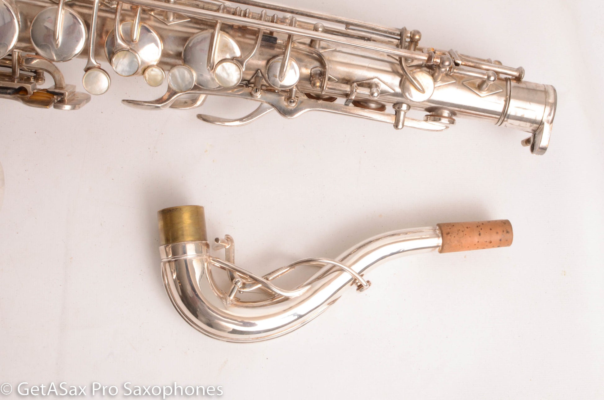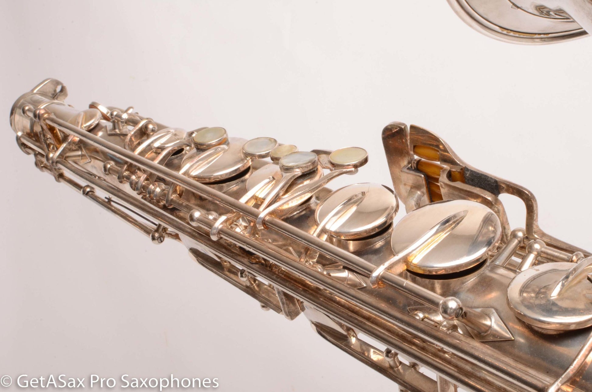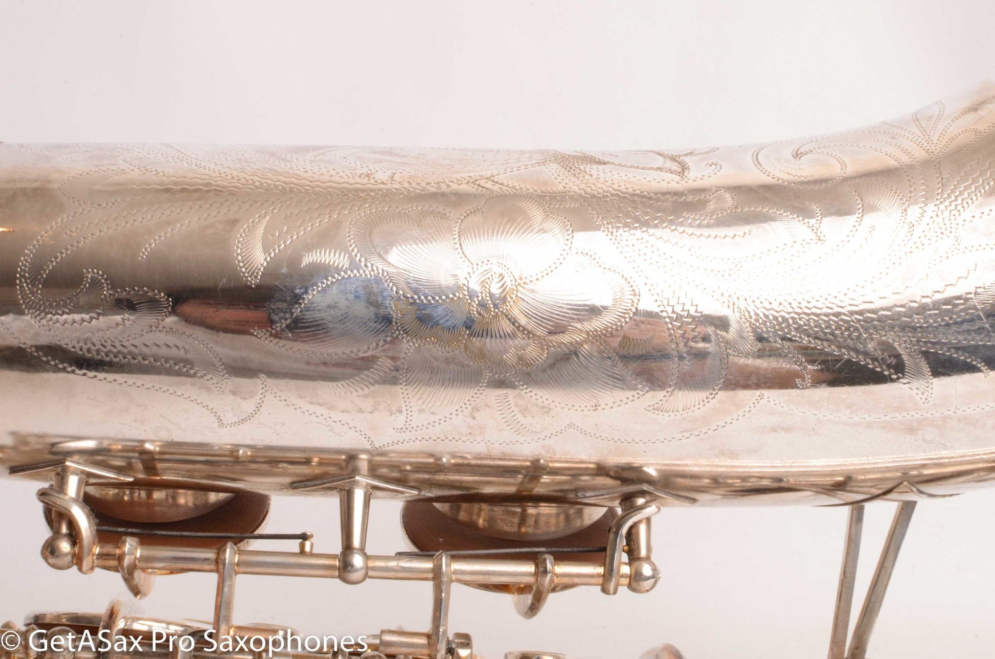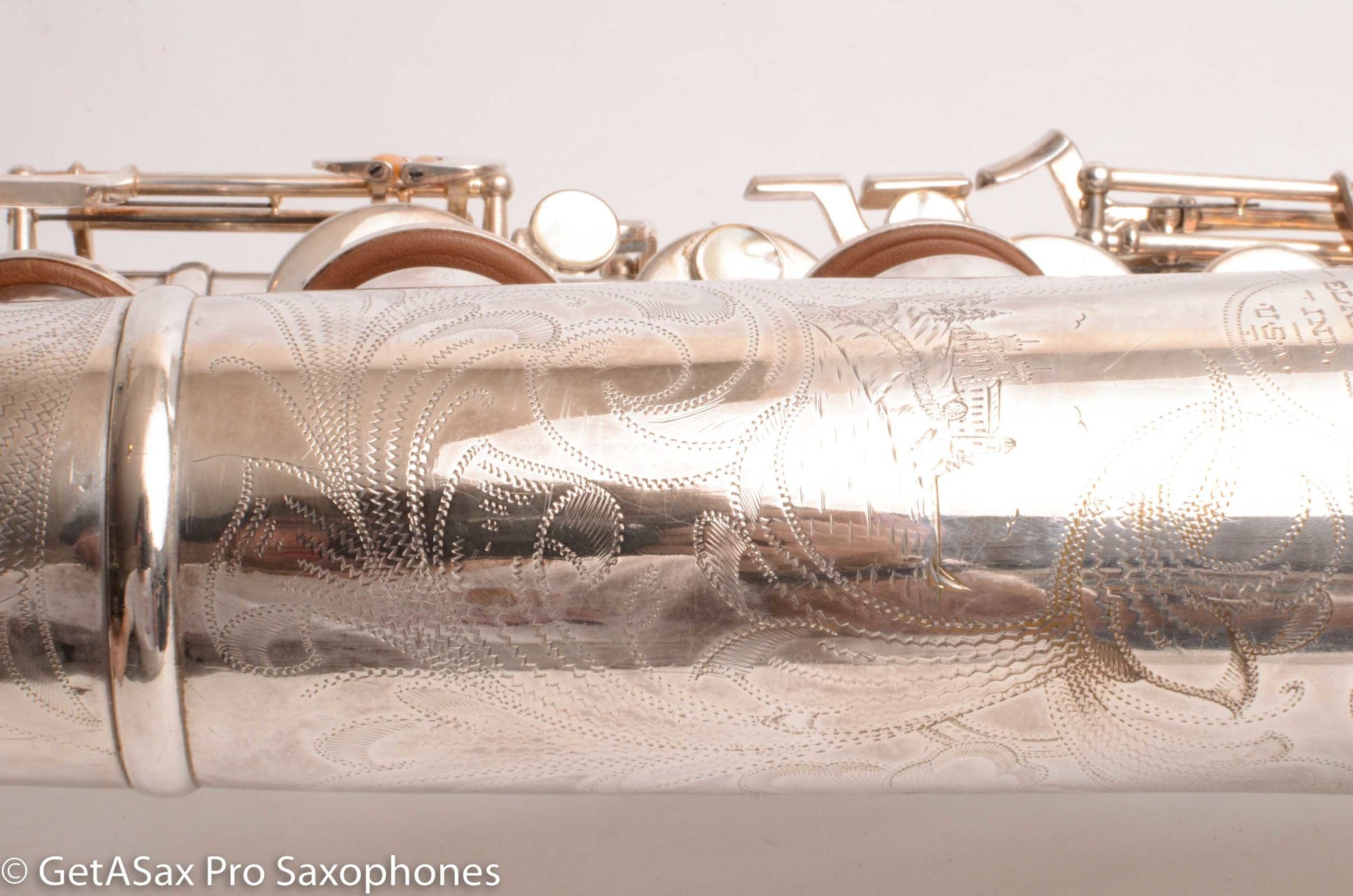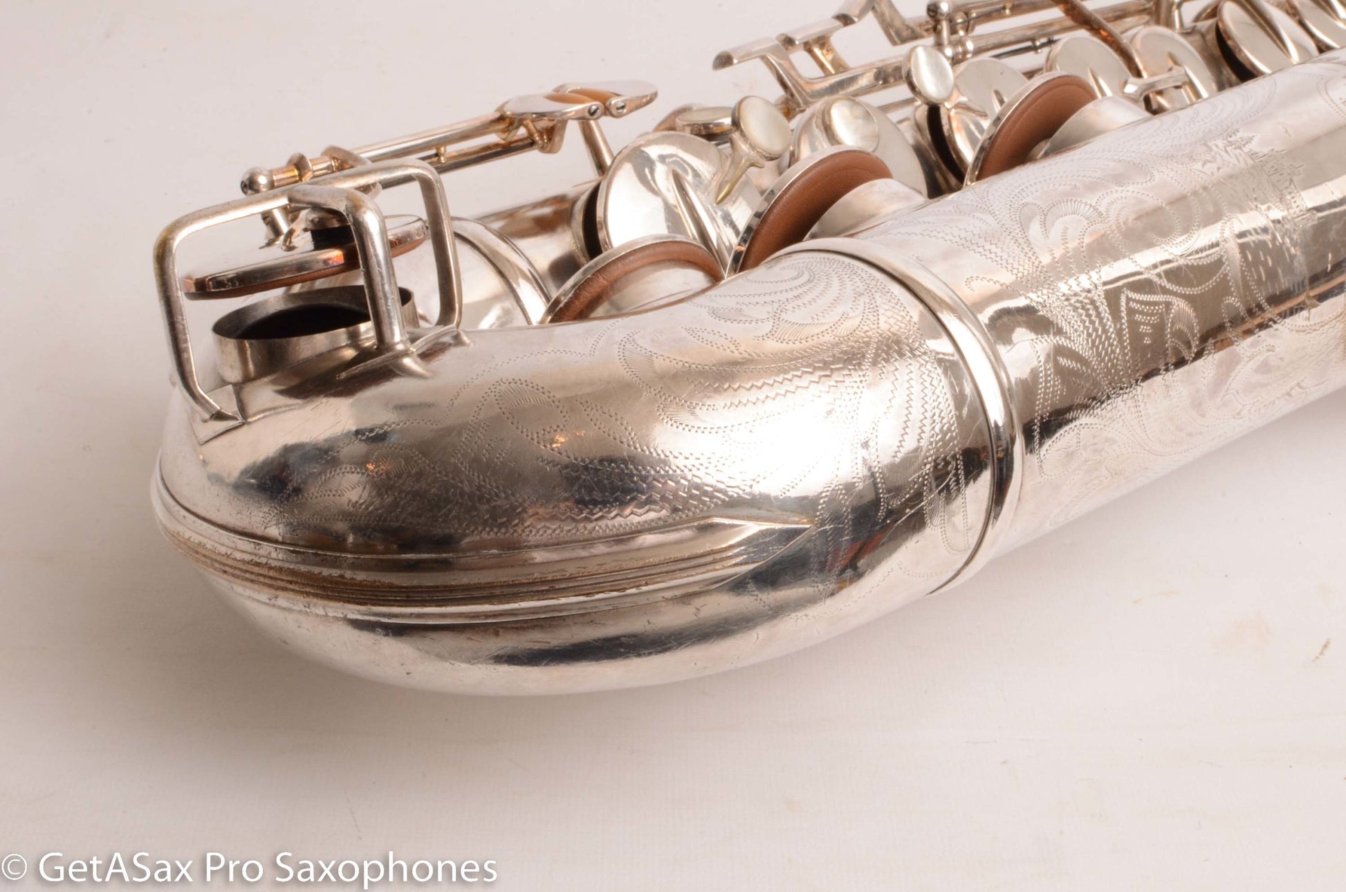 This rare beast also just got a complete overhaul done, and it has all new pads and is totally ready to go for the long-term, right out of the case. You’d be hard pressed to find a nicer example of a Buescher Top Hat and Cane tenor anywhere! I’ve seen a few nice original lacquer examples in recent years, and they sold for basically this price minus the overhaul cost, which means you’re getting the rare silver plate finish for not much extra money compared to a really clean original lacquer one. Tyler did a video on this horn that you should watch with headphones for the best sense of the sound. To me, it plays with a warm, round tone, with lots of power and excellent intonation. These horns are just REALLY FUN to play. That’s the main reason to buy one. It’s great for almost any type of music from classical to rock. The Top Hat tenors work well with even really bright, high baffle tenor pieces, because the big, warm vintage tone can support that bright mouthpiece without getting brittle. The low register is effortless, as is the altissimo. This is a rare opportunity to add this horn to your collection that is both a top player, and very collectible at the same time. It’s one of the most beautiful vintage saxophones as well.