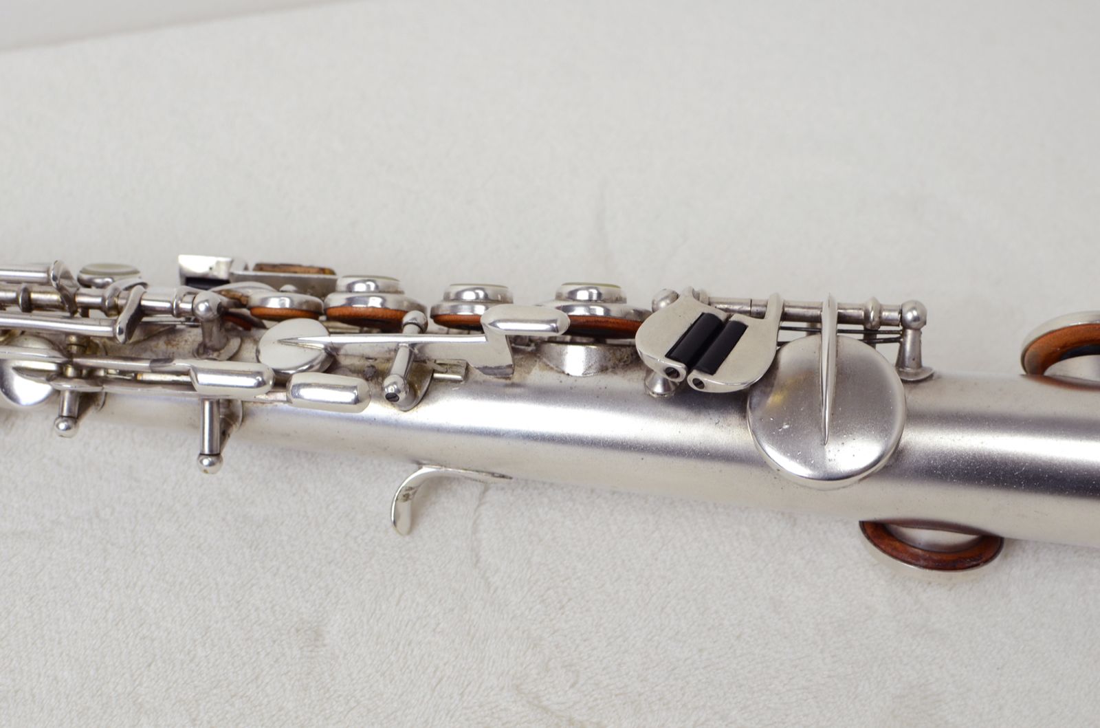 It has old snap-in pads, and it needs new pads, but you can play it enough if you squeeze to get a sense of the tone. The original case is also in great shape to complete this really nice set. The tone on these horns is warm and round and very pleasant, and the intonation is very good for a sopranino. This should be a fun horn to play and nice to listen to as well. You can't say that about every sopranino!