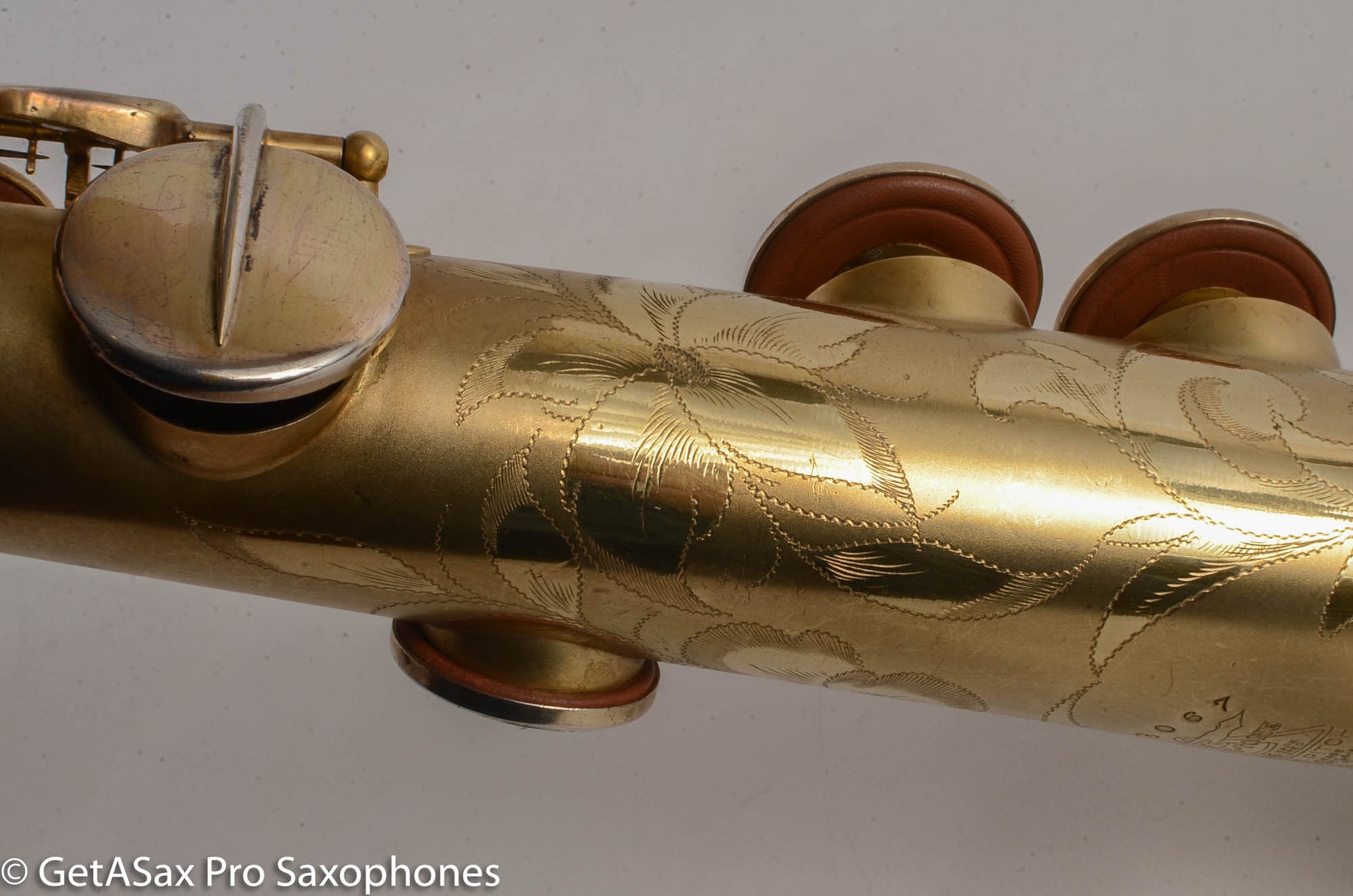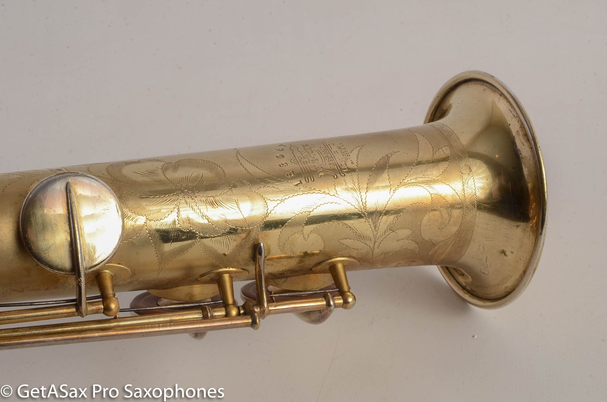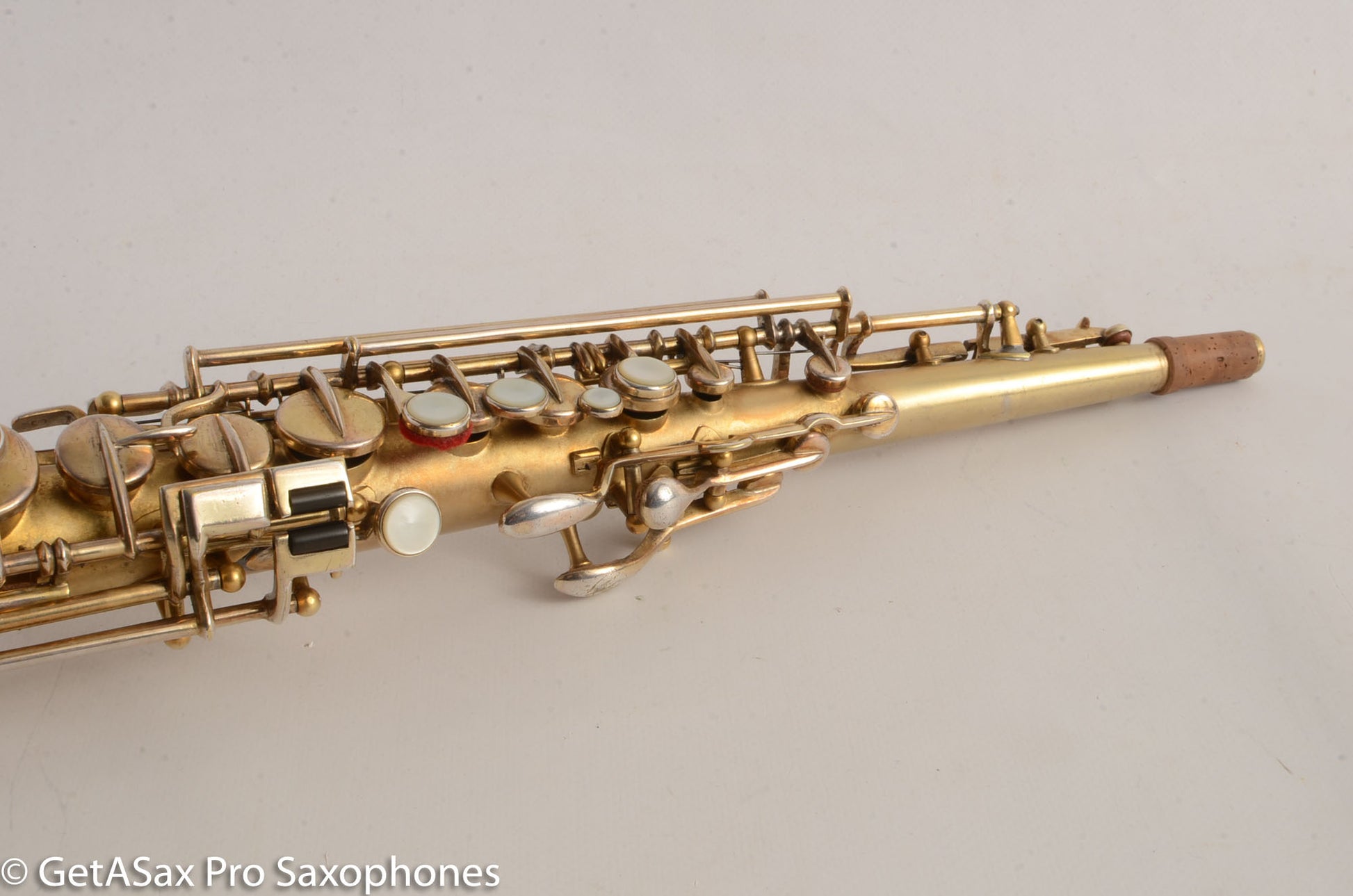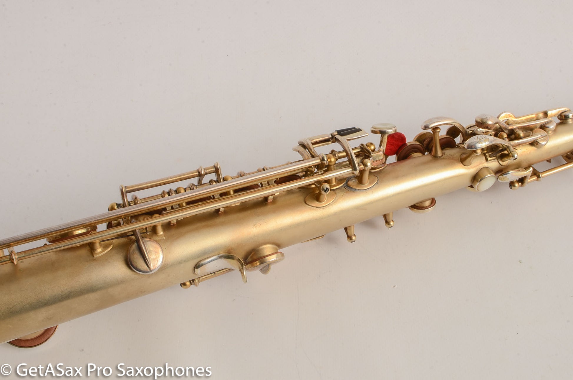 Beautiful original satin gold plate Buescher True Tone soprano saxophone! This is one of the desirable later versions of the True Tone and plays really nicely in tune with a warm, round tone. You won’t go wrong with this soprano. It has a recent overhaul done by one of the best repairmen in Canada and it is in quite good shape. It had a couple of posts resoldered – one at the top of the upper stack and one under the pinky table. These posts always seem to be resoldered on Buescher sopranos. I think they just pop off and have to be stuck back on, on most of these. The gold plate is in great shape. The tone is unlike anything you can buy today – the True Tone is not thin and nasal like a Selmer Mark VI. It’s much more balanced, pleasant, and dare-I-say ‘modern’ sounding! Only one available!