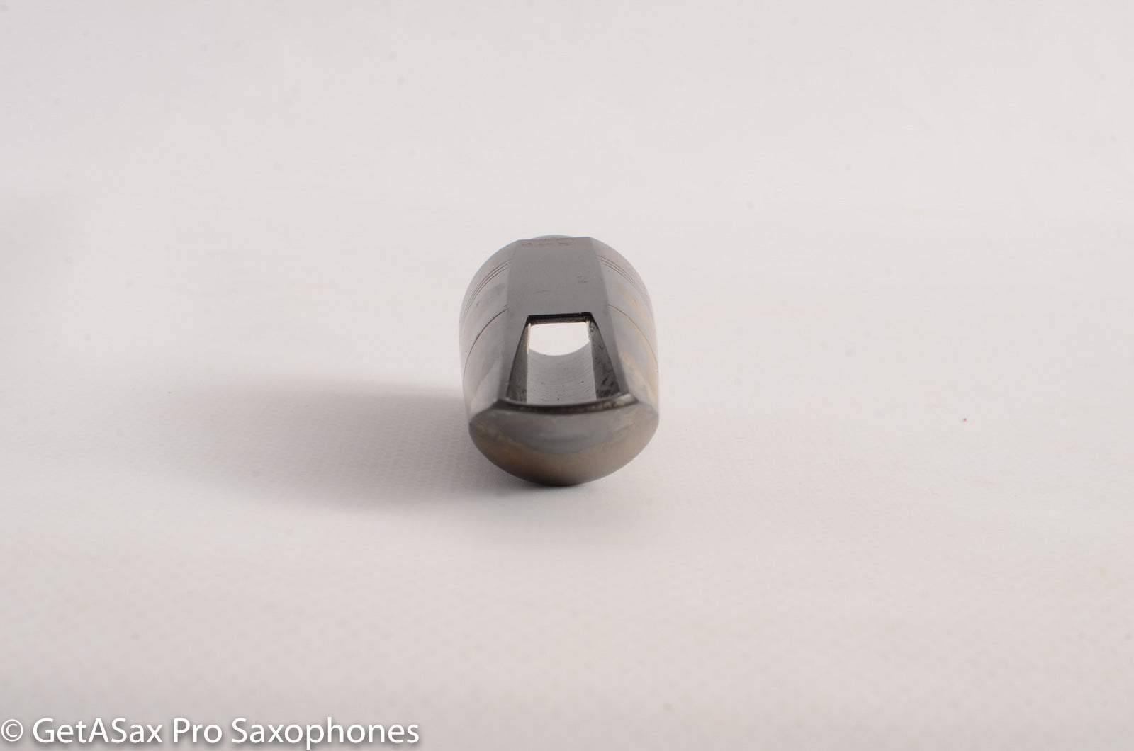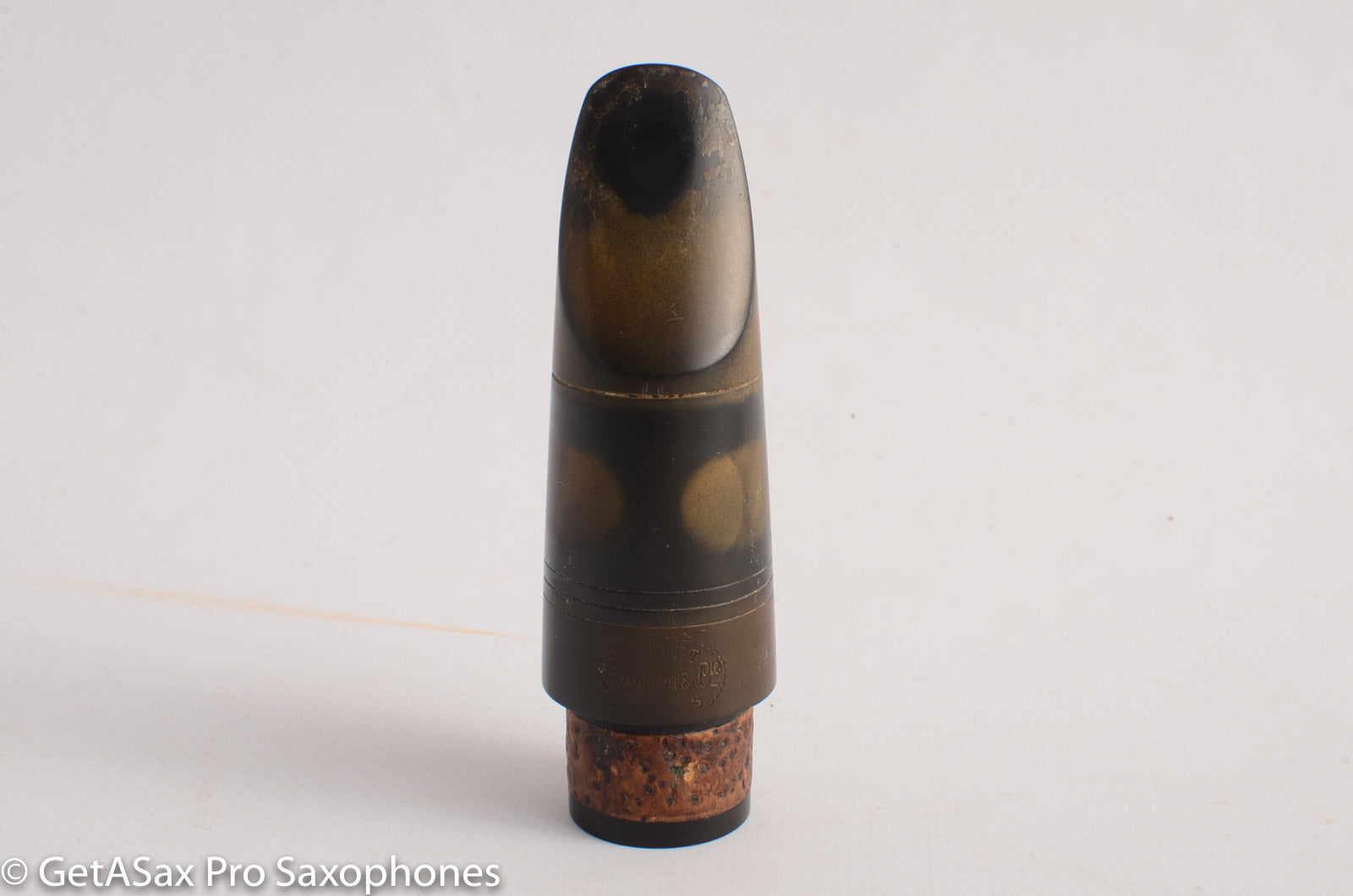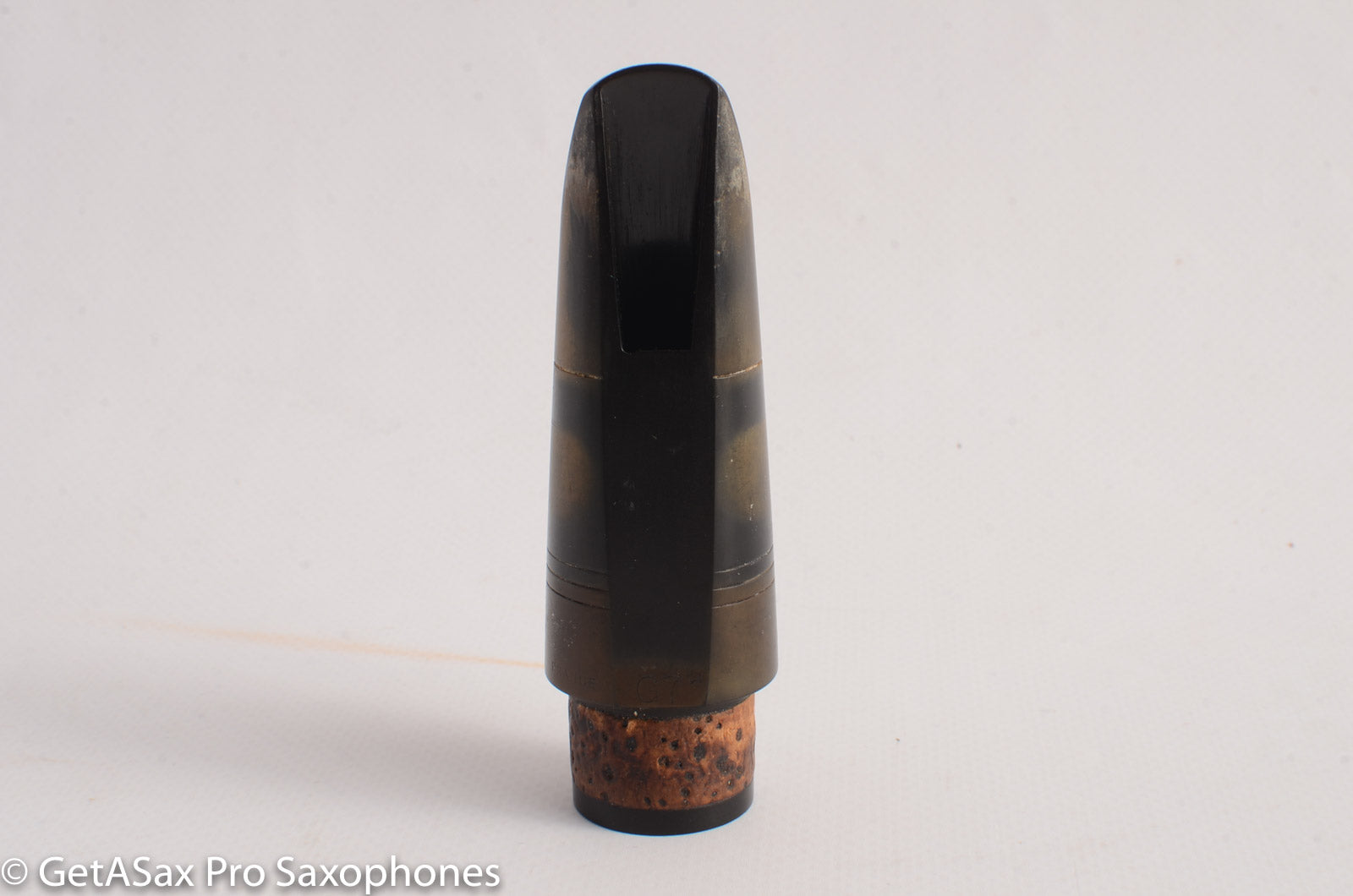 This is a nice old hard rubber clarinet mouthpiece measuring .050" (1.27 mm). From the stamping of the facing on the table, I'm thinking this was made by Woodwind Company of NY for Buffet, as a jazz-leaning clarinet piece. That's just a guess. I'm not an expert on clarinet mouthpieces. Let me know if you know more about it. It plays well with a warm, rich tone and plenty of power.