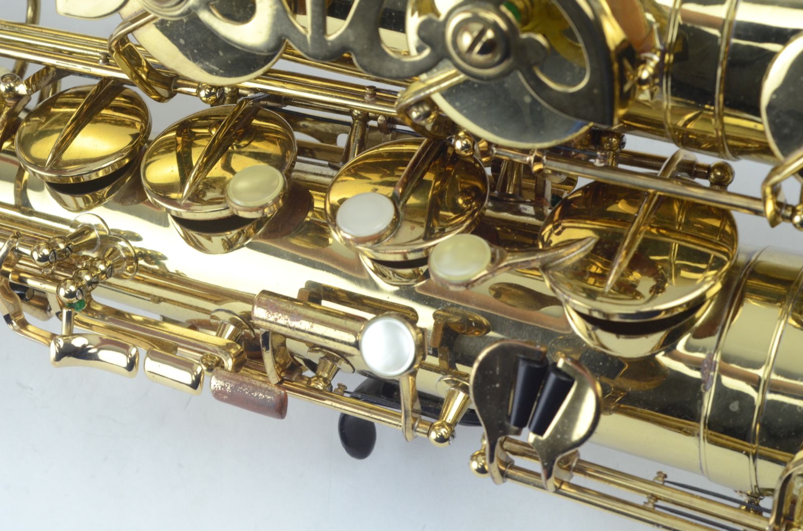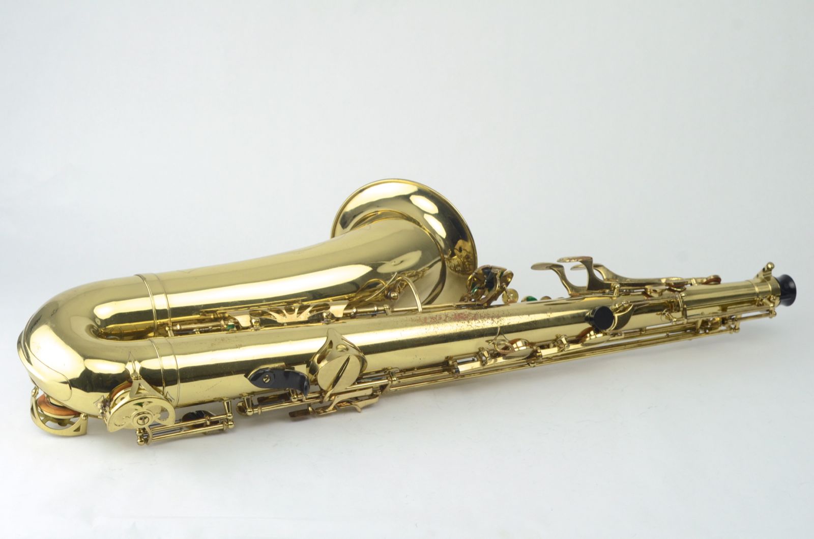 This is a nice original lacquer Buffet S2 tenor saxophone. It has older pads sealing well at present. It comes with the original case. There was a small ding removed from the front of the bell below the engraving, and that's about it. This horn plays a lot like a Buffet S1 Tenor, with a big, bold medium bright tone that can go either in a classical direction, or that can cut through a band. Intonation is very good. The LH pinky cluster has the very comfortable S1 design with tilting low Bb. The RH pinky keys are Selmer-style and also quite comfortable. This horn should be a good deal for someone looking for a nice pro horn for a good price. The S2 is also extremely rare. This one was made in the mid 1980's ( SN# 37xxx) and is the first S2 that I have come across. It ships in the original case in good condition.