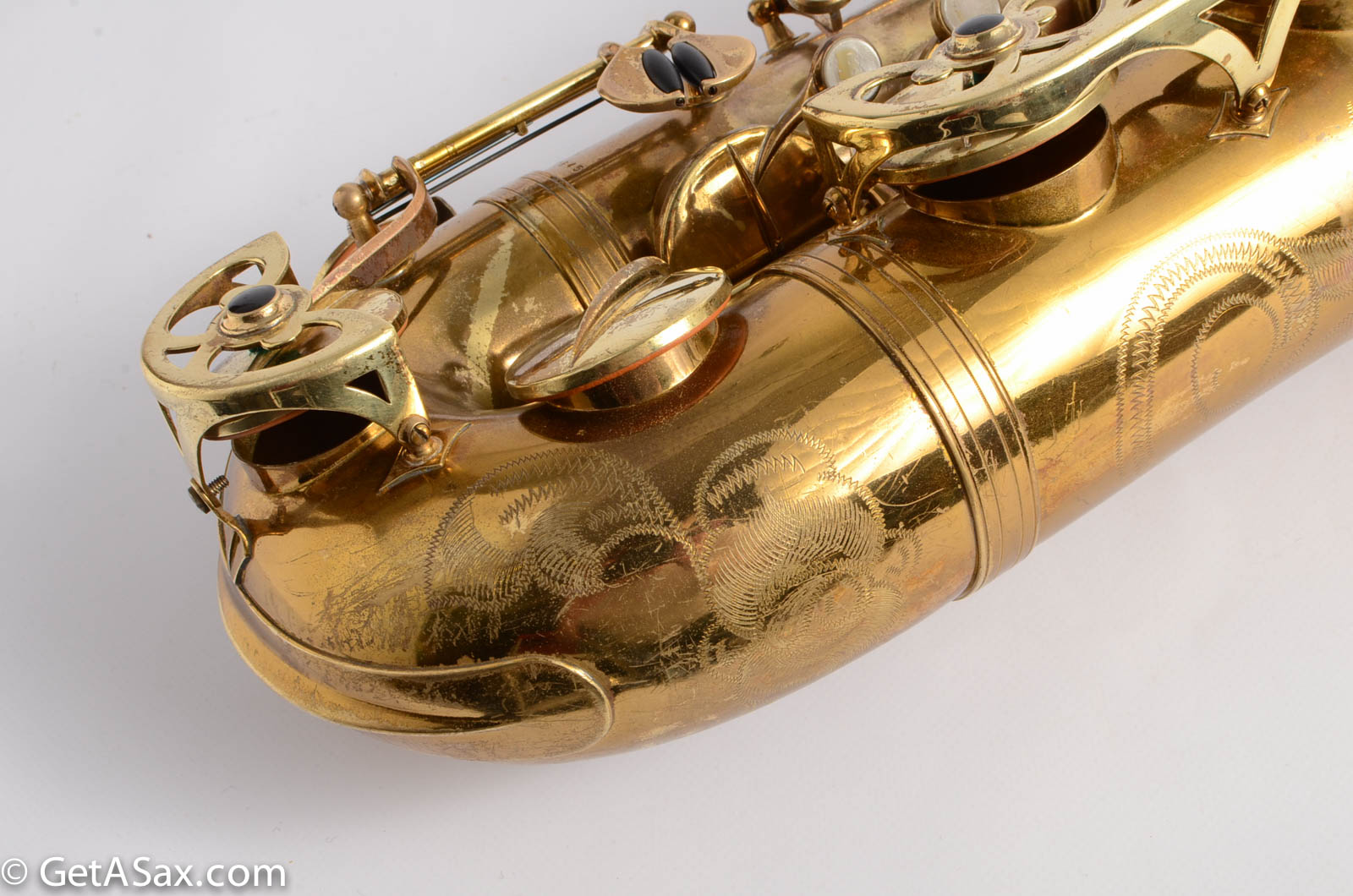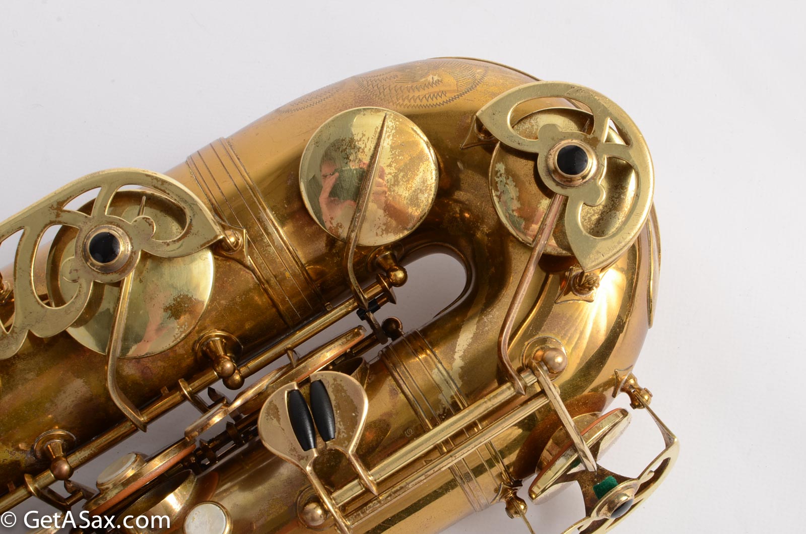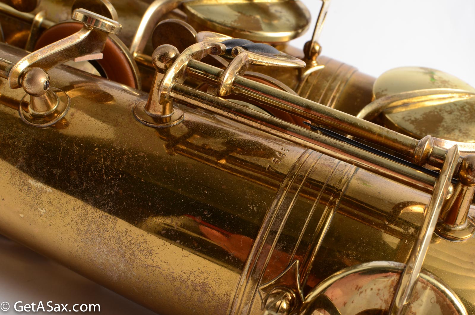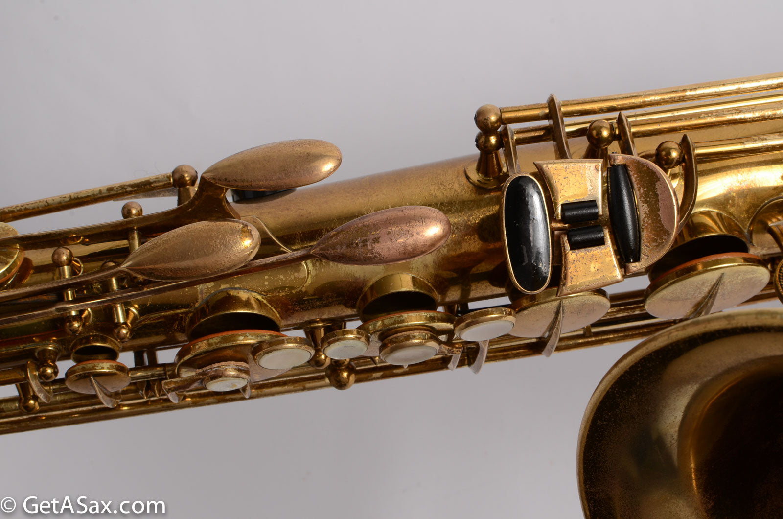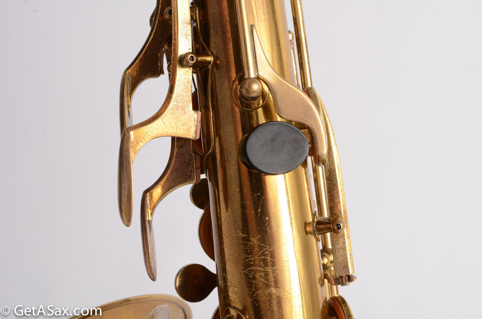 This horn is nice original lacquer example that also has a fresh, full overhaul. This site is about quality, and I think it's worth it to get the highest quality work I can find done on nice horns like this. The overhaul included disassembly, cleaning, new oil, all new pads, corks, felts, flat metal resonators, mechanical work, and setup. Since saxophones have so many moving parts, this just takes a long time and a lot of skill to do correctly. But it's worth the investment because then you get to experience the saxophone as it was meant to sound. And you don't have to spend any time or money on annoying piecemeal repairs in the near future. The neck has had a pickup removed and plugged, but it was done so well that it is almost invisible. Smooth outside and inside. I didn't even see it at first, looking closely.