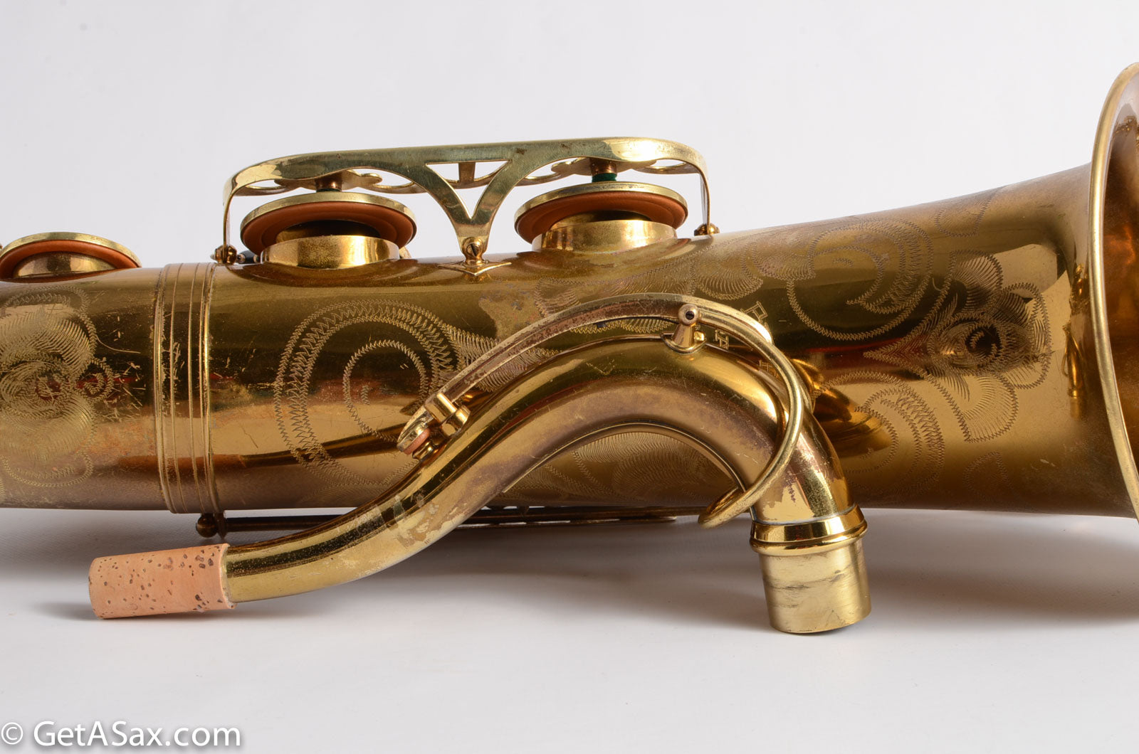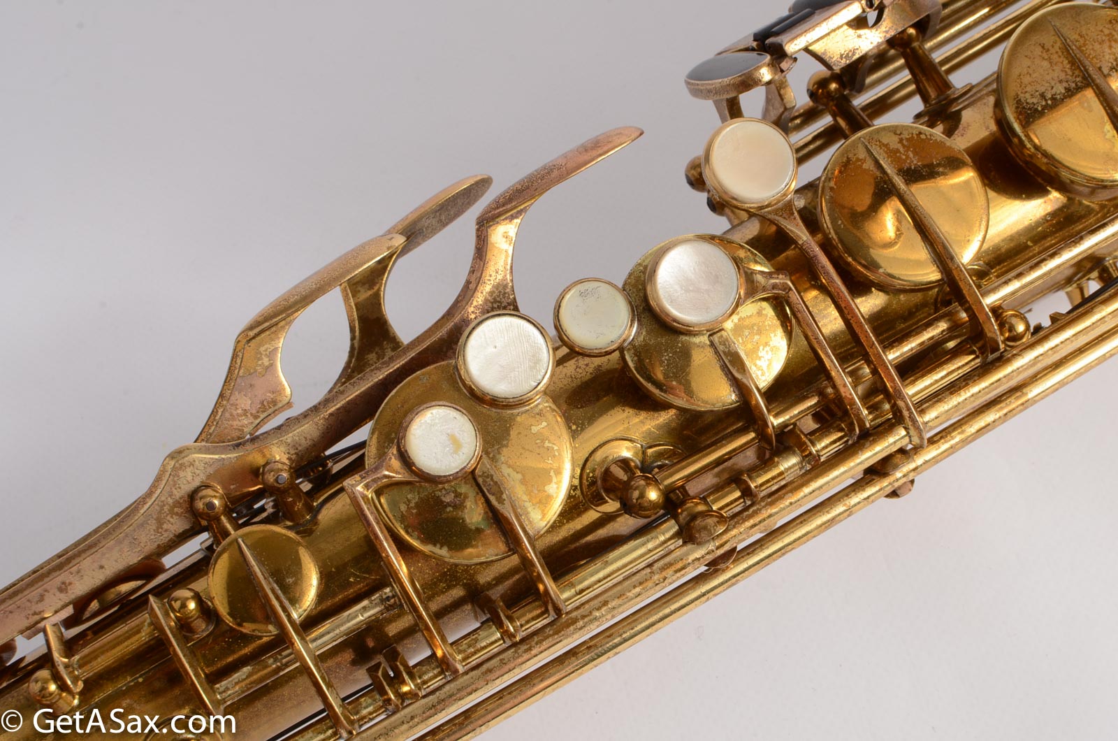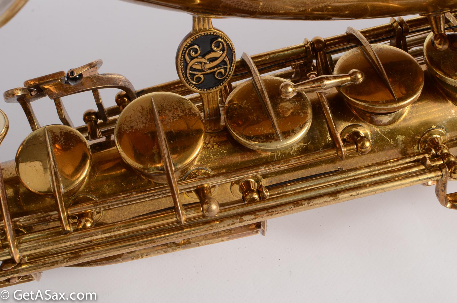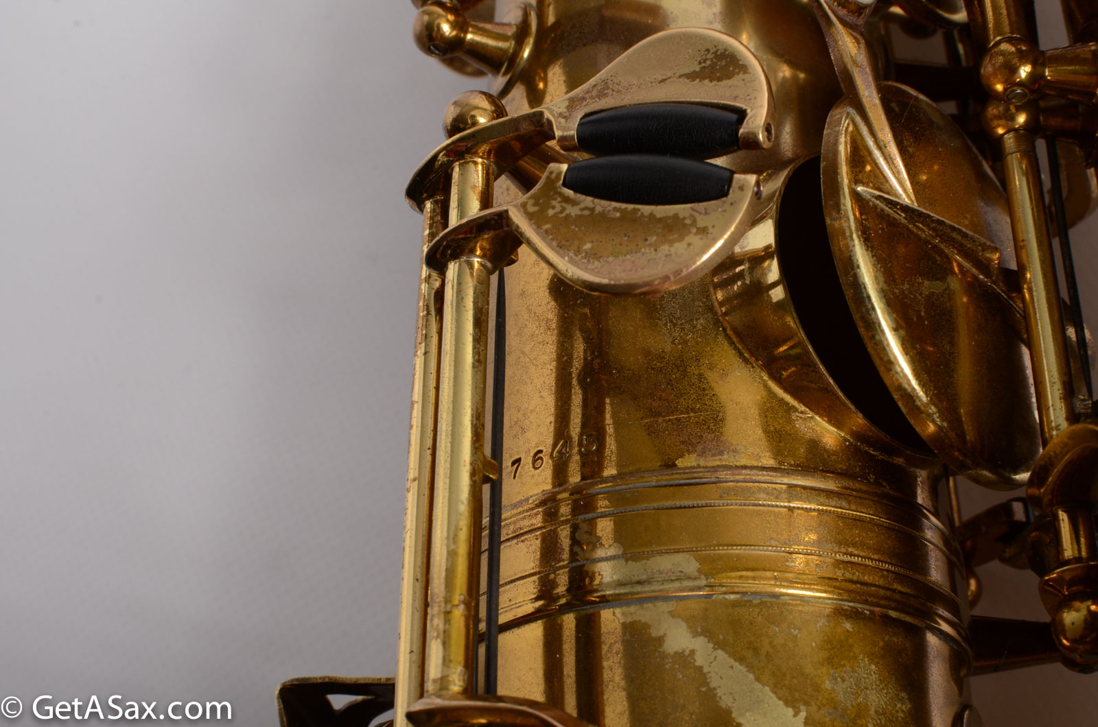 This horn is nice original lacquer example that also has a fresh, full overhaul. This site is about quality, and I think it's worth it to get the highest quality work I can find done on nice horns like this. The overhaul included disassembly, cleaning, new oil, all new pads, corks, felts, flat metal resonators, mechanical work, and setup. Since saxophones have so many moving parts, this just takes a long time and a lot of skill to do correctly. But it's worth the investment because then you get to experience the saxophone as it was meant to sound. And you don't have to spend any time or money on annoying piecemeal repairs in the near future. The neck has had a pickup removed and plugged, but it was done so well that it is almost invisible. Smooth outside and inside. I didn't even see it at first, looking closely.