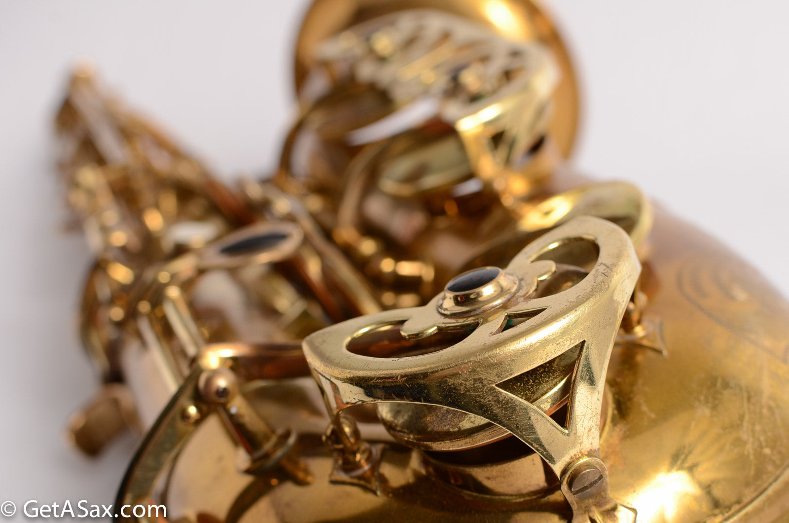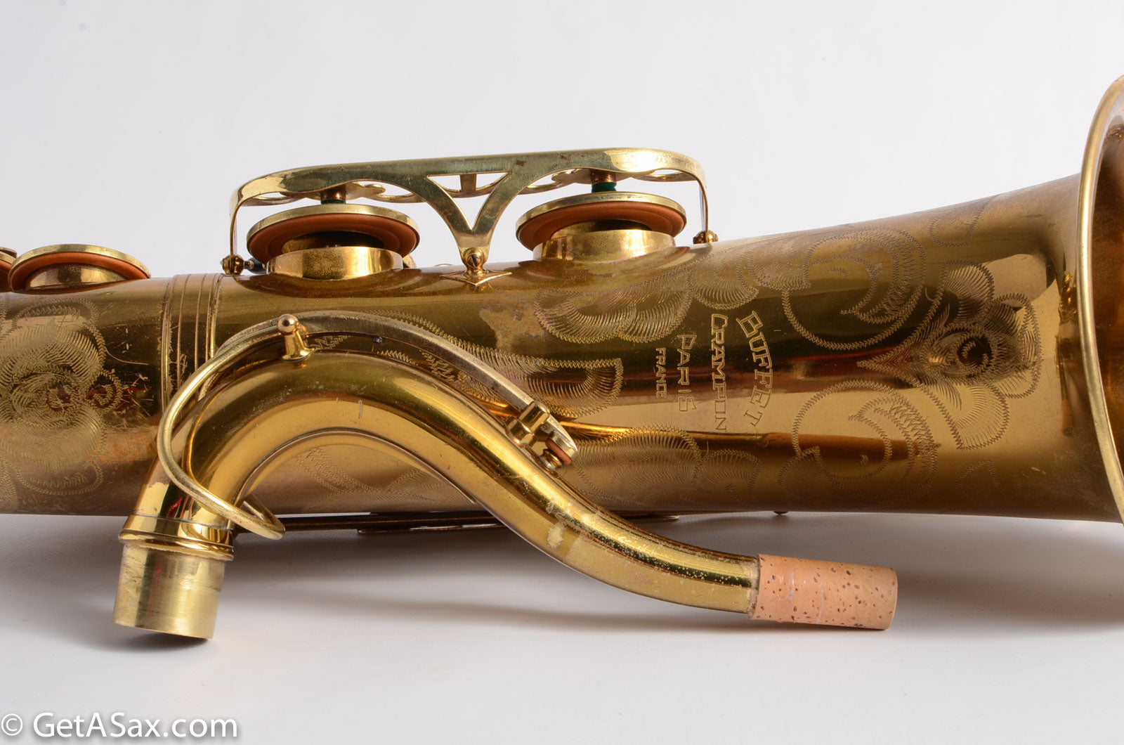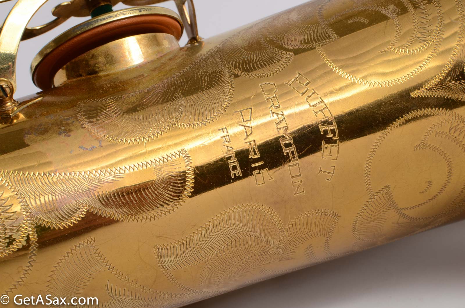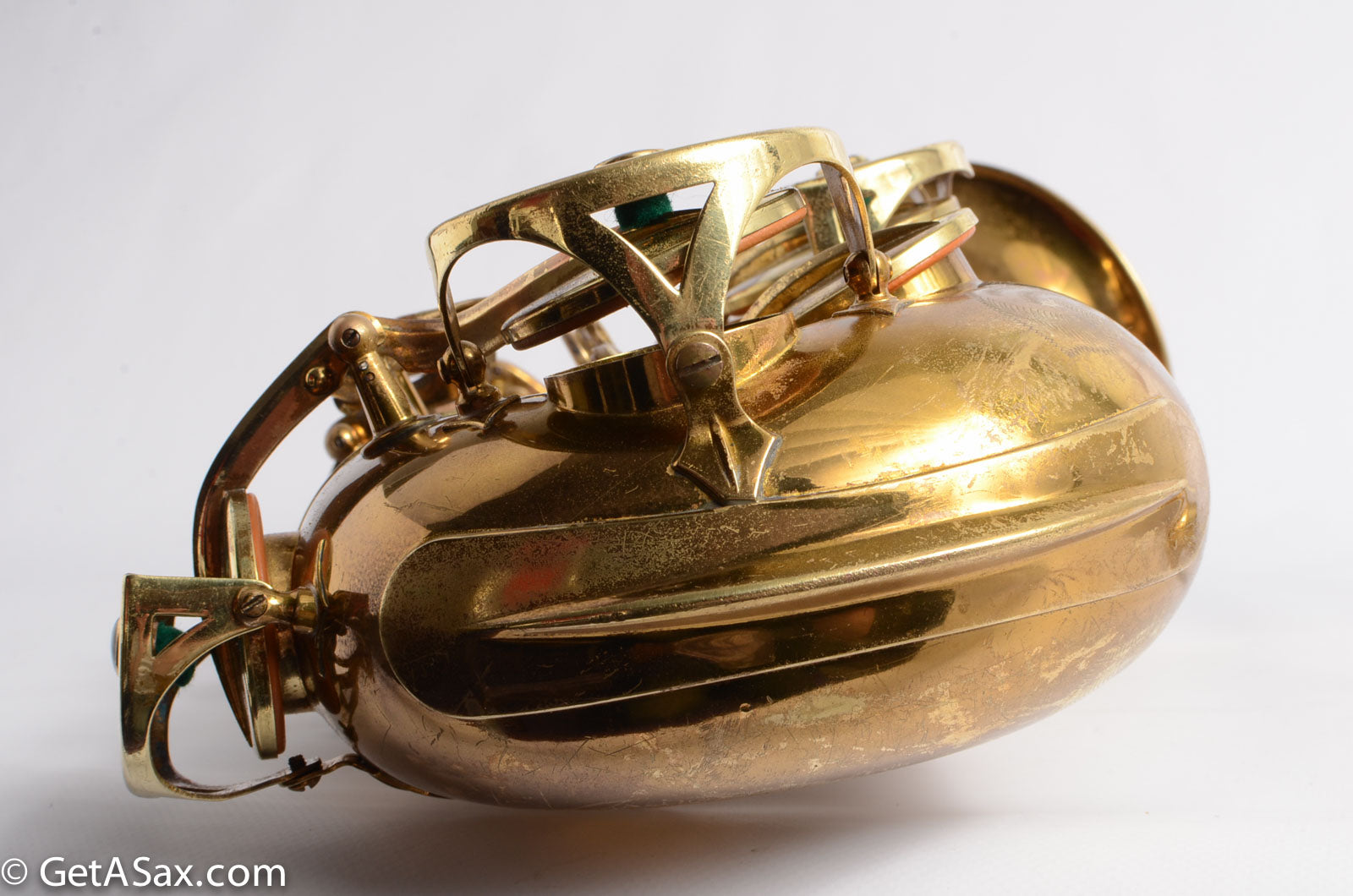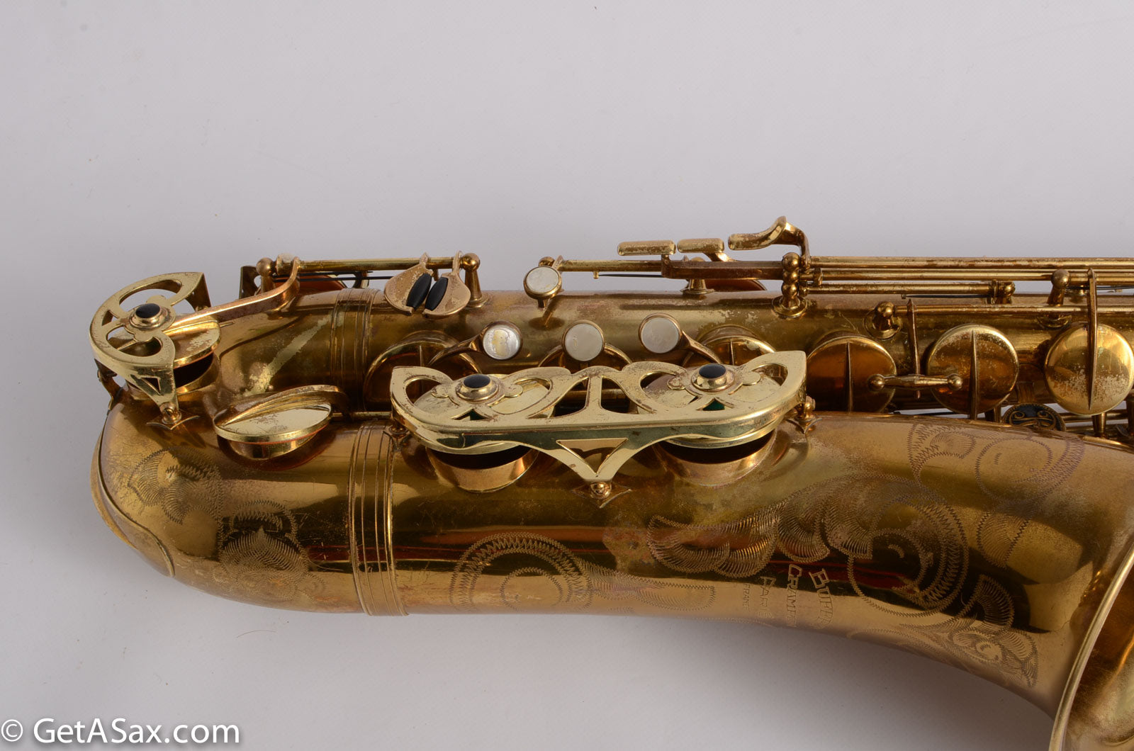 This horn is nice original lacquer example that also has a fresh, full overhaul. This site is about quality, and I think it's worth it to get the highest quality work I can find done on nice horns like this. The overhaul included disassembly, cleaning, new oil, all new pads, corks, felts, flat metal resonators, mechanical work, and setup. Since saxophones have so many moving parts, this just takes a long time and a lot of skill to do correctly. But it's worth the investment because then you get to experience the saxophone as it was meant to sound. And you don't have to spend any time or money on annoying piecemeal repairs in the near future. The neck has had a pickup removed and plugged, but it was done so well that it is almost invisible. Smooth outside and inside. I didn't even see it at first, looking closely.