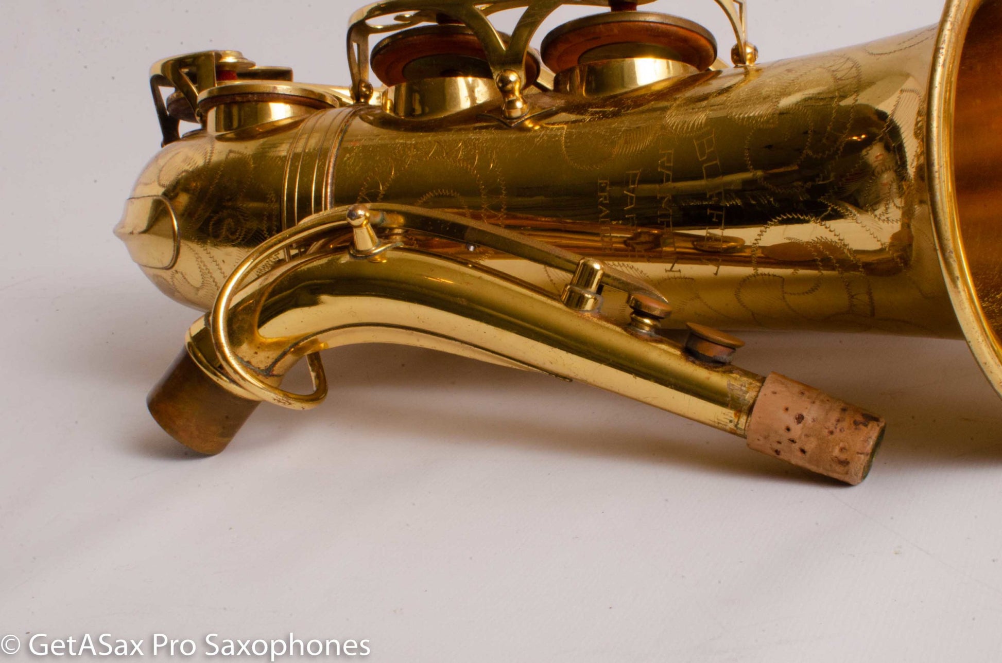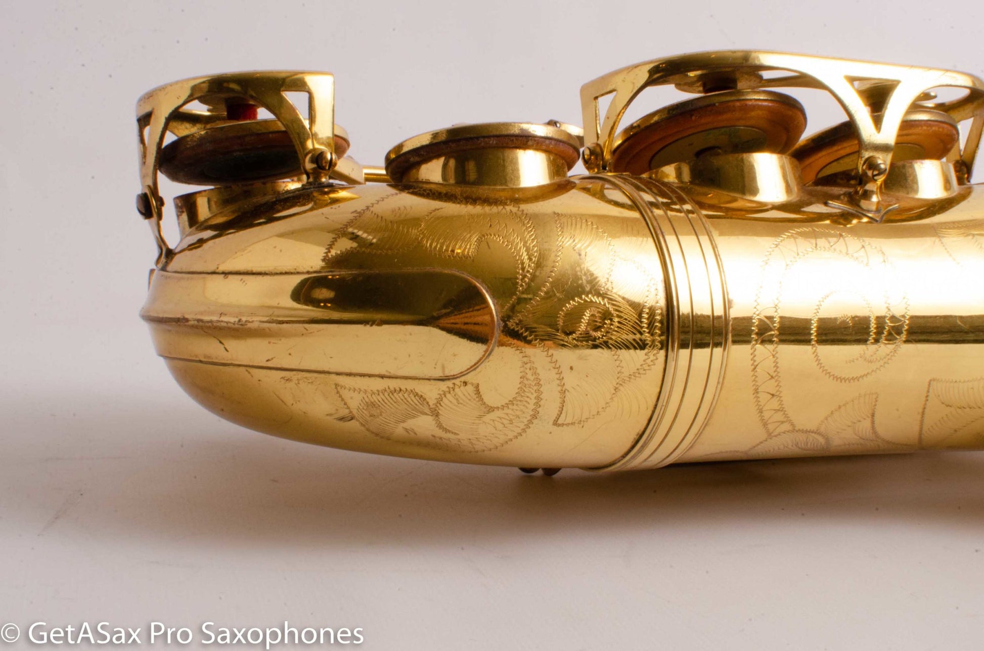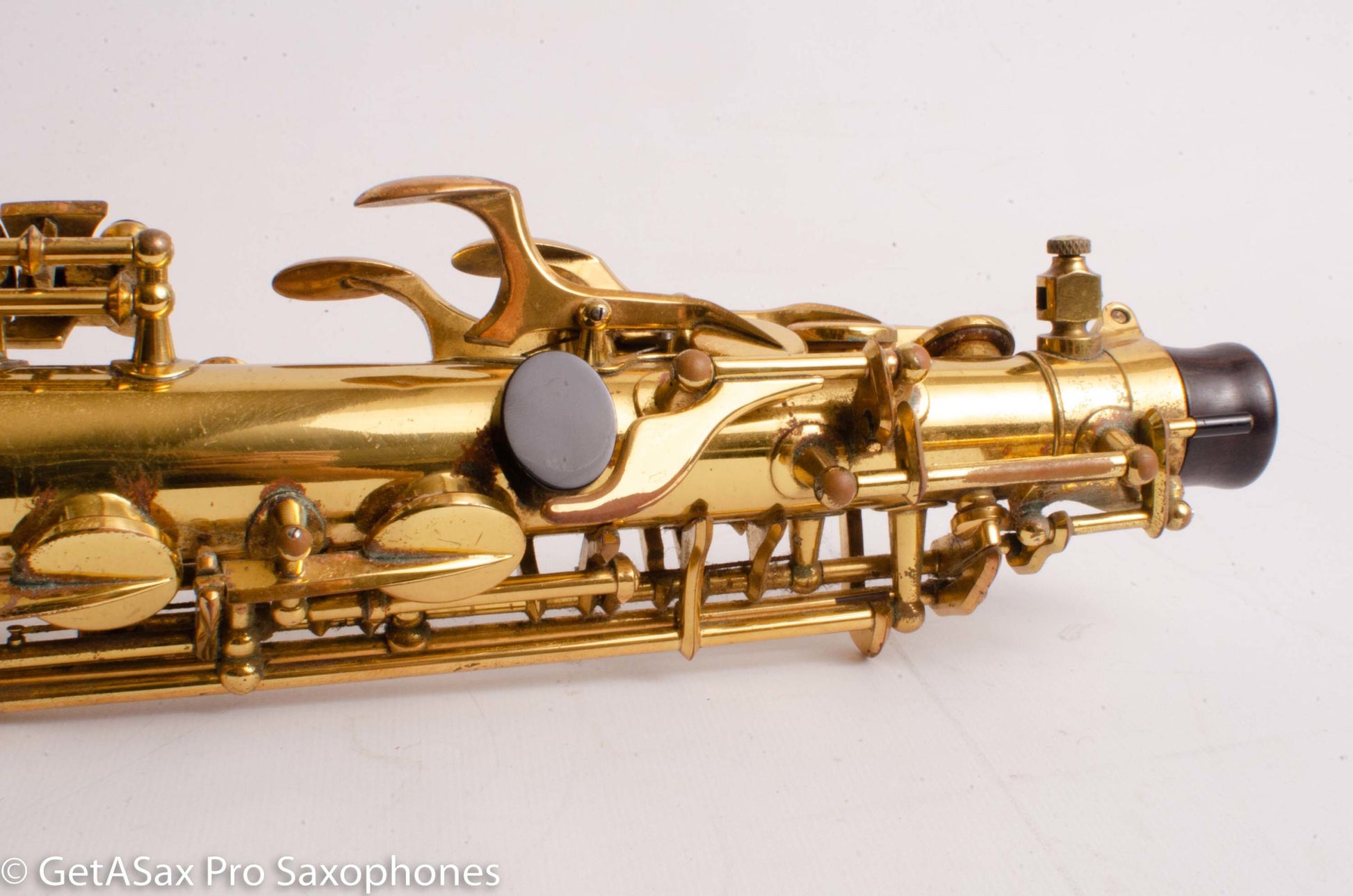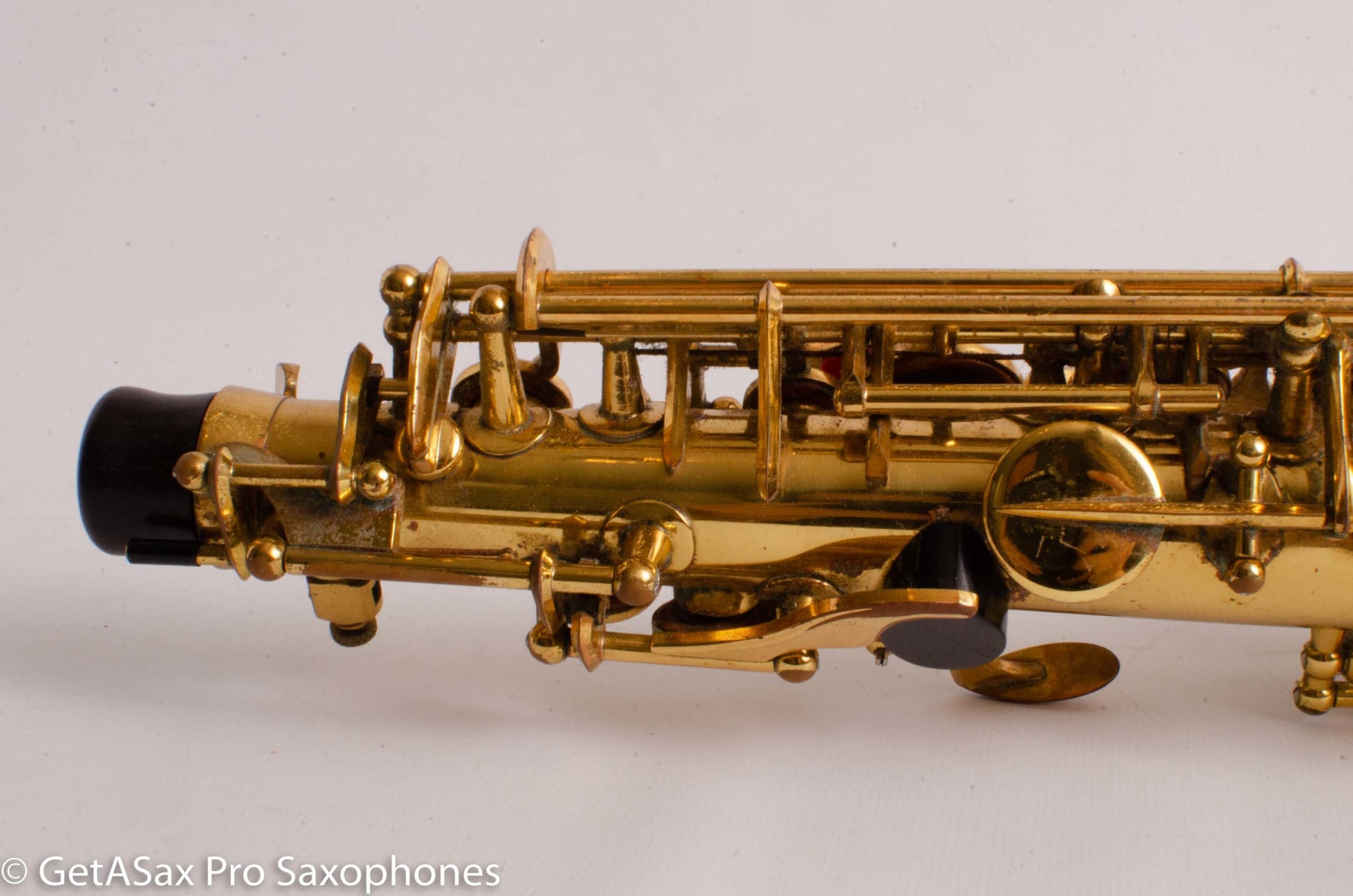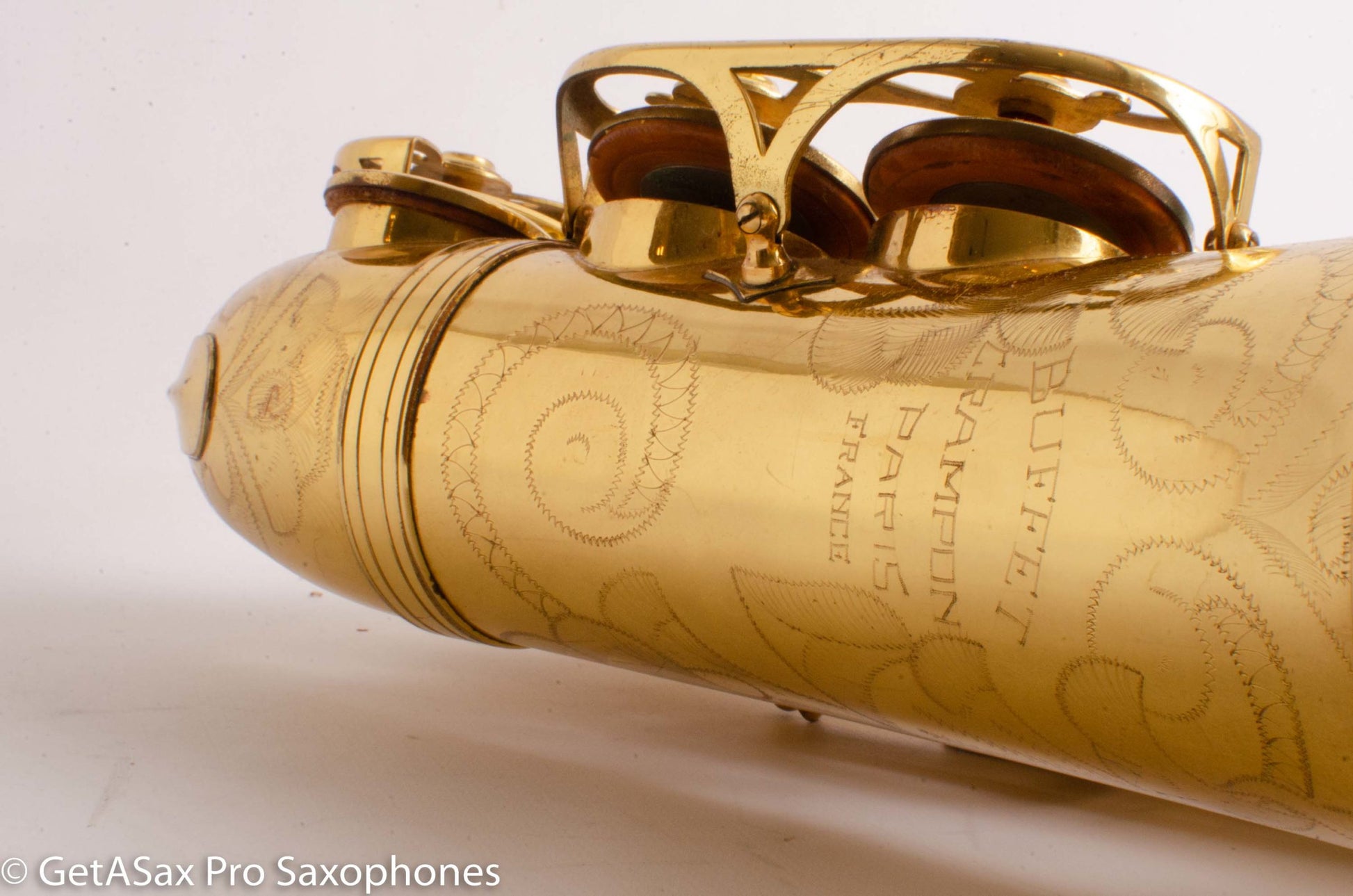 Buffet Super Dynaction alto saxophone with original lacquer. This alto came from a collector who favored Buffet saxophones, and it is priced to sell, in good condition. It has had some dings removed, and the pads are old, but you’ll get an excellent pro alto for a bargain price if you get this and get it overhauled. It has the ‘sparkle’ lacquer that the earlier serial Buffet Super Dynaction saxophones have. The earlier ones like this also play darker, and look great too. The original case comes with it. They’re one of the few saxophones along with the Mark VI and the Couf Superba 1 that have a complex, interesting, vintage tone, but keywork that feels more or less modern under the fingers. Intonation is also typically quite good, as you might expect from Buffet Crampon Paris.