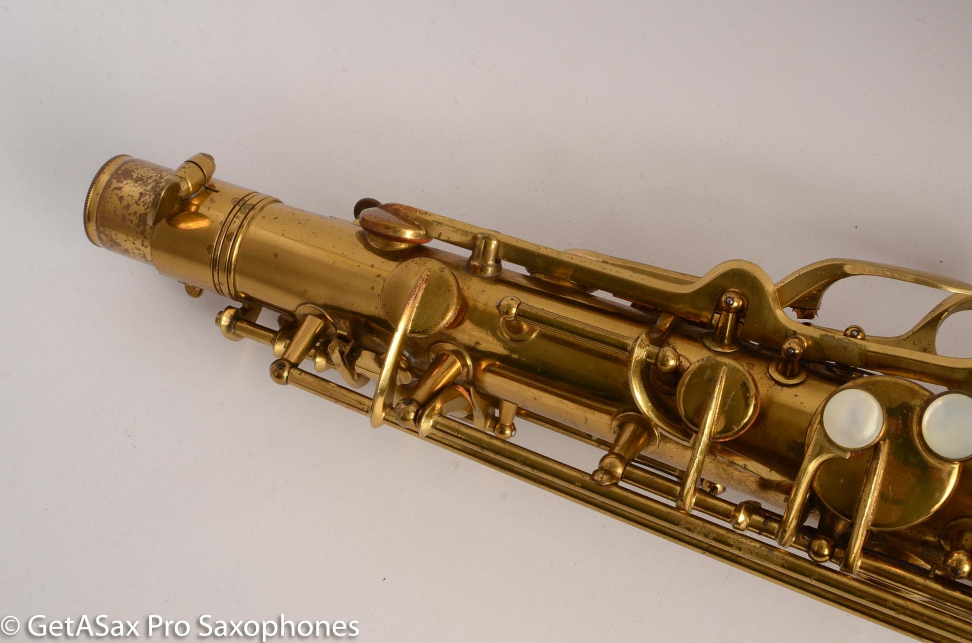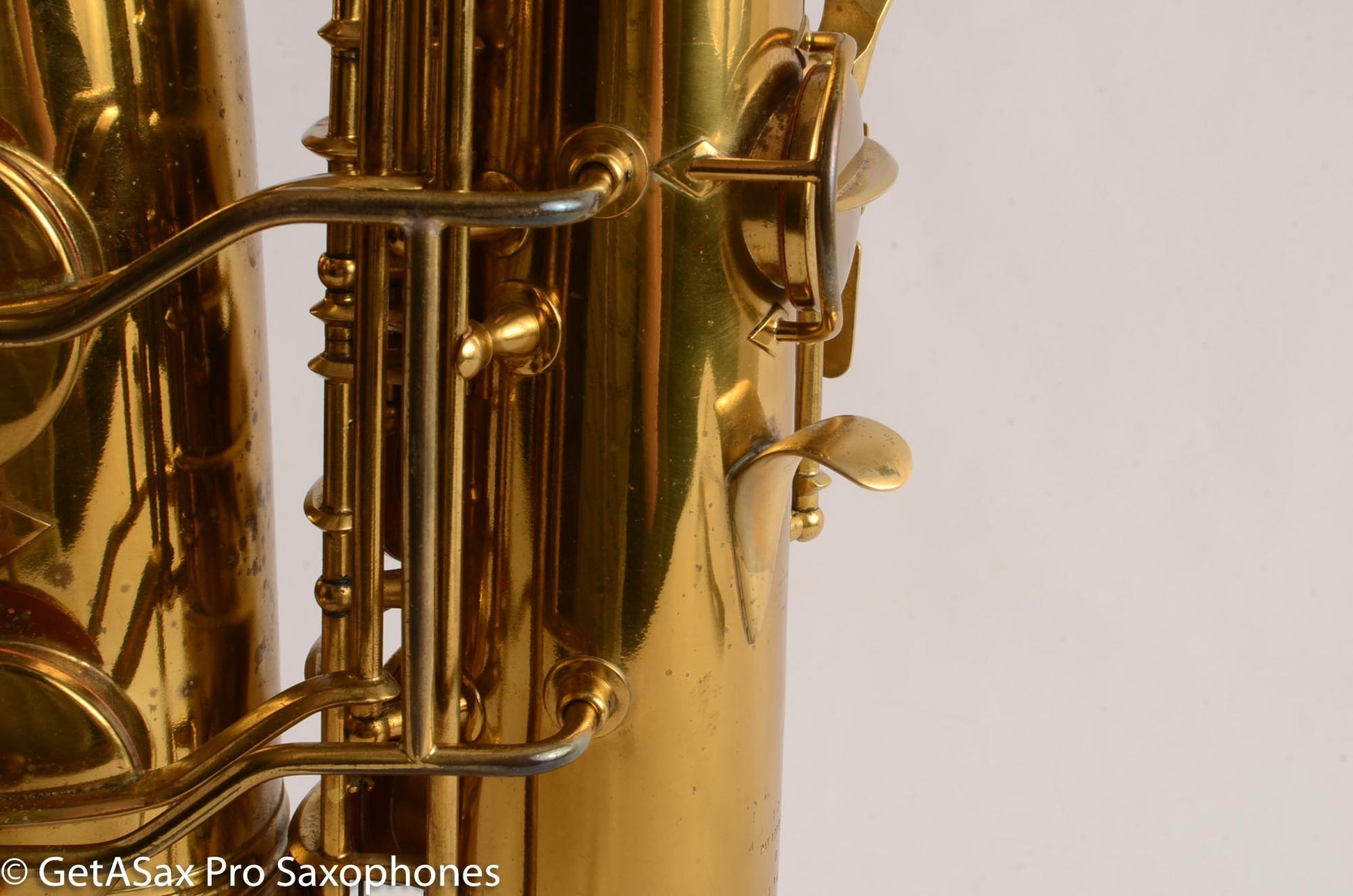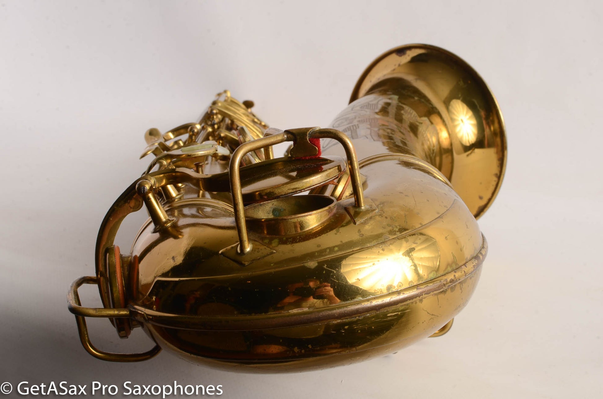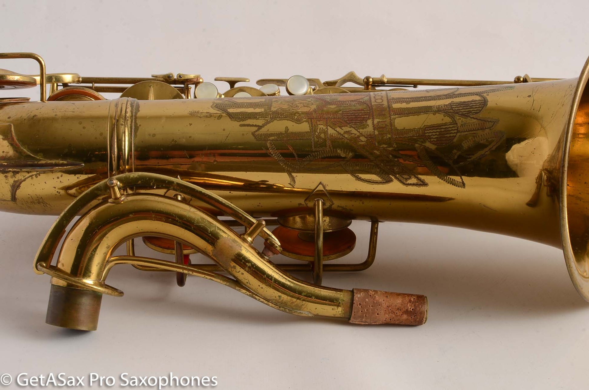 This Conn 10M tenor saxophone from 1948 comes to you in very good original condition. There are no resolders. The bell flare is undamaged. Neck is not pulled down. Body tube looks clean as well. There were some small dents removed from the back of the bow, but that was done well, so that it is hard to tell at all. Everything is in good shape and keys move freely. Rolled tone holes are also undamaged and in great shape. You can almost play the horn on the existing reso-pads but it would be 10x better with an overhaul.
