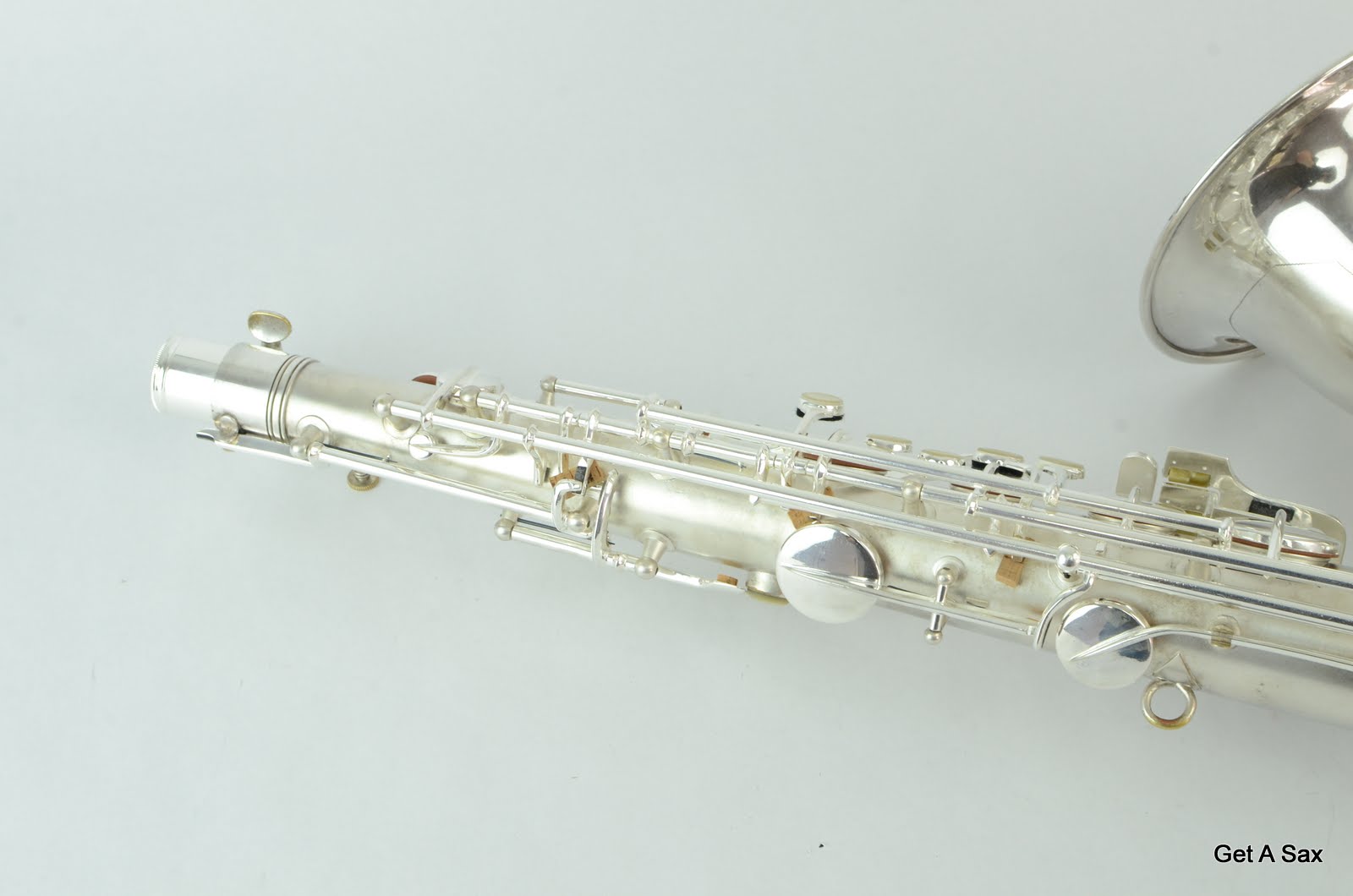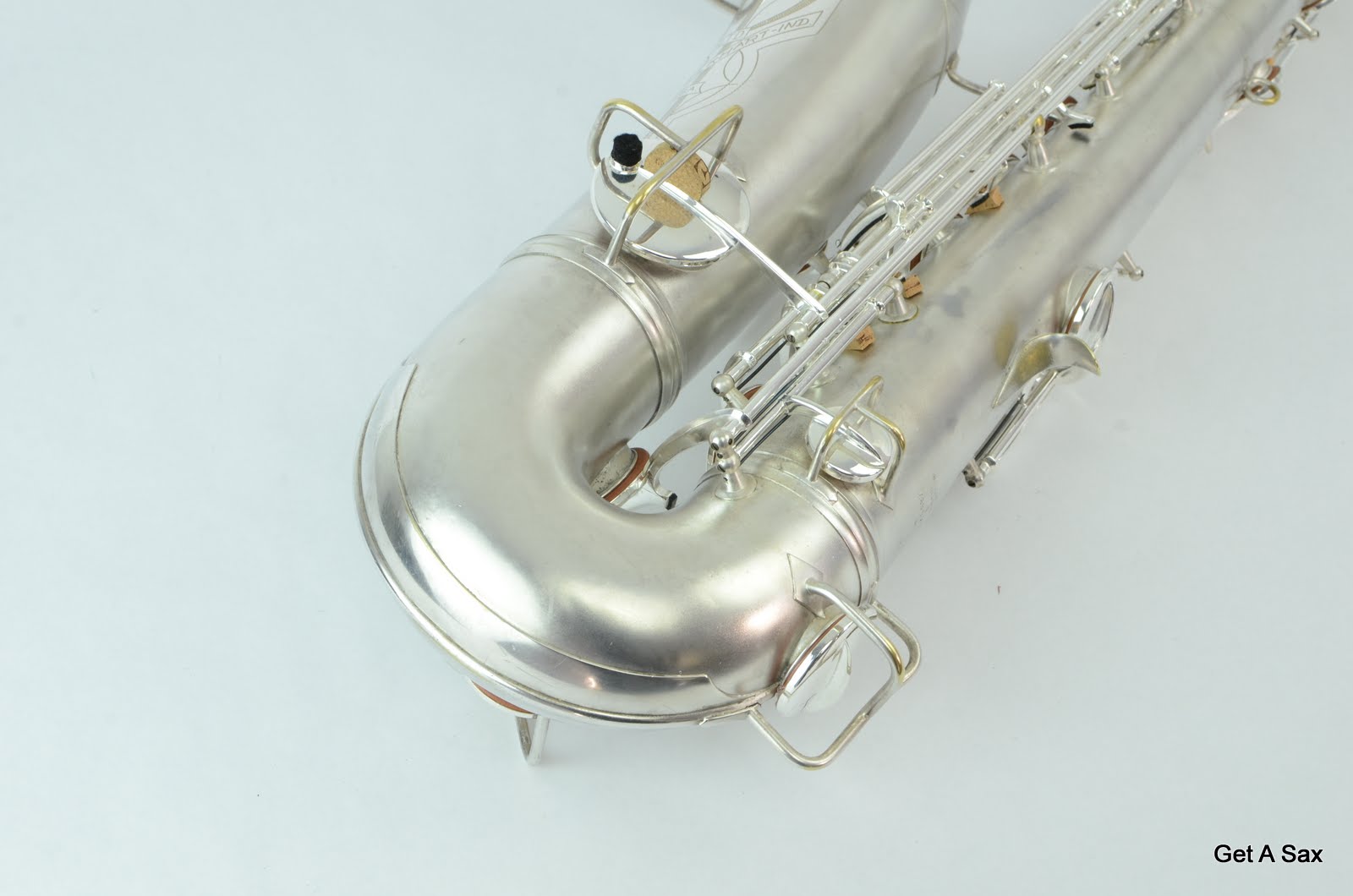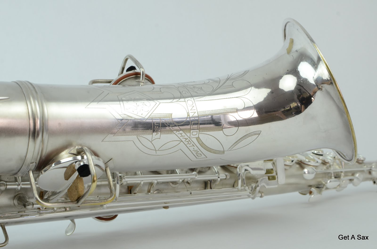 This is a super clean silver plated Conn Transitional tenor saxophone SN# 256xxx with split bell keys and naked lady engraving. This particular iteration of the transitional Conn is very rare and highly desirable. The naked lady engraving is almost always on the 10M-style horns, but there was just a short period in which they still made split bell key versions but put the new engraving on them.