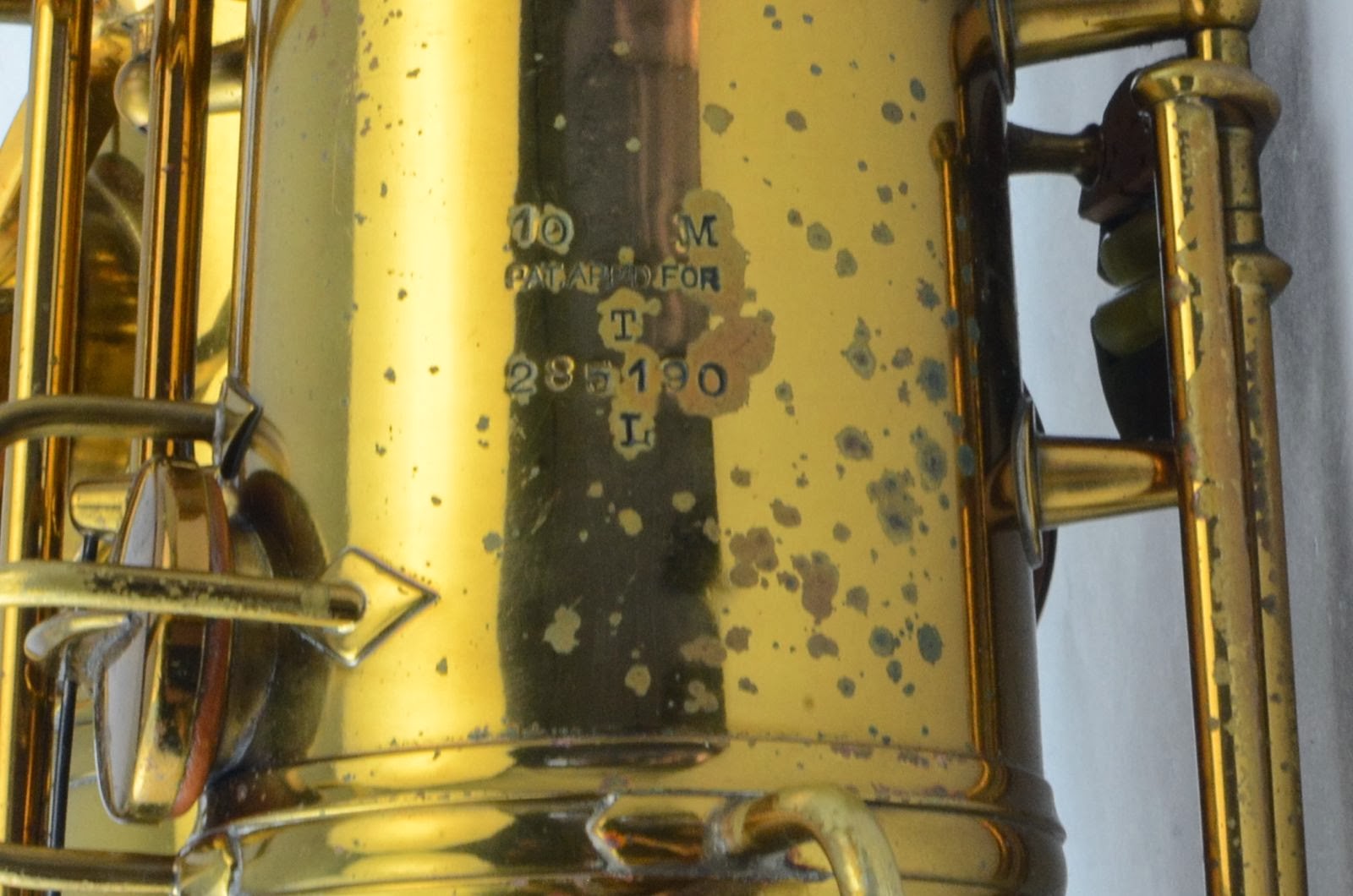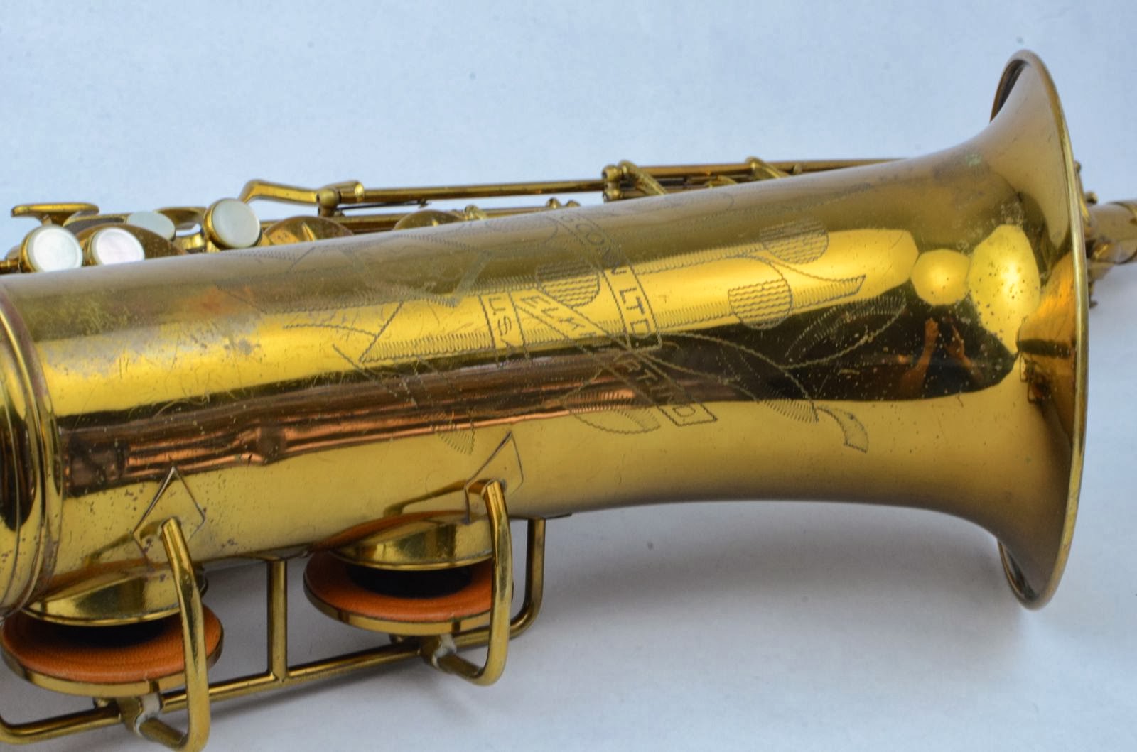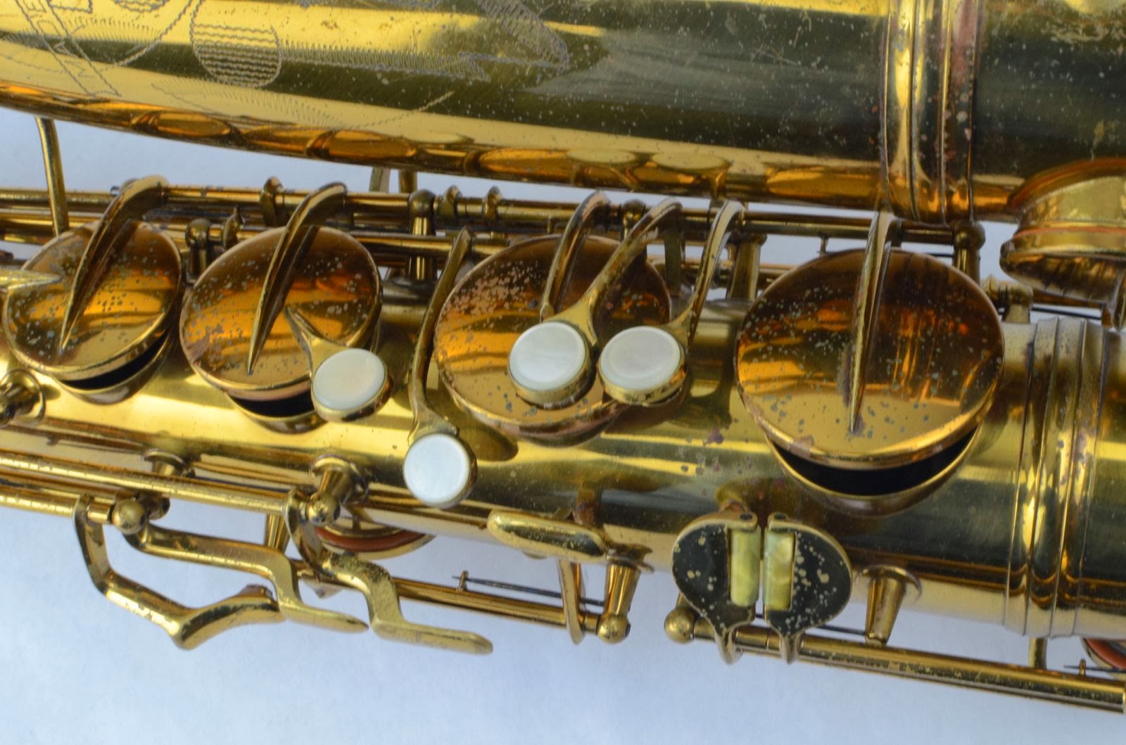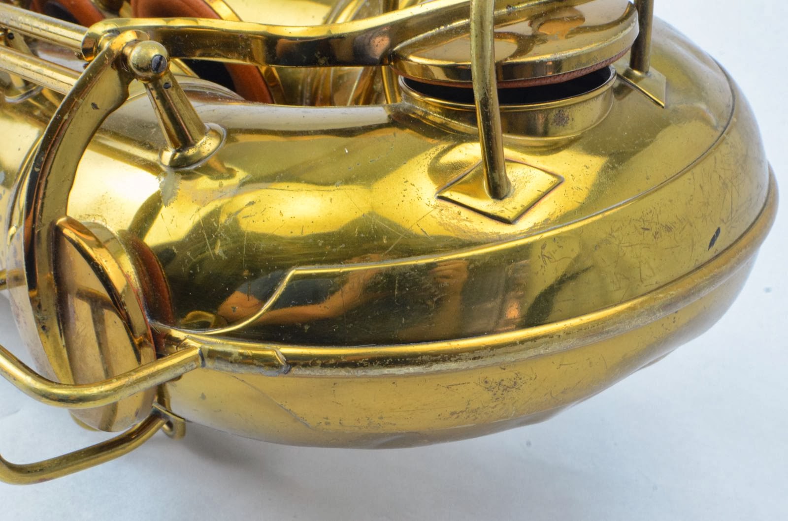 This particular horn falls in that range of most desirable Conn 10M's and sports all the features, including rolled tone holes, original neck, beautiful original lacquer, and all the bits and bobs intact. It has had a few shallow dents removed from the back of the bow (like most horns) and the octave key on the neck popped off and has been resoldered. Besides that, it's nice and clean, retaining most of its original lacquer. The pads are currently a mix of old and new. You could certainly get by playing it as is, but if you want the full experience, consider getting it overhauled. I would be happy to help you get this done to my picky standards.
