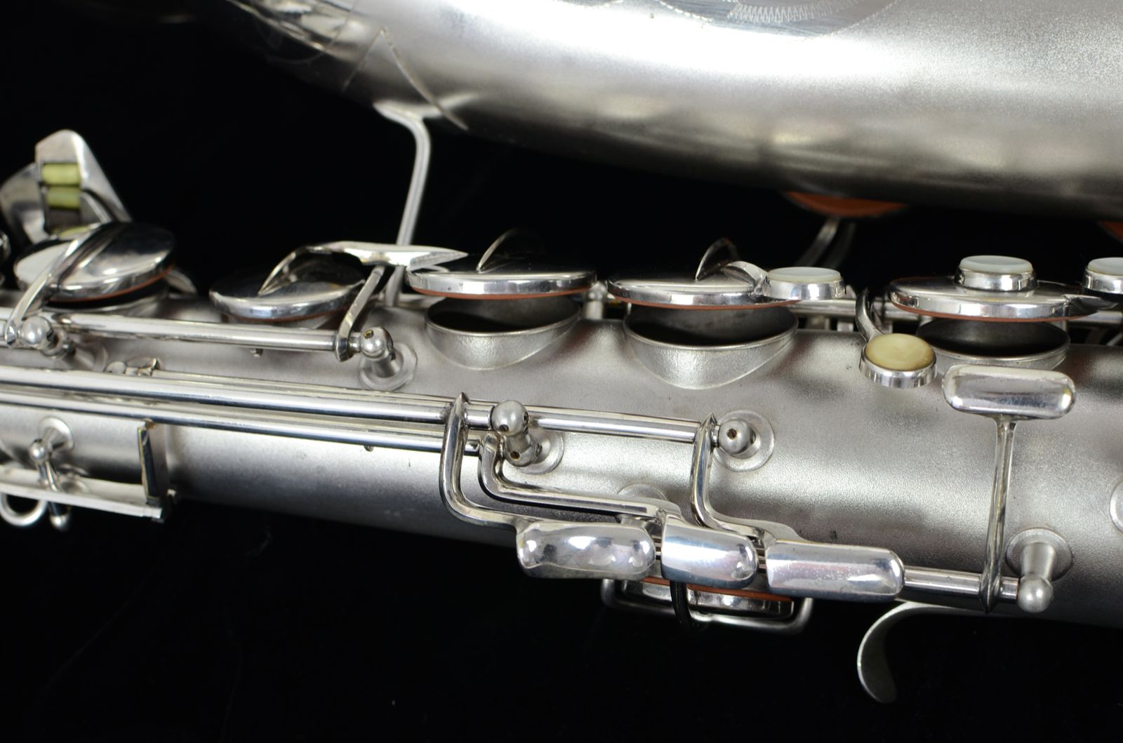 This is a beautiful Conn 10M tenor saxophone. It is one of the earlier ones with rolled tone holes. Silver plated 10M's are rare and highly desirable. This one has some wear to the silver on the touch points and on the bell key guard, and the rest of the horn looks great. The silver is in the process of getting hand polished, so check back soon for more pictures. There are no dents or dings or resolders on the horn, and the bell, body tube, and bottom bow are all clean. This sax has a mix of older and newer pads and they are sealing very well, so it does not need an overhaul at present. You could get away with replacing pads intermittently for several years, or you could plan on a repad in 3-5 years to keep the horn playing its best.
