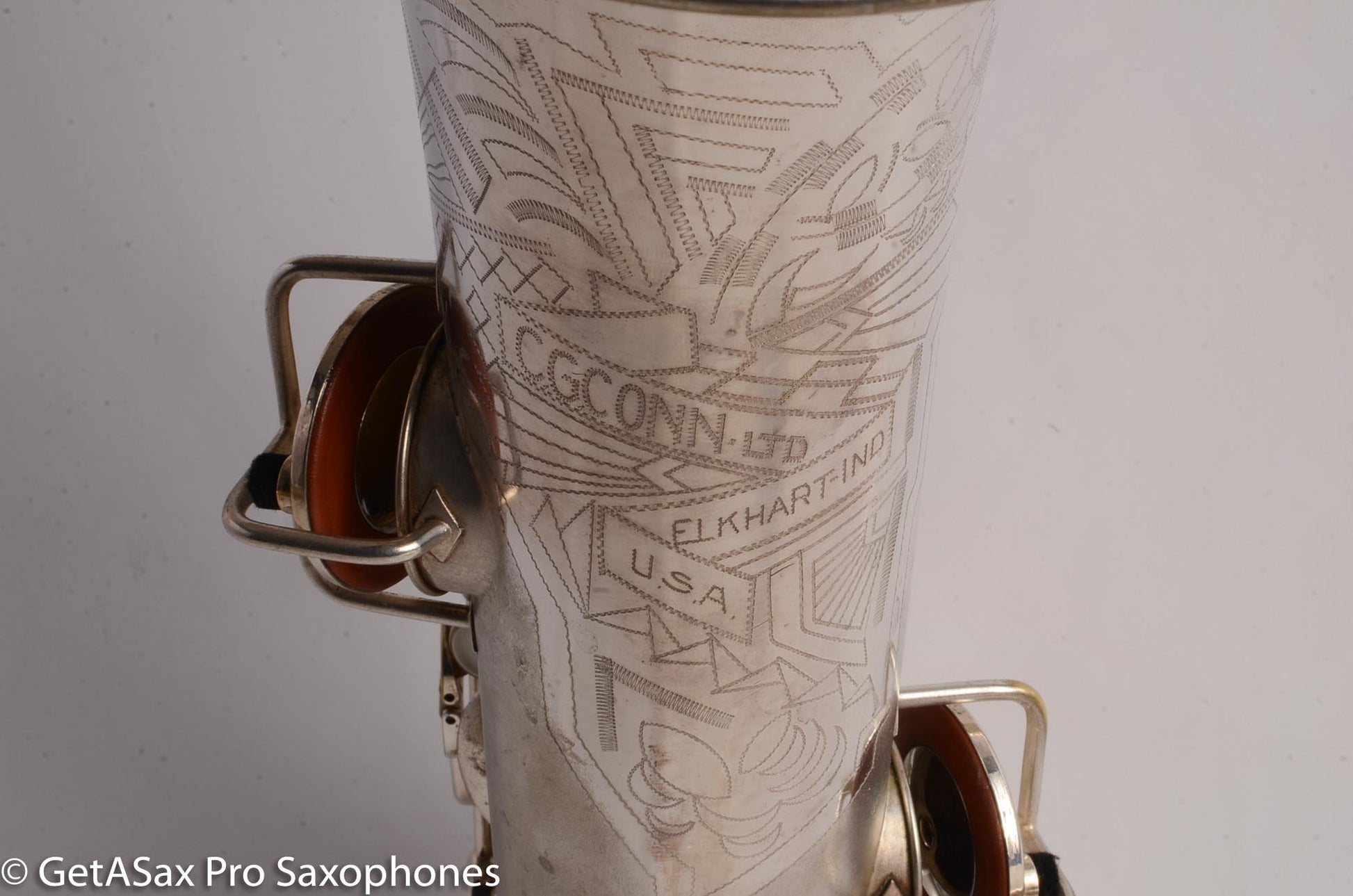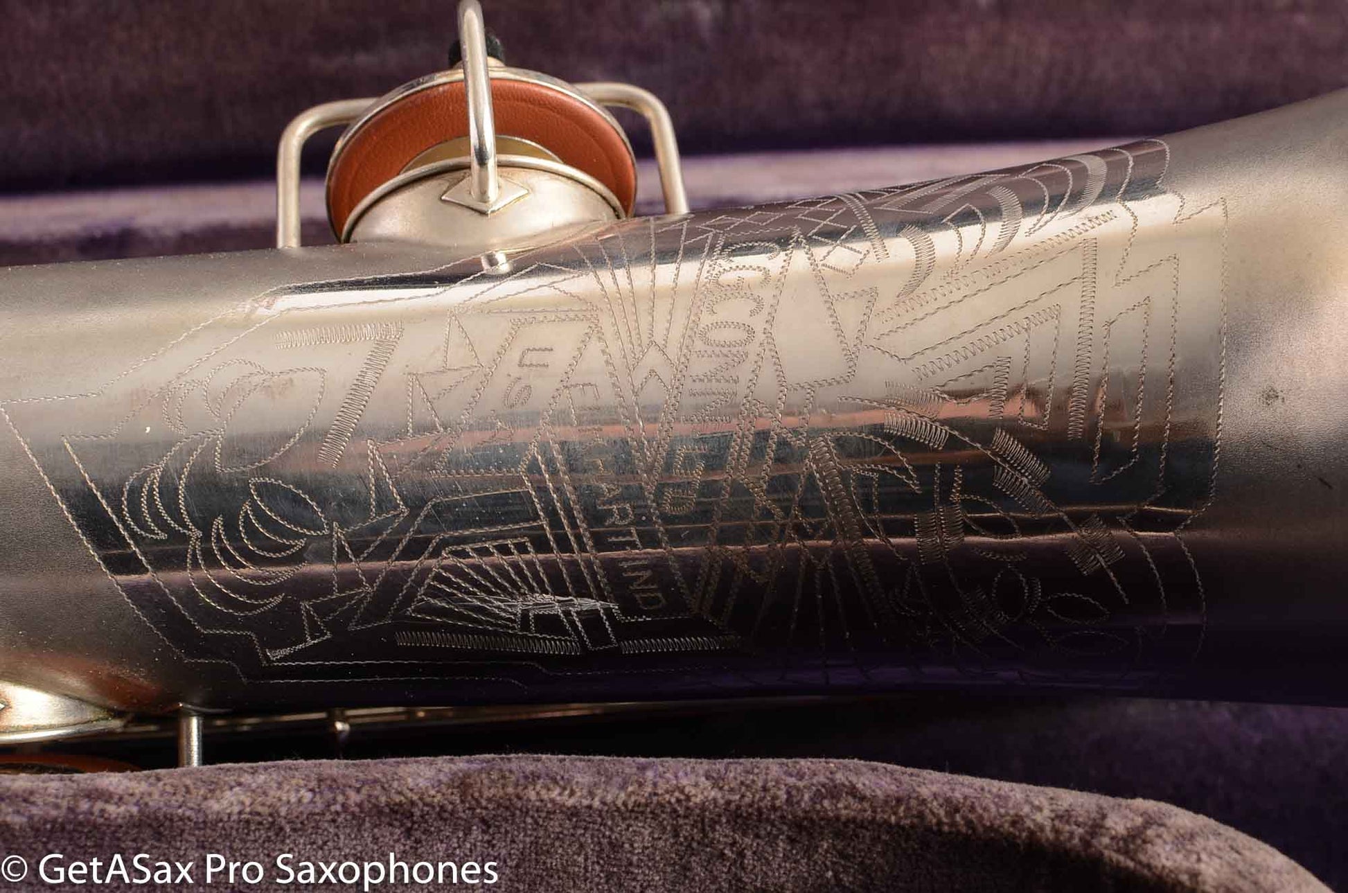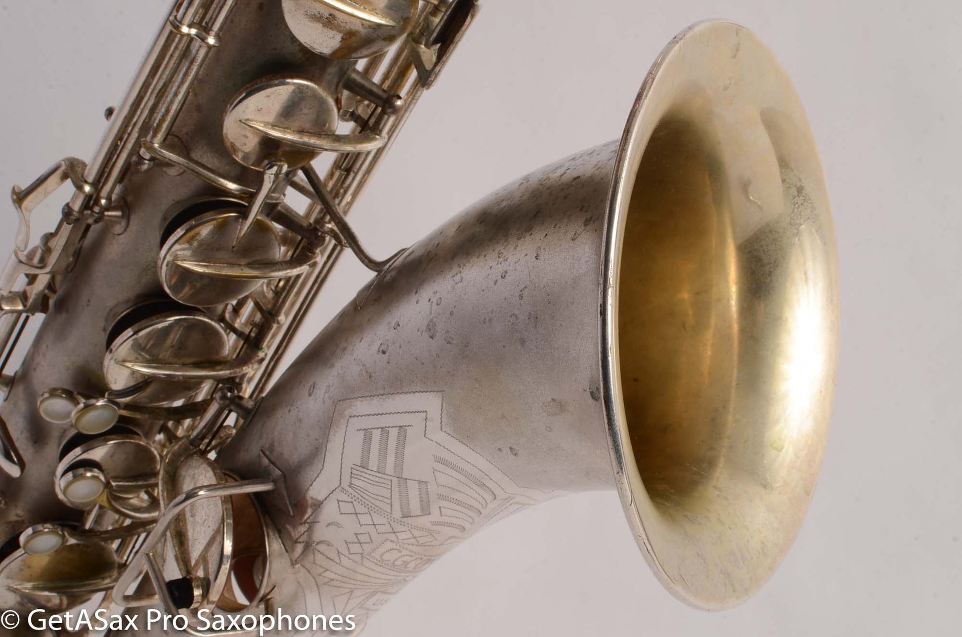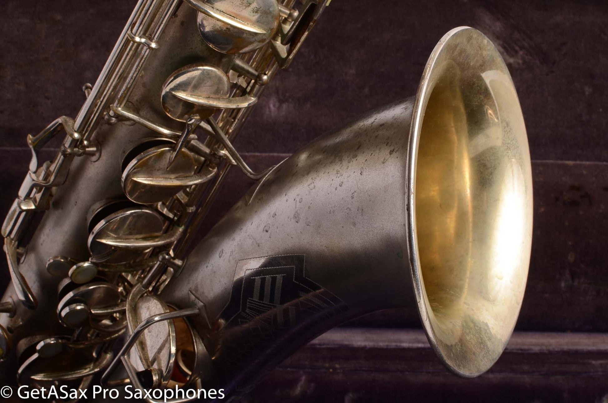 This is a very nice condition Conn New Wonder II tenor, built in 1932, among the earliest of the “transitional” series with art deco engraving and raised side E key. It is in its original silver plate, and has a recent mechanical overhaul on it that was very well done. This tenor is tight and slick and snappy and not mushy under the fingers (as can sometimes happen to Conns with less-than-stellar overhauls) and has the simply unbelievable enormity of tone that even now, after having owned and played about as many saxophones as anyone else, still surprises and delights me when I pick up a Conn. As a repairman friend of mine is fond of saying “I am not prone to hyperbole, but I could go to court and win the case that Conn has the biggest tone.” If you haven’t had a chance to play a 1920s-1930s Conn, you simply haven’t seen all that the saxophone can do. A good Conn is a truly astonishing instrument, and it is easy to see why so many of the professionals of the era favored Conns. If you need to project to the back of a dance hall in the age before amplification, a Conn is the way to go.