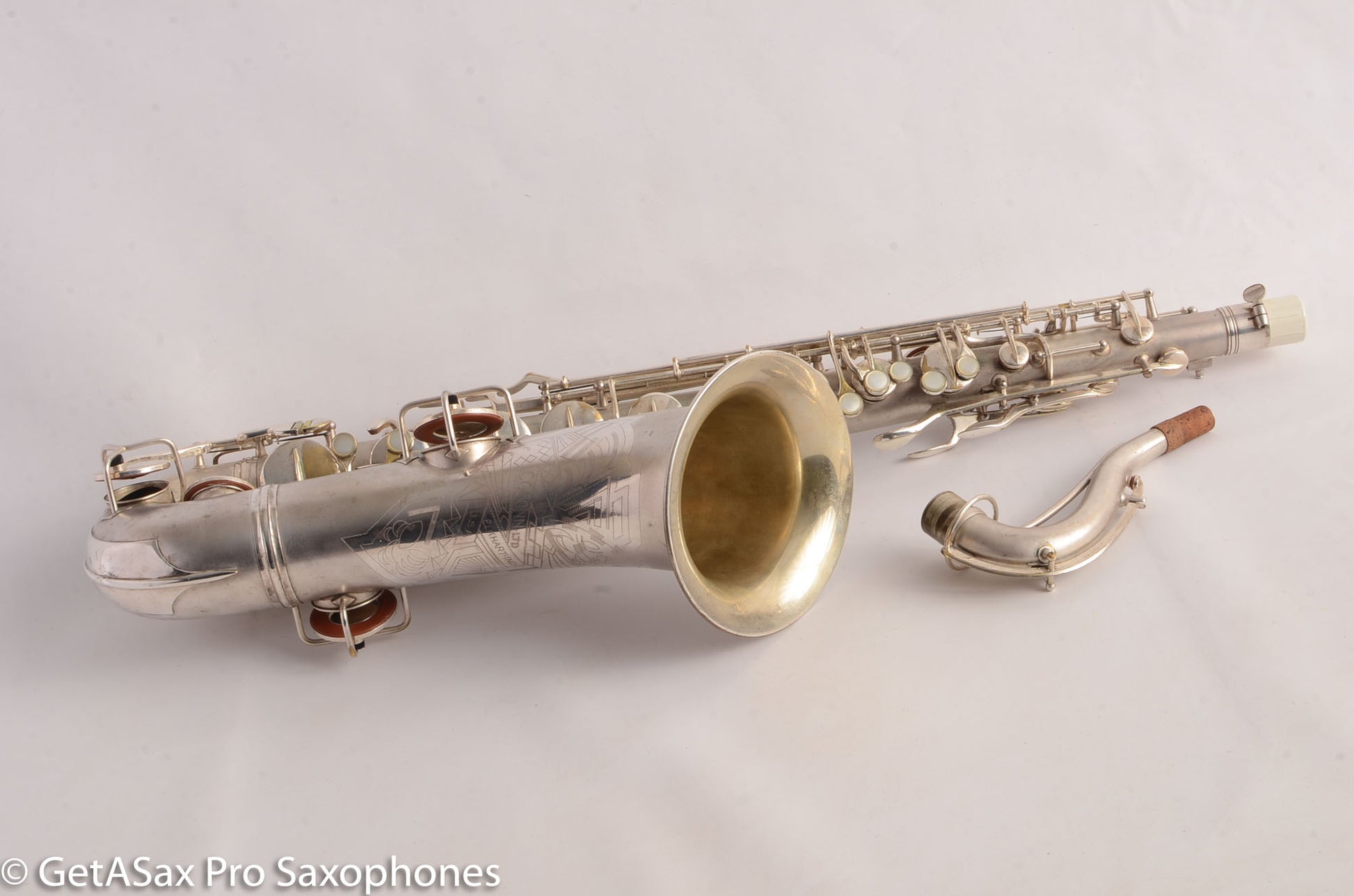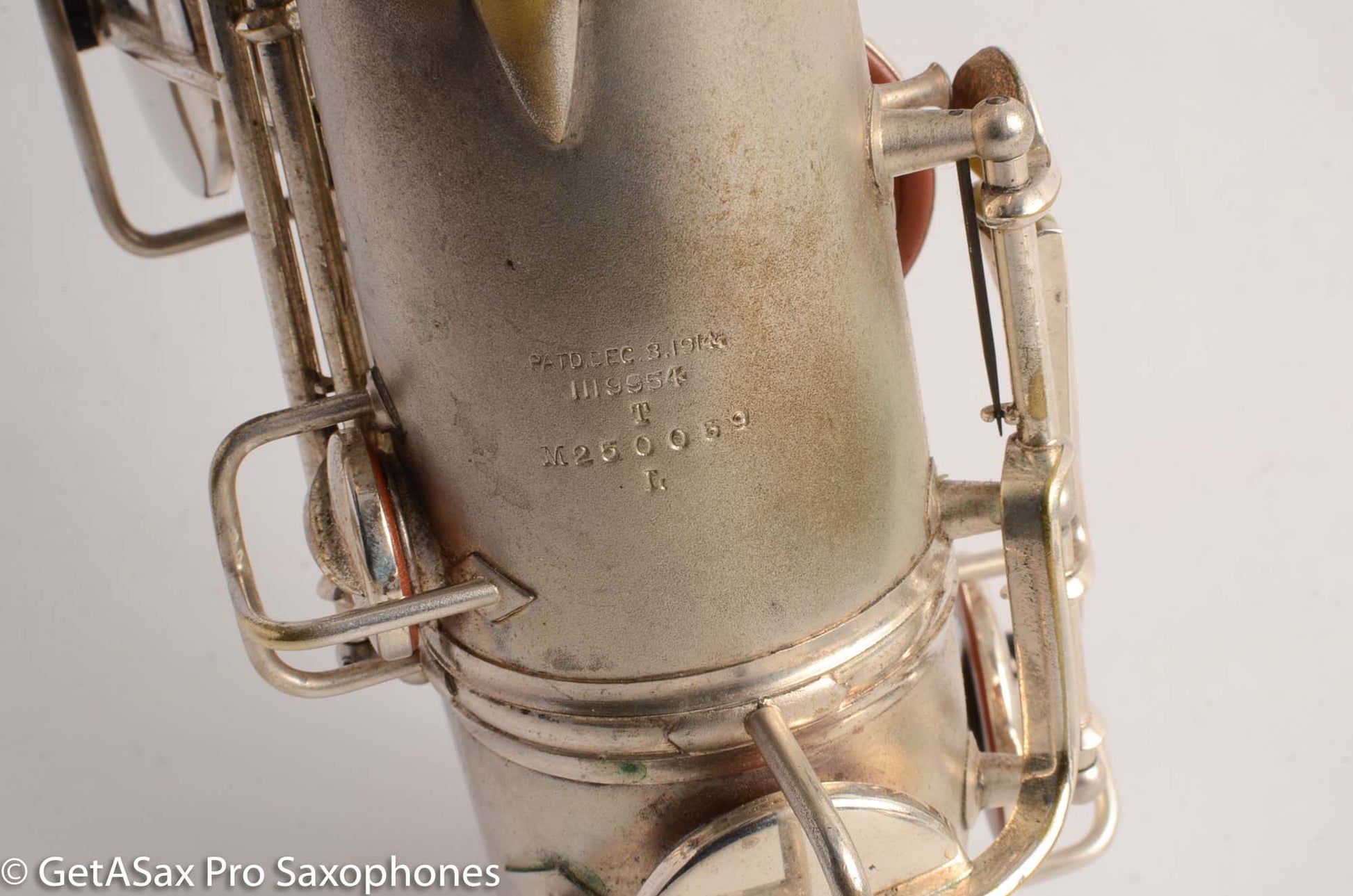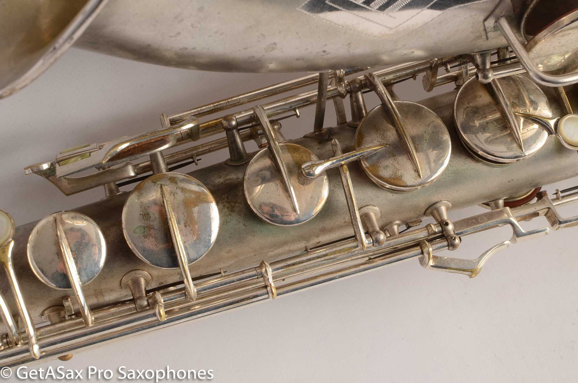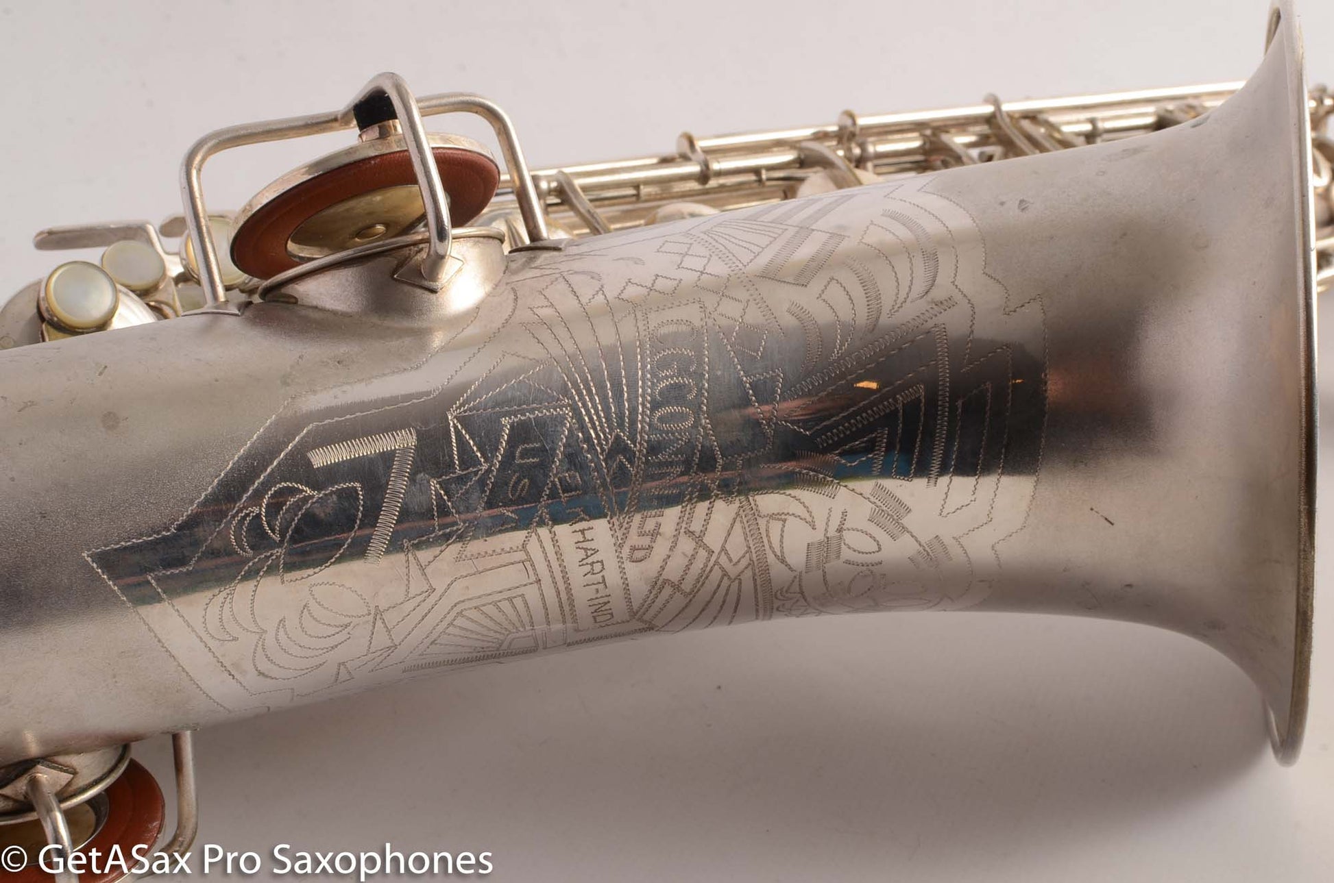 This is a very nice condition Conn New Wonder II tenor, built in 1932, among the earliest of the “transitional” series with art deco engraving and raised side E key. It is in its original silver plate, and has a recent mechanical overhaul on it that was very well done. This tenor is tight and slick and snappy and not mushy under the fingers (as can sometimes happen to Conns with less-than-stellar overhauls) and has the simply unbelievable enormity of tone that even now, after having owned and played about as many saxophones as anyone else, still surprises and delights me when I pick up a Conn. As a repairman friend of mine is fond of saying “I am not prone to hyperbole, but I could go to court and win the case that Conn has the biggest tone.” If you haven’t had a chance to play a 1920s-1930s Conn, you simply haven’t seen all that the saxophone can do. A good Conn is a truly astonishing instrument, and it is easy to see why so many of the professionals of the era favored Conns. If you need to project to the back of a dance hall in the age before amplification, a Conn is the way to go.