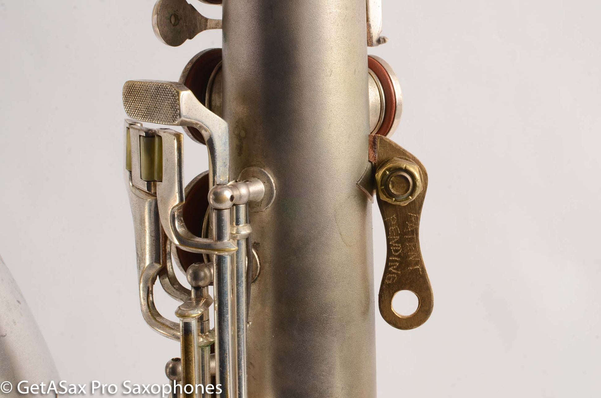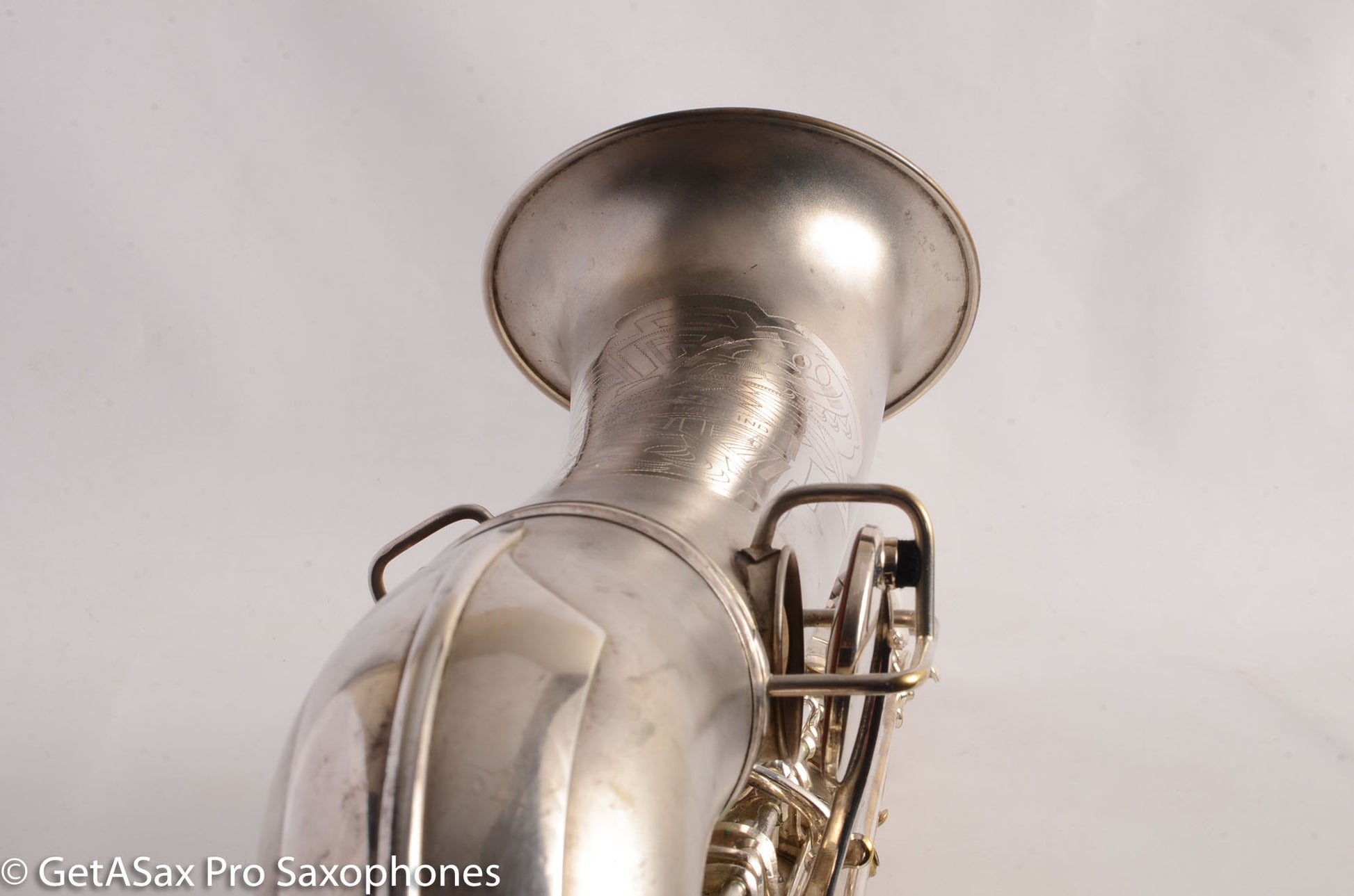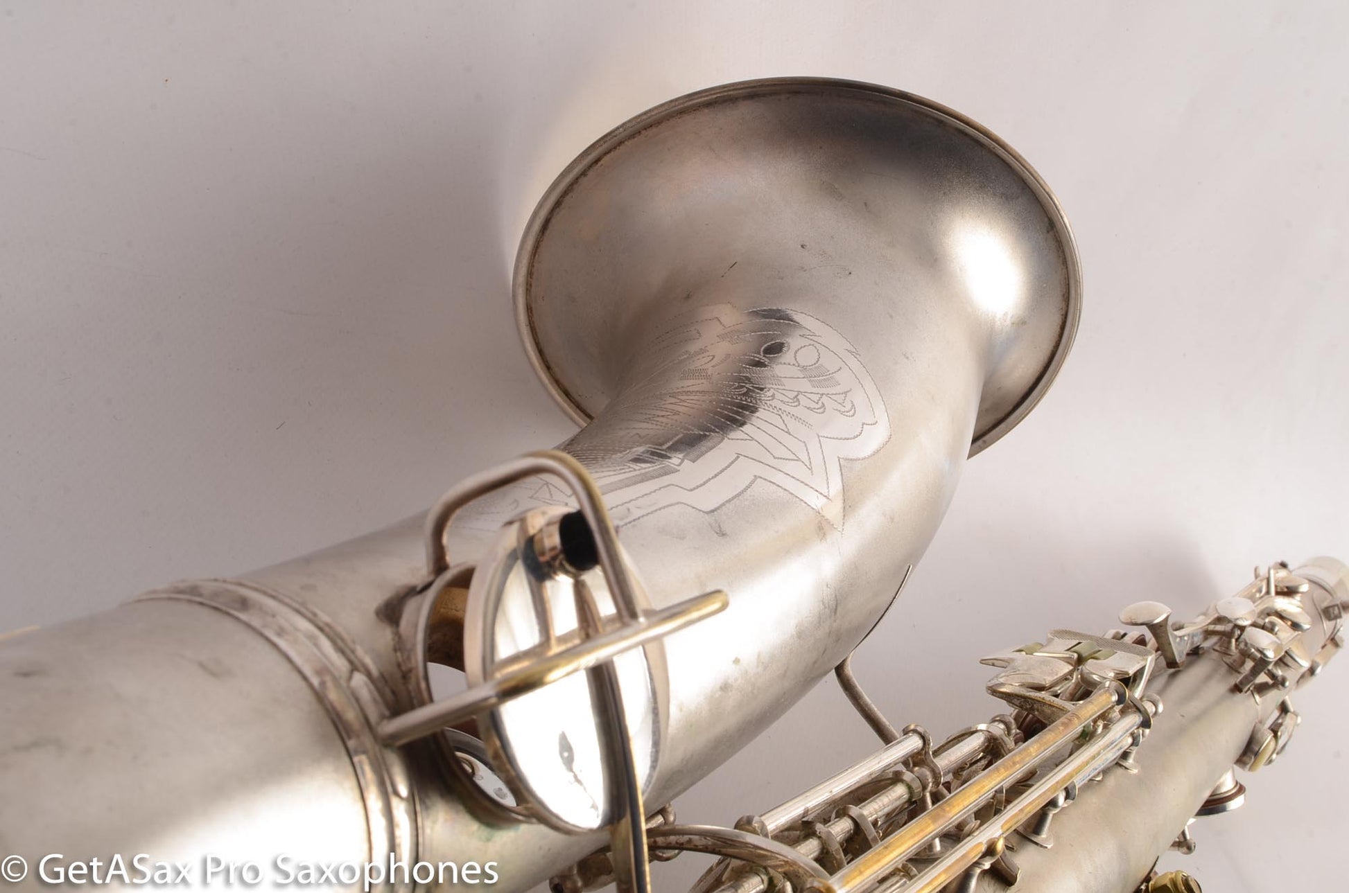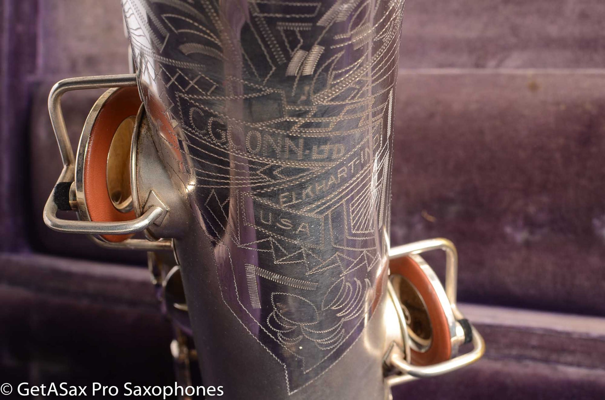 This is a very nice condition Conn New Wonder II tenor, built in 1932, among the earliest of the “transitional” series with art deco engraving and raised side E key. It is in its original silver plate, and has a recent mechanical overhaul on it that was very well done. This tenor is tight and slick and snappy and not mushy under the fingers (as can sometimes happen to Conns with less-than-stellar overhauls) and has the simply unbelievable enormity of tone that even now, after having owned and played about as many saxophones as anyone else, still surprises and delights me when I pick up a Conn. As a repairman friend of mine is fond of saying “I am not prone to hyperbole, but I could go to court and win the case that Conn has the biggest tone.” If you haven’t had a chance to play a 1920s-1930s Conn, you simply haven’t seen all that the saxophone can do. A good Conn is a truly astonishing instrument, and it is easy to see why so many of the professionals of the era favored Conns. If you need to project to the back of a dance hall in the age before amplification, a Conn is the way to go.