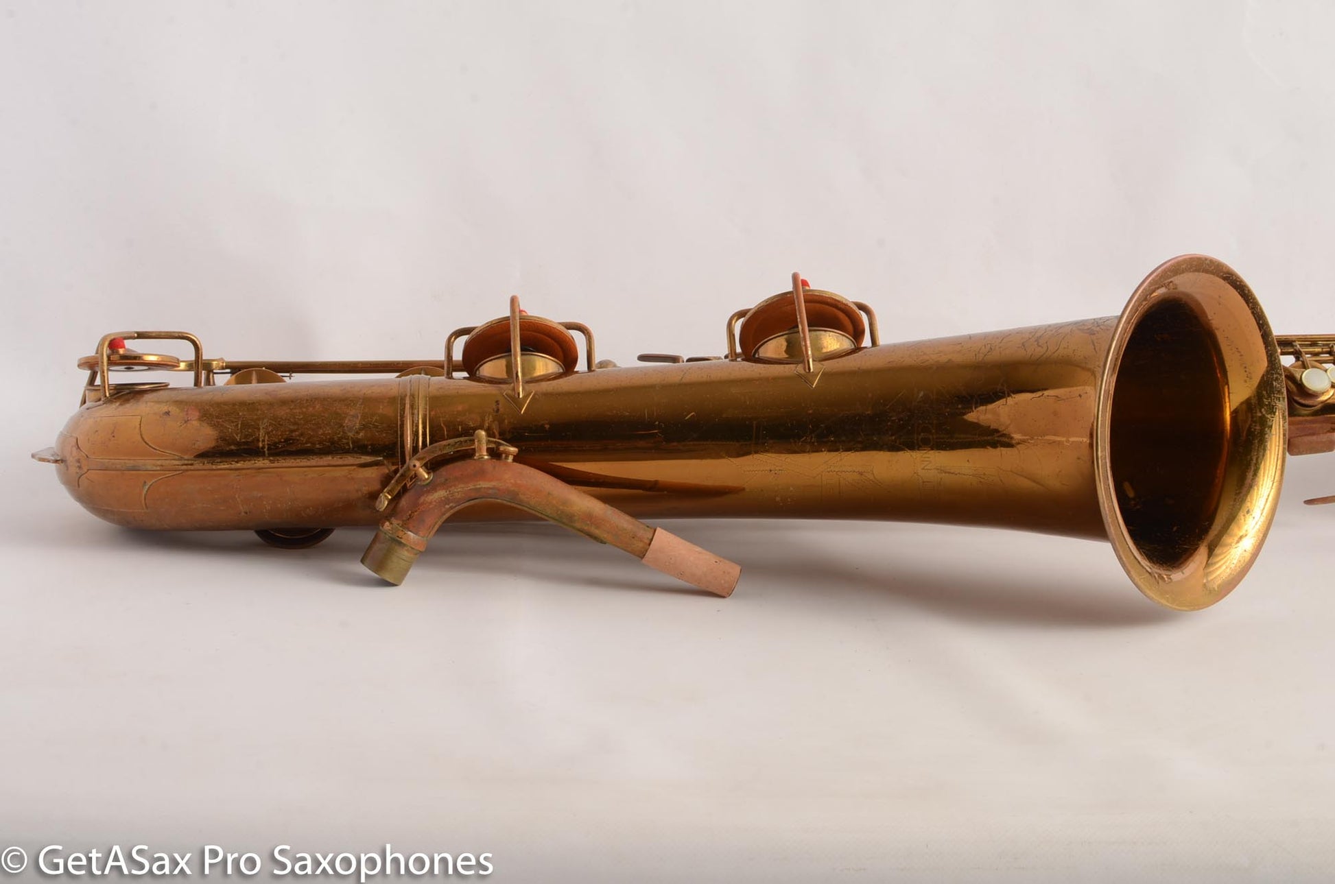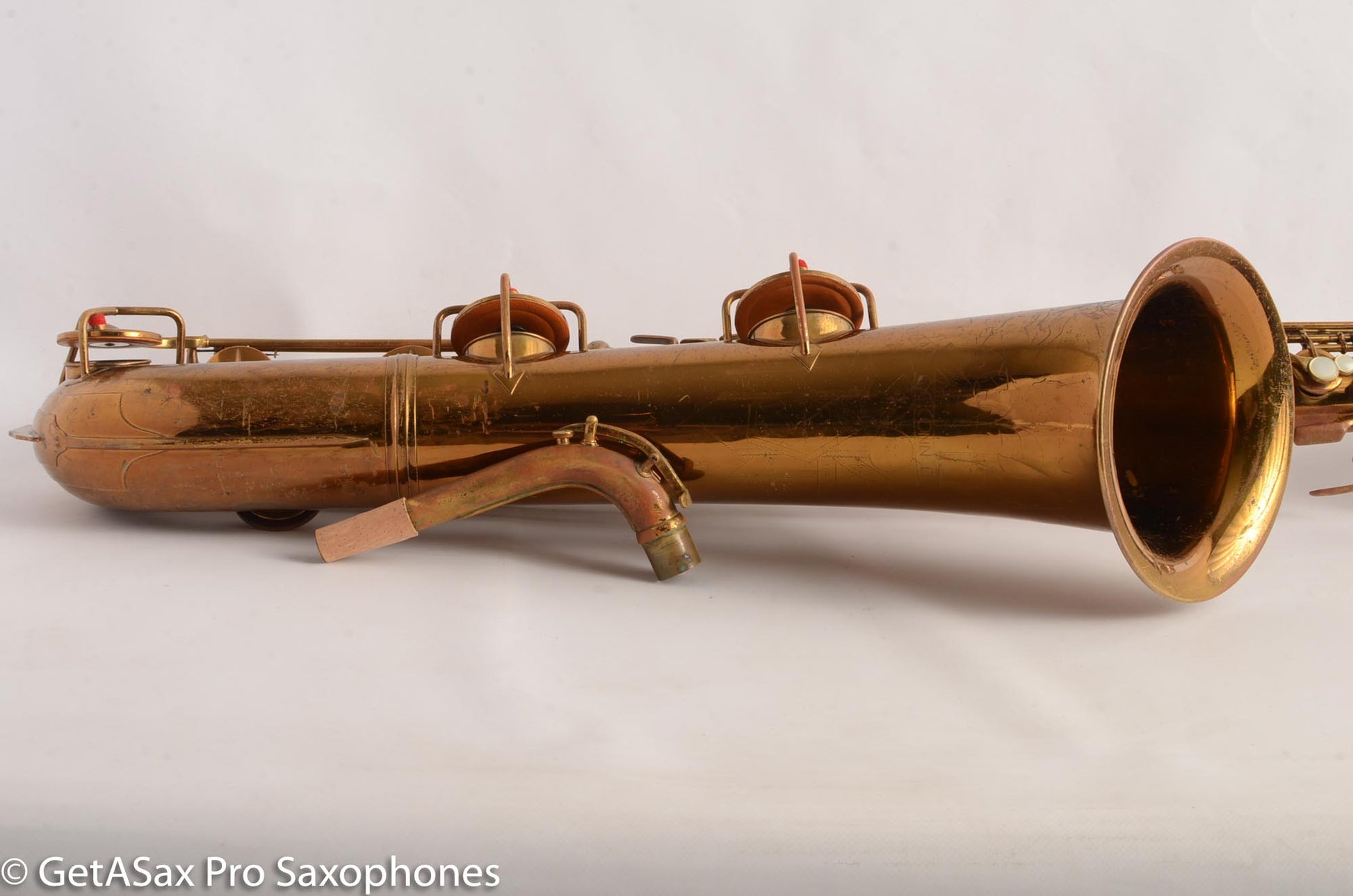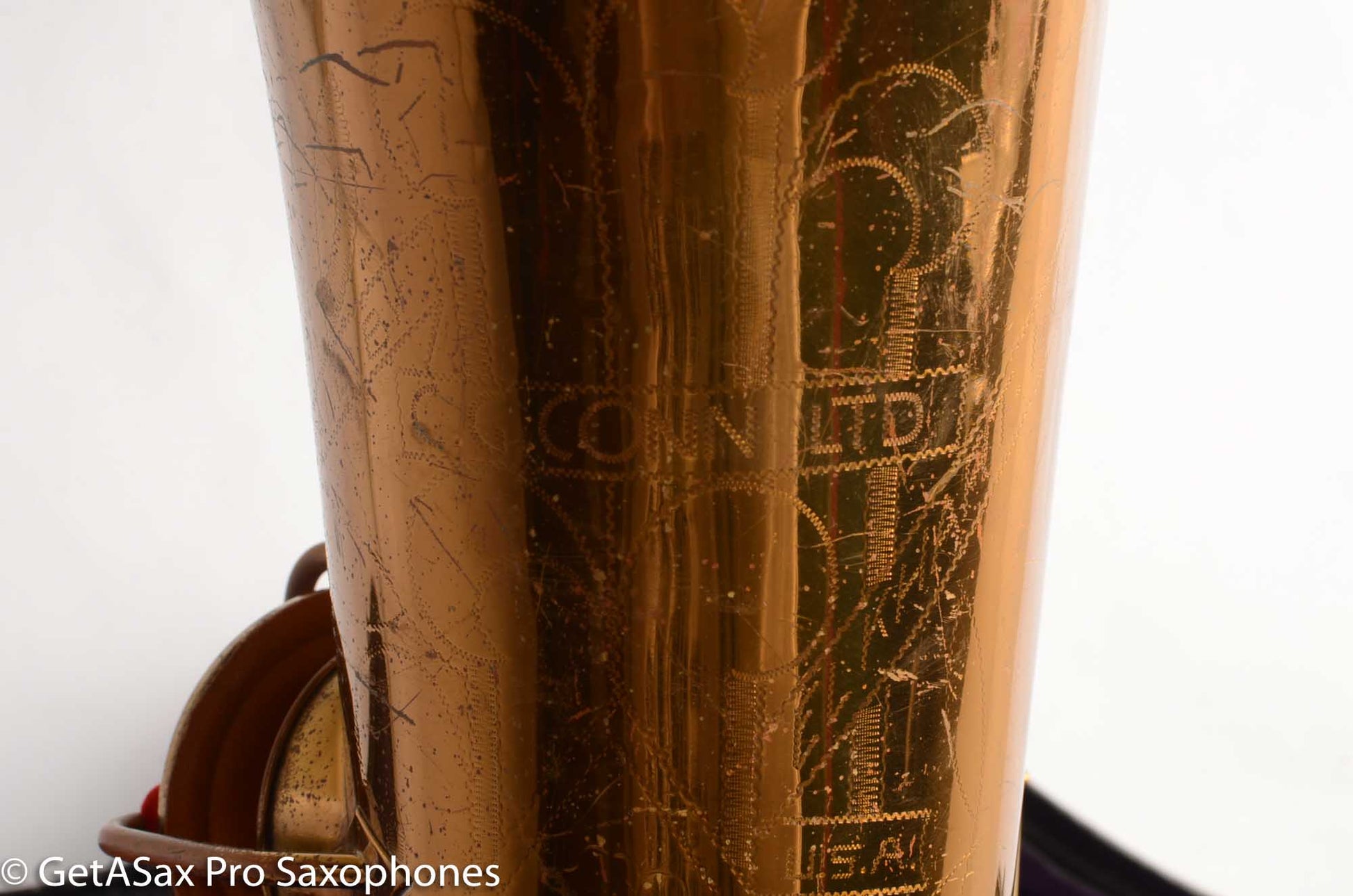 So yes, this 12M may be rather unsalubrious especially in the mighty company of a lot of the rare and special saxes here at GetASax, and perhaps some less scrupulous sellers might refer to it as a “player’s horn”, but I’m gonna tell you what it is: it’s kind of a beater. But it’s got some fight left, and by golly, it’s got tone to spare. This sax has various and numerous dents, dings, resolders, and the neck looks like it got pulled down and possibly a bit sideways as well at some point. But it’s also got all its parts! And it’s mostly straight where its suppose to be, and mostly curved where its supposed to be. And it makes some saxophone noises- big ones. And it’s a freaking Conn 12M transitional and it sounds like one, at least down to low D or so because it needs some padwork. But its cheap, as far as vintage Conn baritones go, and even after some repairs to get it playable you’ll still be coming in at you-got-a-12m-transitional-for-what??? as far as total investment goes. And have I mentioned its a Conn 12M transitional, just like Gerry Mulligan played? And like that grey-muzzled golden, it won’t even complain when you take it to the vet, because it’s been around long enough to know that means love. And that’s all this horn needs- someone to love it, someone to care, someone to play it. Because it’s got plenty of music left in it.