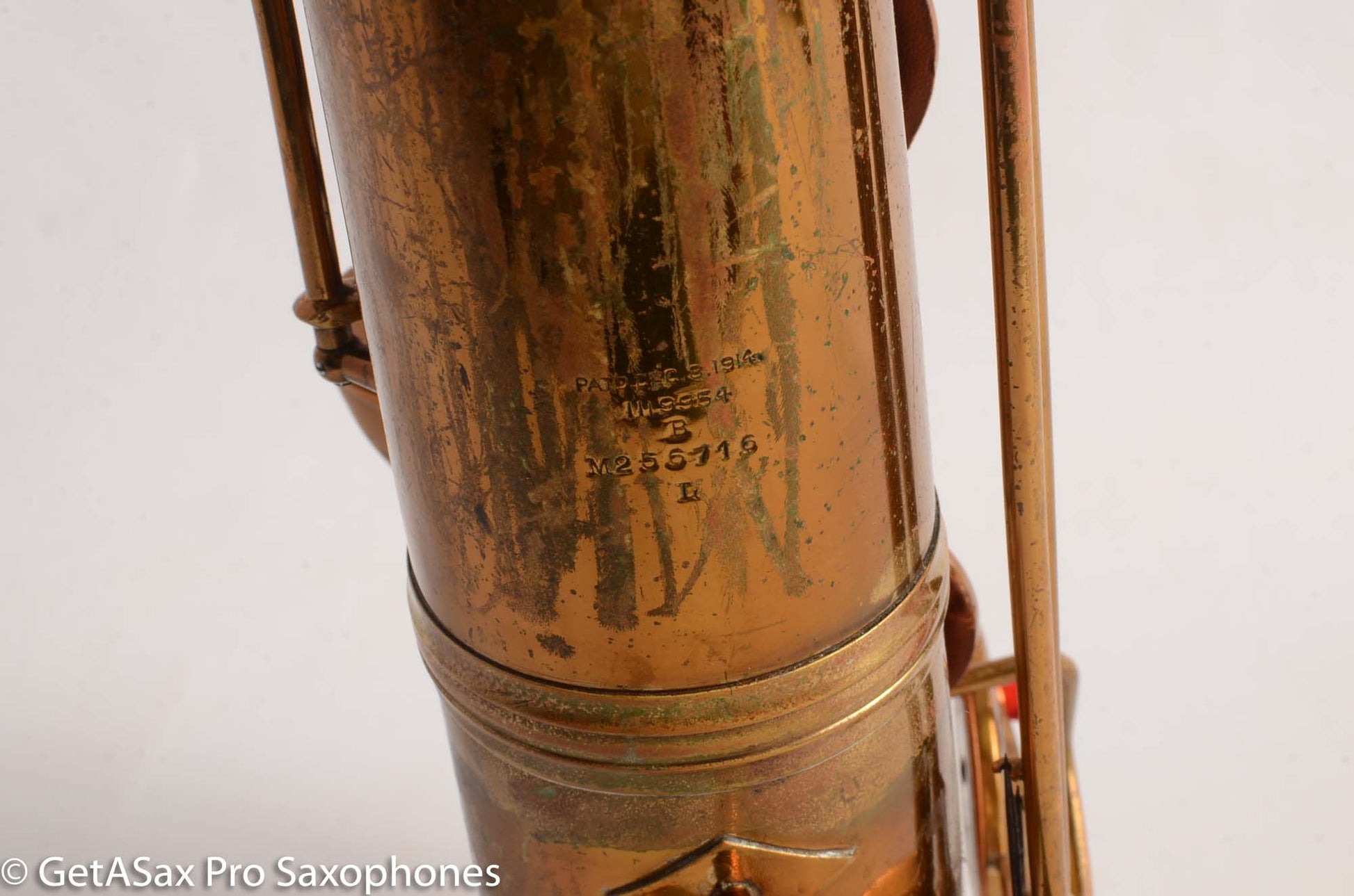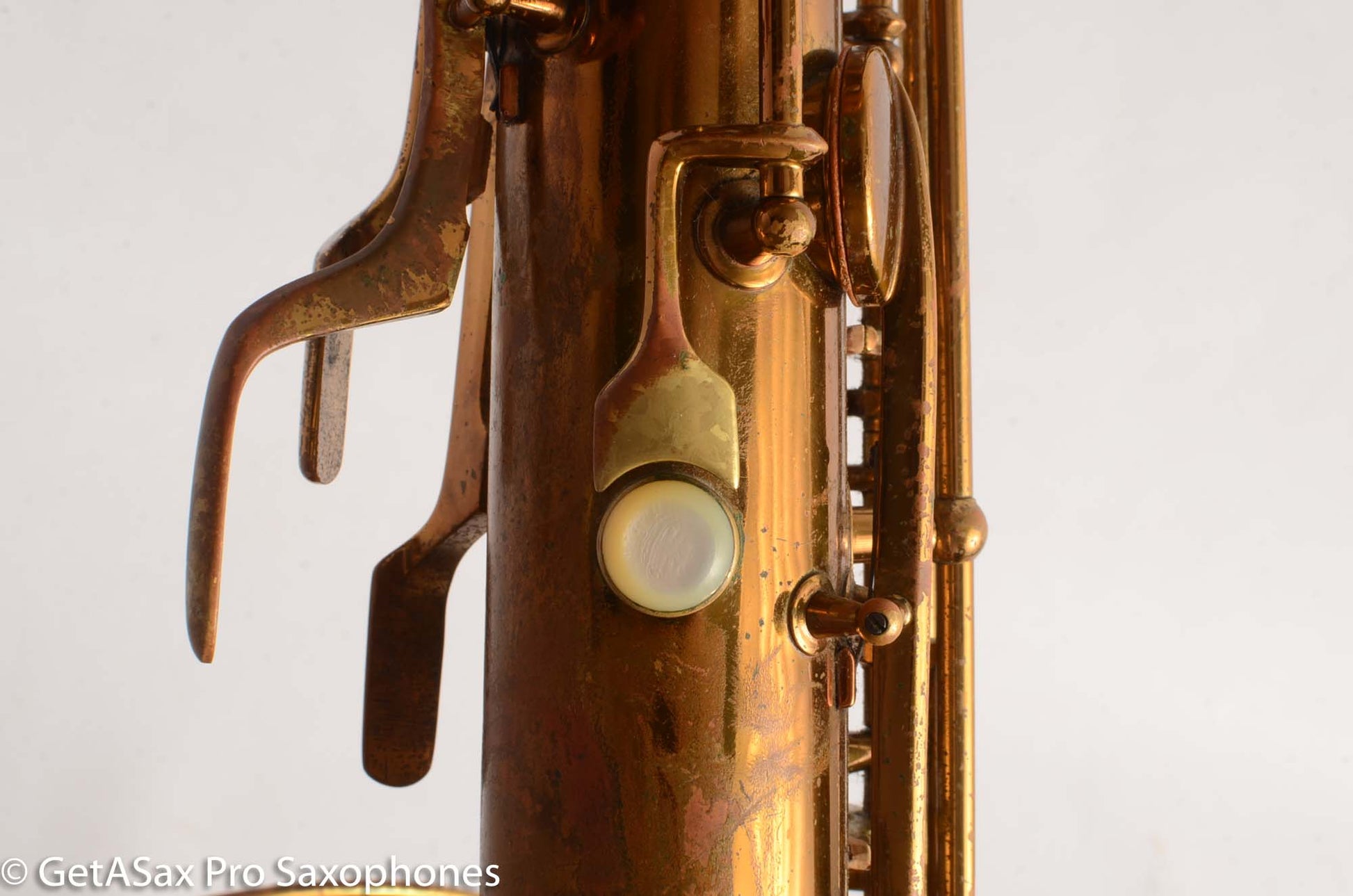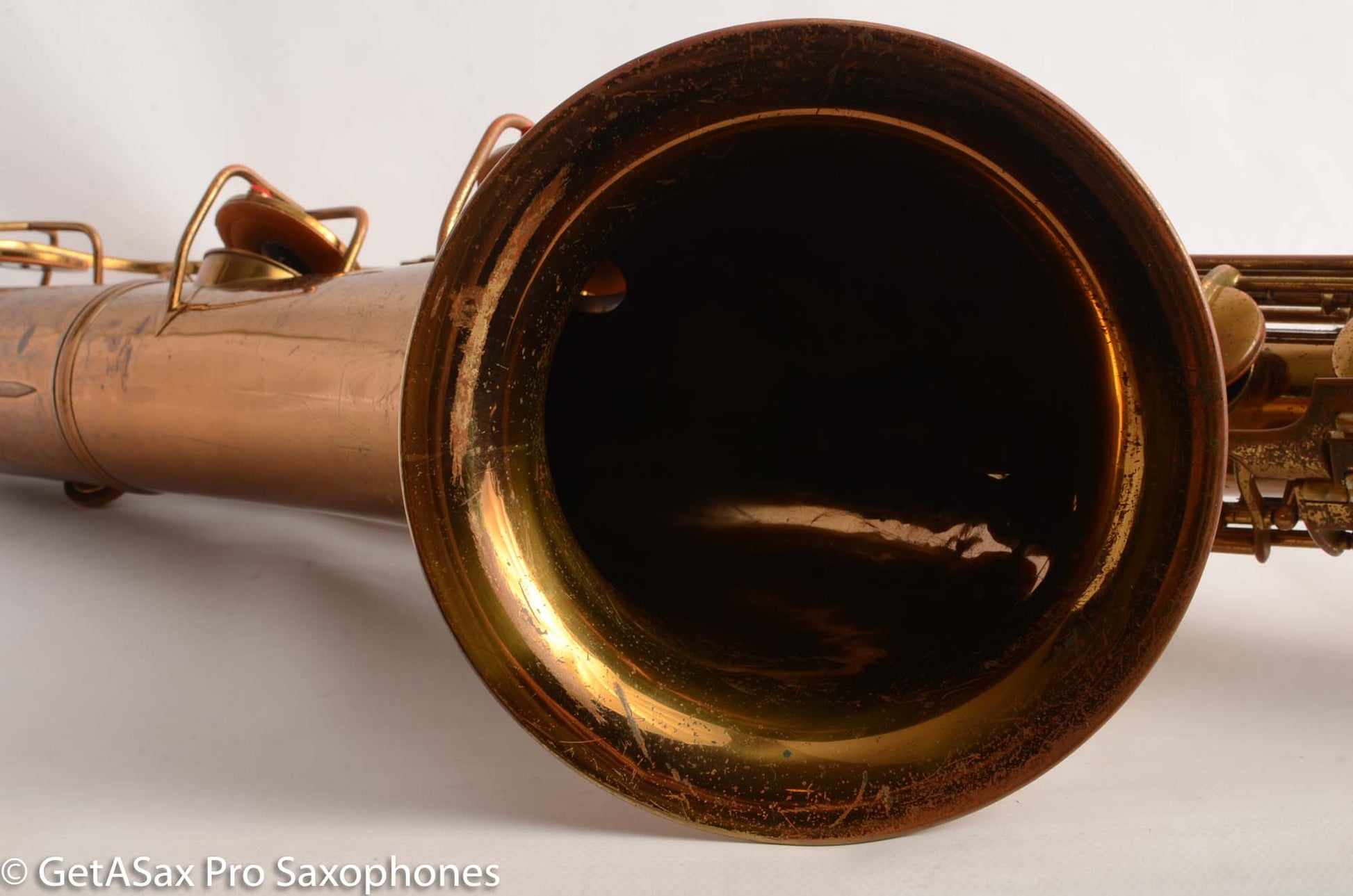 So yes, this 12M may be rather unsalubrious especially in the mighty company of a lot of the rare and special saxes here at GetASax, and perhaps some less scrupulous sellers might refer to it as a “player’s horn”, but I’m gonna tell you what it is: it’s kind of a beater. But it’s got some fight left, and by golly, it’s got tone to spare. This sax has various and numerous dents, dings, resolders, and the neck looks like it got pulled down and possibly a bit sideways as well at some point. But it’s also got all its parts! And it’s mostly straight where its suppose to be, and mostly curved where its supposed to be. And it makes some saxophone noises- big ones. And it’s a freaking Conn 12M transitional and it sounds like one, at least down to low D or so because it needs some padwork. But its cheap, as far as vintage Conn baritones go, and even after some repairs to get it playable you’ll still be coming in at you-got-a-12m-transitional-for-what??? as far as total investment goes. And have I mentioned its a Conn 12M transitional, just like Gerry Mulligan played? And like that grey-muzzled golden, it won’t even complain when you take it to the vet, because it’s been around long enough to know that means love. And that’s all this horn needs- someone to love it, someone to care, someone to play it. Because it’s got plenty of music left in it.