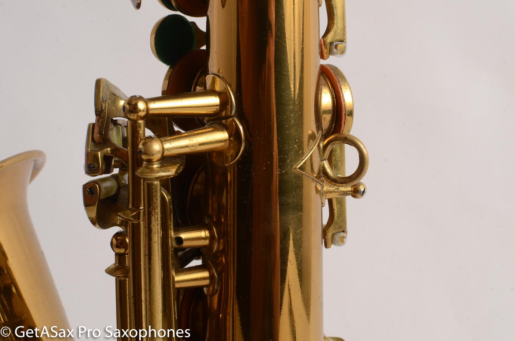 This particular instrument is in extremely good condition with original finish. The engraving, which is very detailed and is particularly dense, is a good indicator of how much use these saxophones have seen, with the lacquer around the cuts tending to be the first to wear on the saxophone. The lacquer around the engraving on this saxophone is fully intact, which combined with only light evidence of playing wear elsewhere on the horn- such as small bit of lacquer wear near the thumbrest about the size of a pea, and some small scratches here and there- leads me to believe this saxophone was played for at least a few years by a meticulous and caring owner. The neck is in excellent condition, showing no evidence of past repair or pulldown.