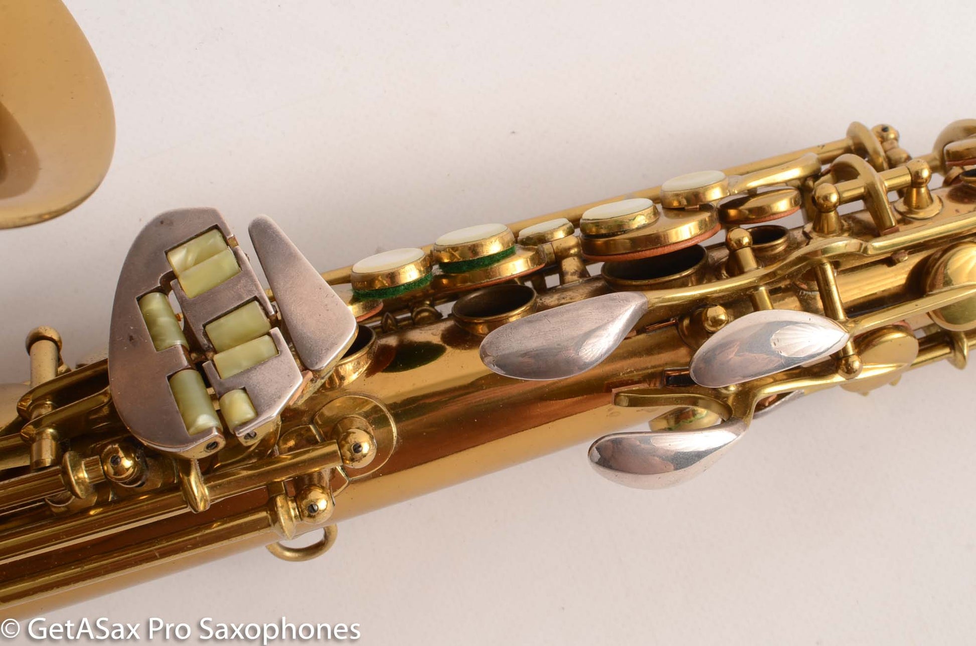 The rollers are fully intact and in perfect condition, and the pearls and sterling silver touchpieces are largely unworn. The keys are tight and the horn plays well on what seems to be an older repad, though the it looks to have been played little and/or taken very good care of since the repad. The neck and body are both marked with the VIII stamp, which is viewed as the most desirable of the pre-war M series saxophones, although theories vary widely as to what exactly the VIII stamp means, the most popular of which being that the neck had a slightly different taper that intonates better. The microtuner on the is fully functional, leak-free, and smooth. The body shows so evidence of past damage or major repairs/resolders of any kind.