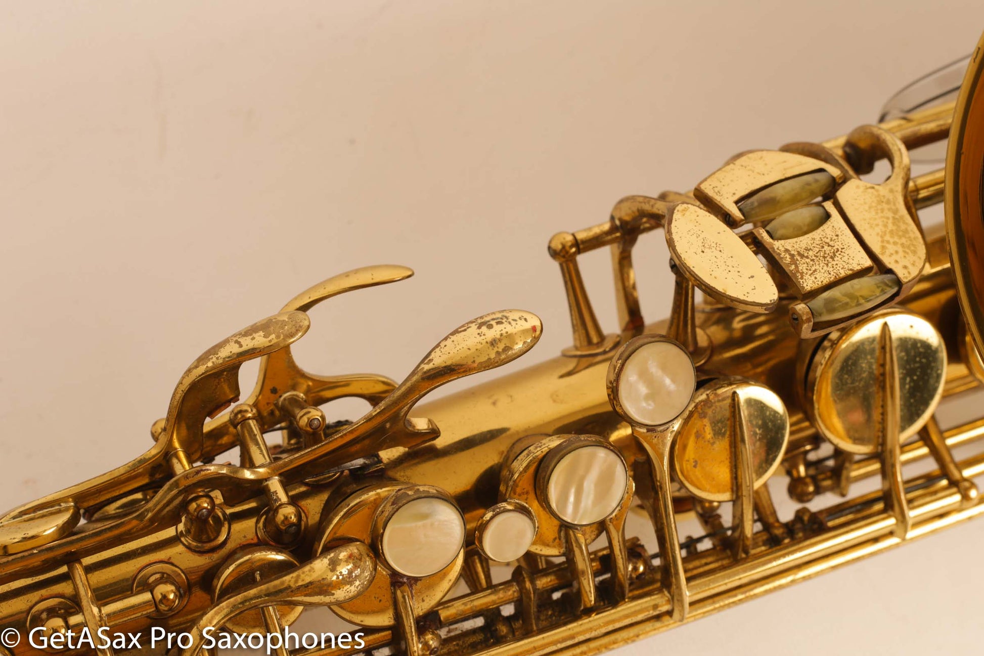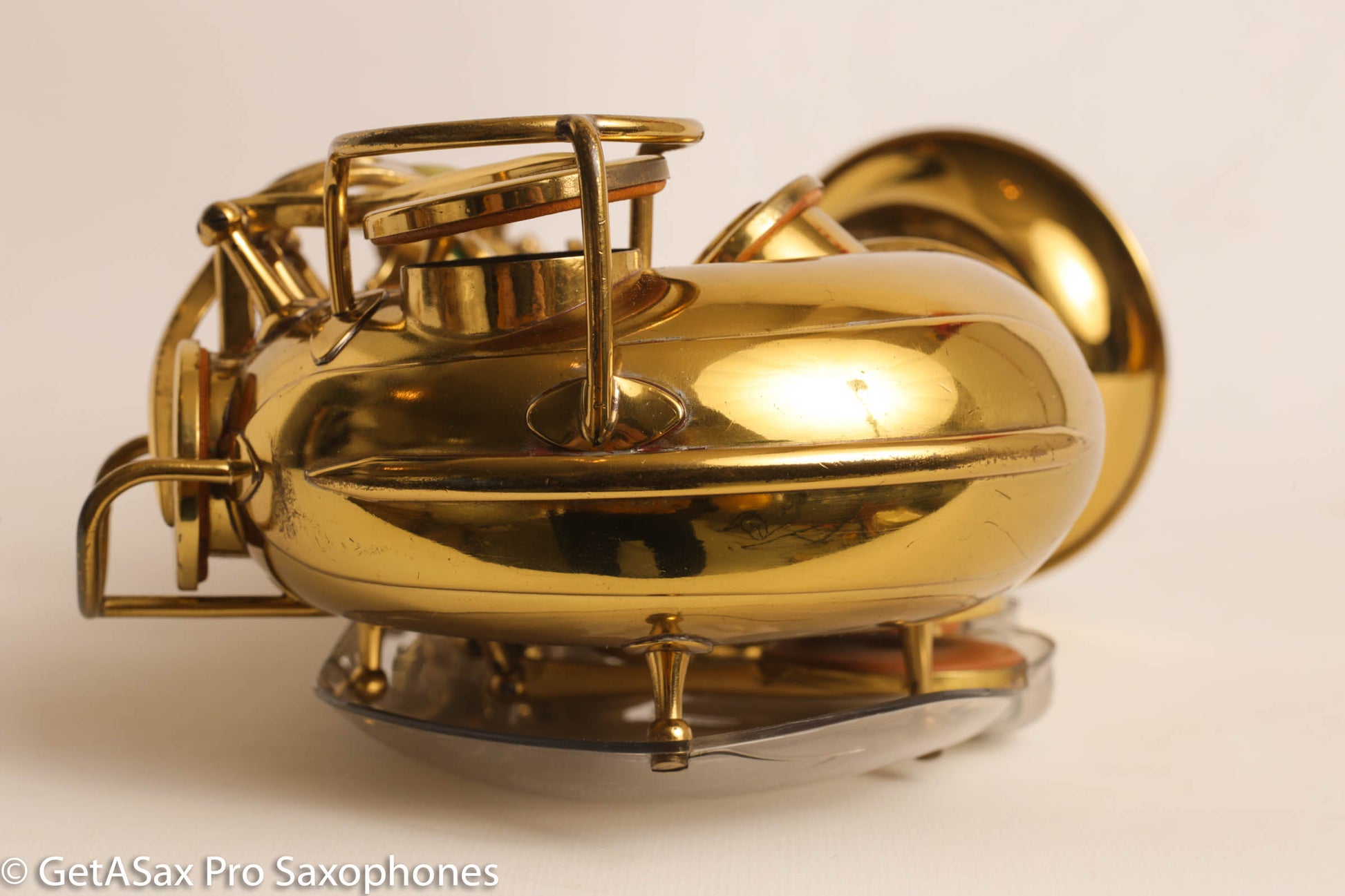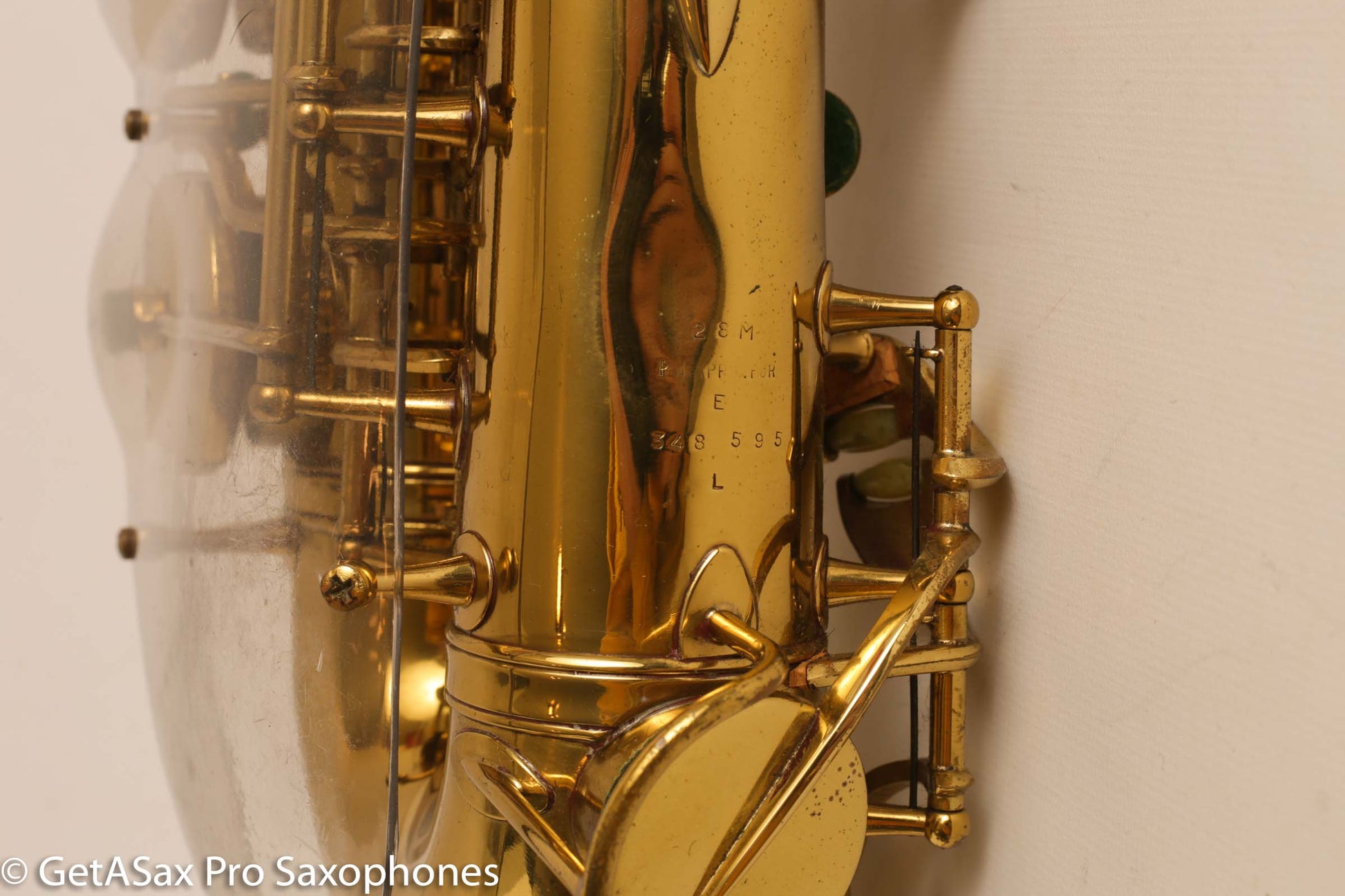Bargain price on a beautiful Conn Connstellation 28M alto. This is Conn’s last great innovation in alto saxophones, and it should be a part of any good collection of American saxophones. The 28M features improved octave key mechanism and design, a beautiful tone, double socket neck, and the space age plastic pants guard. This one looks like a factory relacquer and I got the pants guard custom made so that it’s a new one without any cracks or chips. The pads are older, but the horn is otherwise in great shape. It includes the original 28M hard case as well! Priced to move. Only one available!