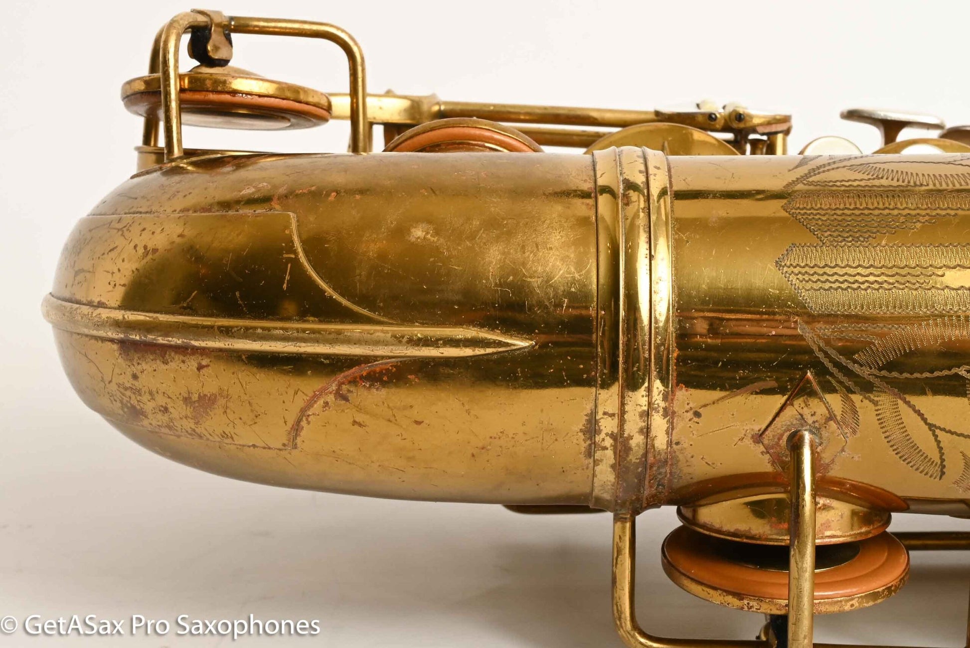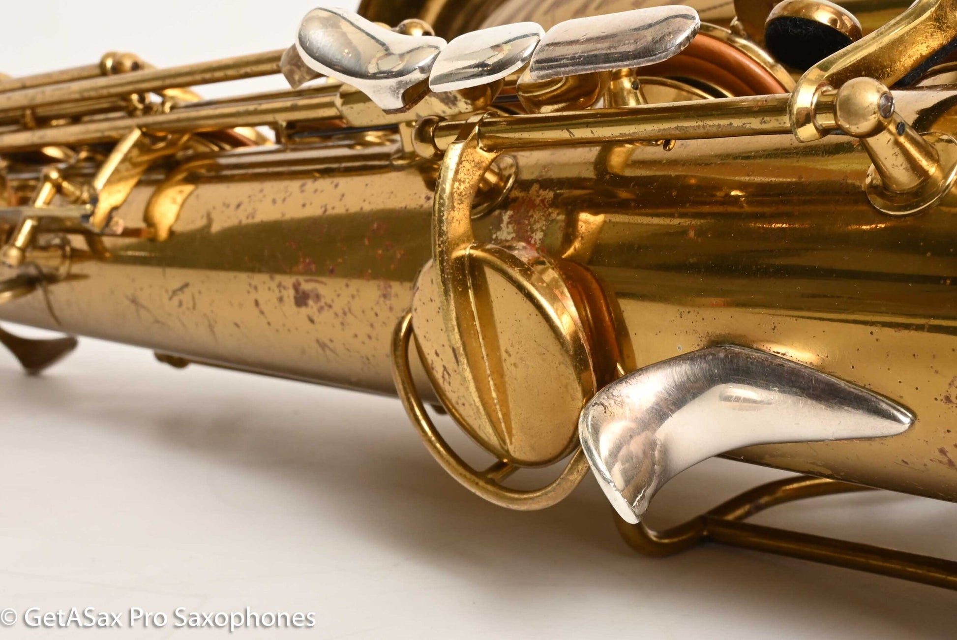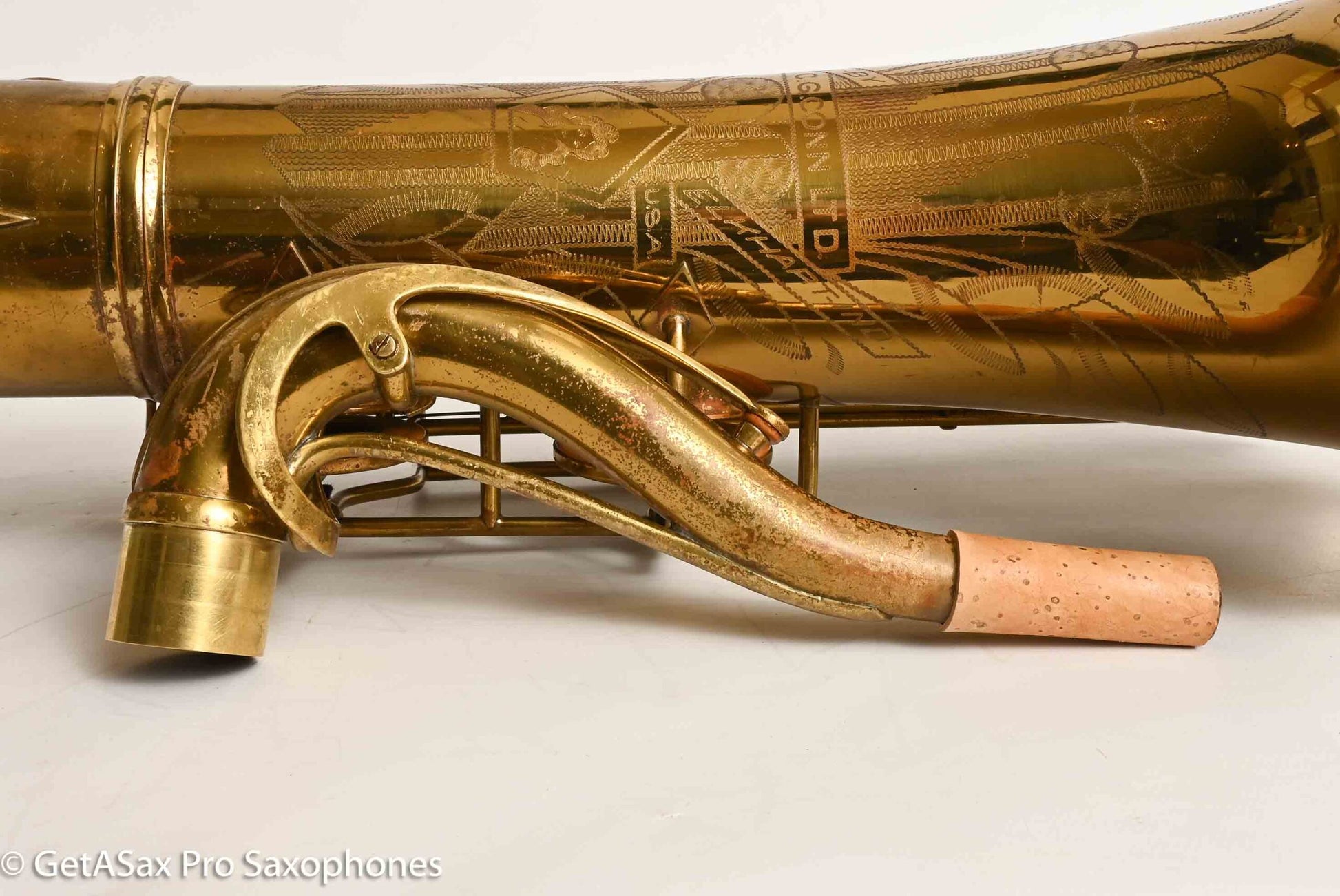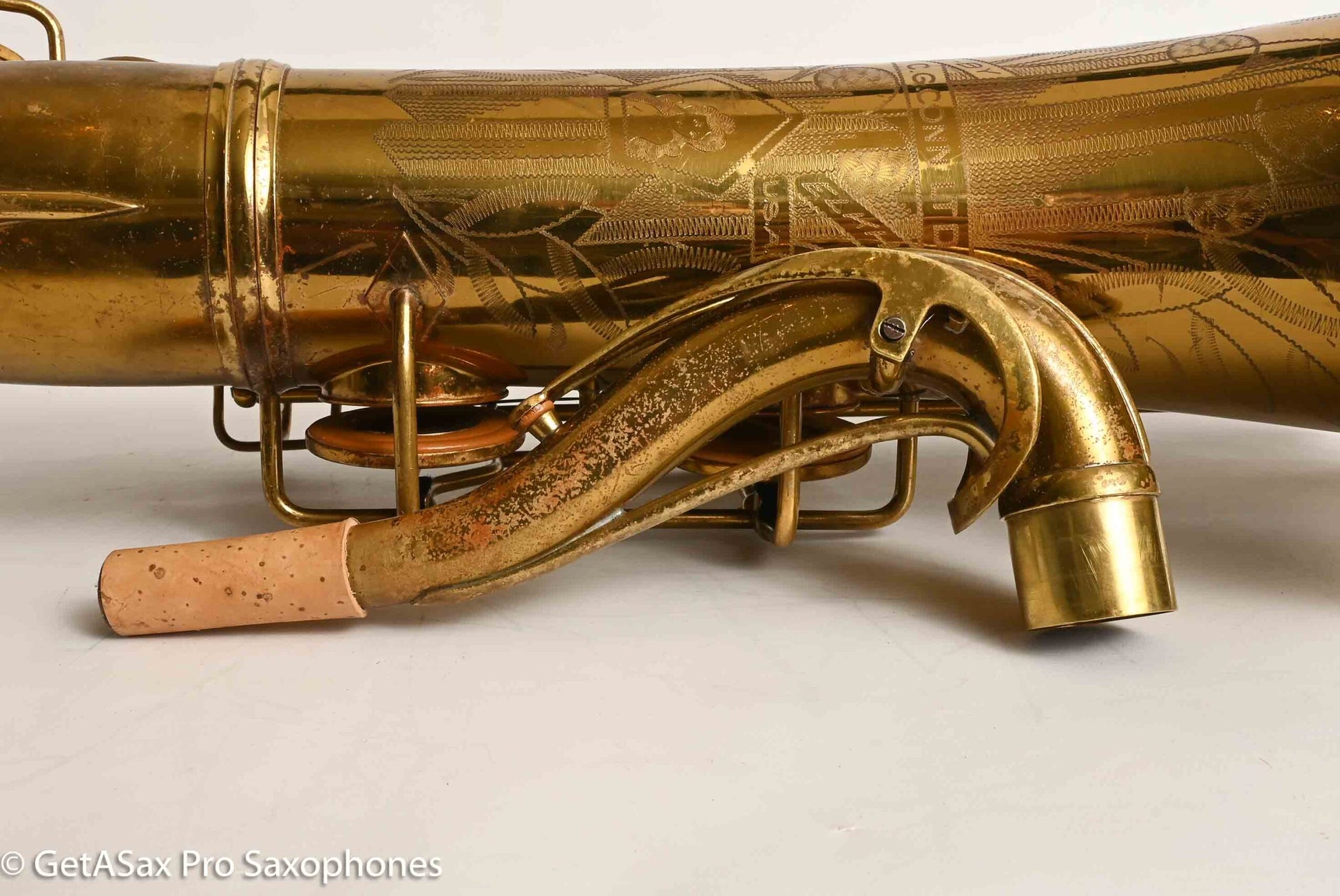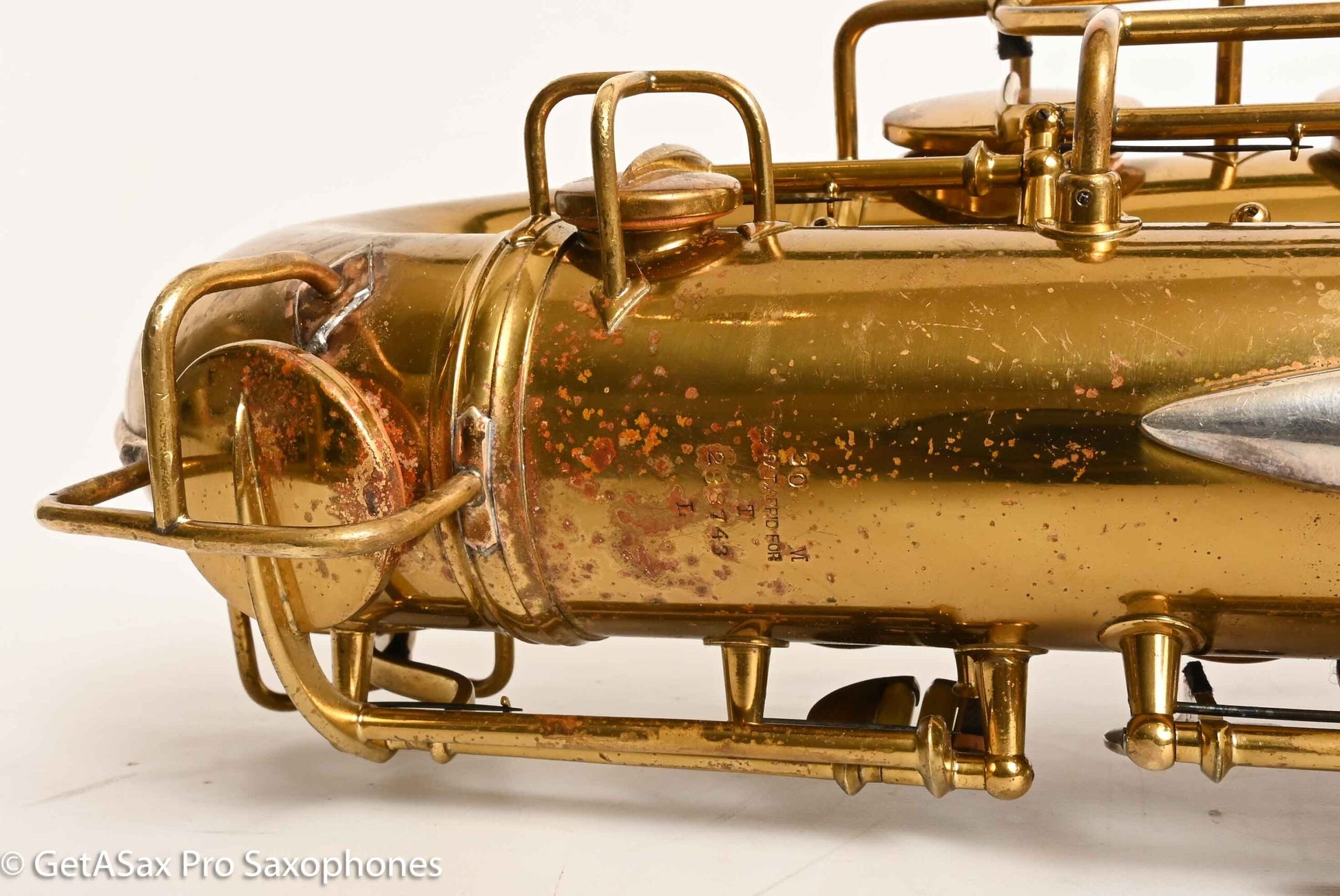 The other features that make a 30M special are the fancy neck octave key, the redesigned ‘flatter’ left hand pinky table (which Matt sets up to be really nice and snappy), and the solid silver pieces on every key touch that isn’t already pearl. The engraving is also about twice as extensive as the standard 10M pattern, so everything about the horn is as deluxe as Conn could make it. This particular horn was one owner, and I promised to get it completely restored when I agreed to buy it, so that’s what it got. There were some dents removed from the back of the bow, and a couple of small ones removed from the neck. The keywork is all snug and snappy, and the neck fit is nice and even, so it’s just great mechanically. You can get a sense of the tone in Tyler’s video below (He’s using a Rigotti Gold 3 Medium reed, and a GS SLANT tenor 7* mouthpiece.). It has a warm, powerful voice and also tunes great and feels comfortable under the fingers. It has been played a good amount, but it’s now ready for its next several decades of loving ownership, after having been restored back to top playing condition. If you want a Conn 30M that does everything well and is totally ready to go, and that is original lacquer, this is the one for you.