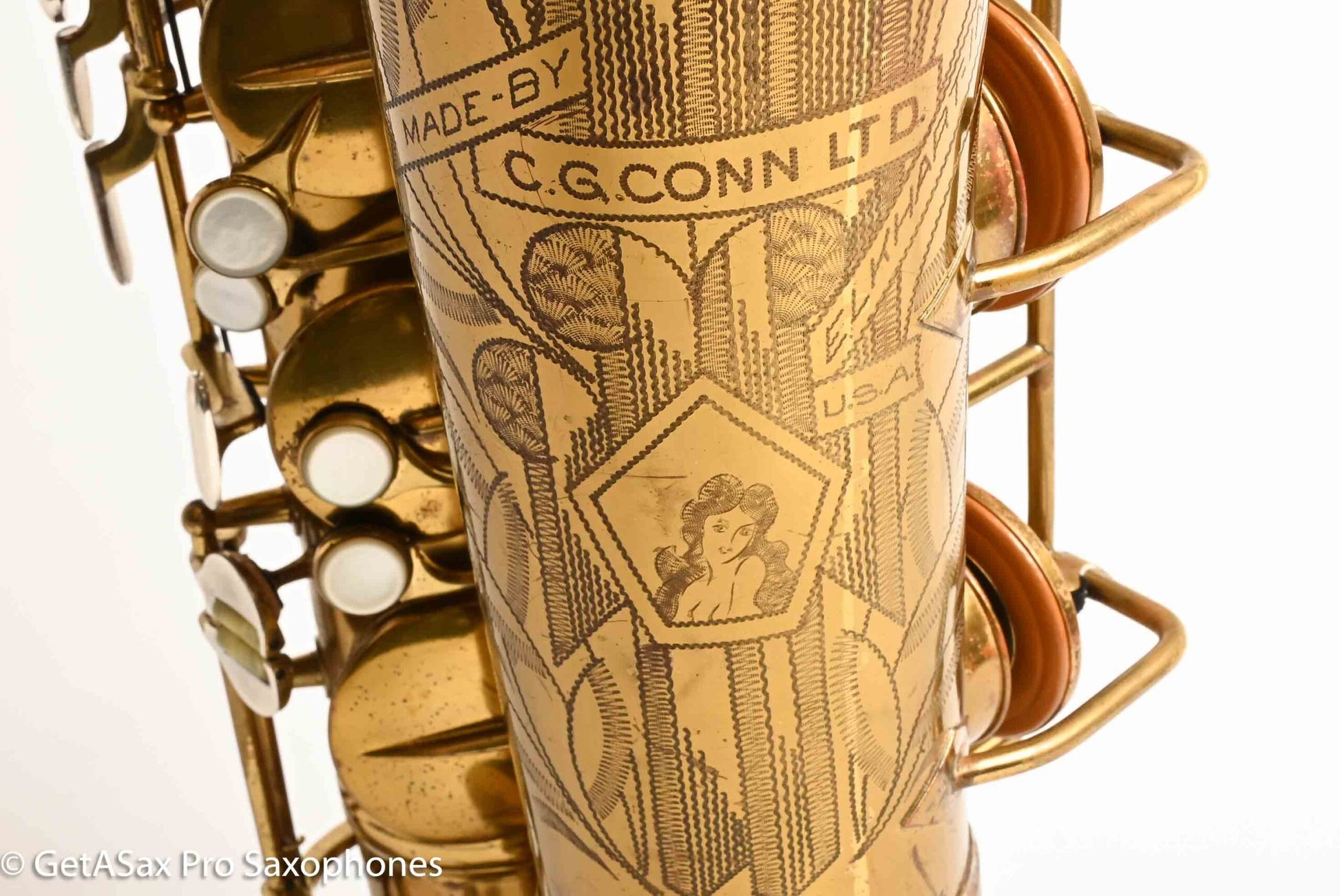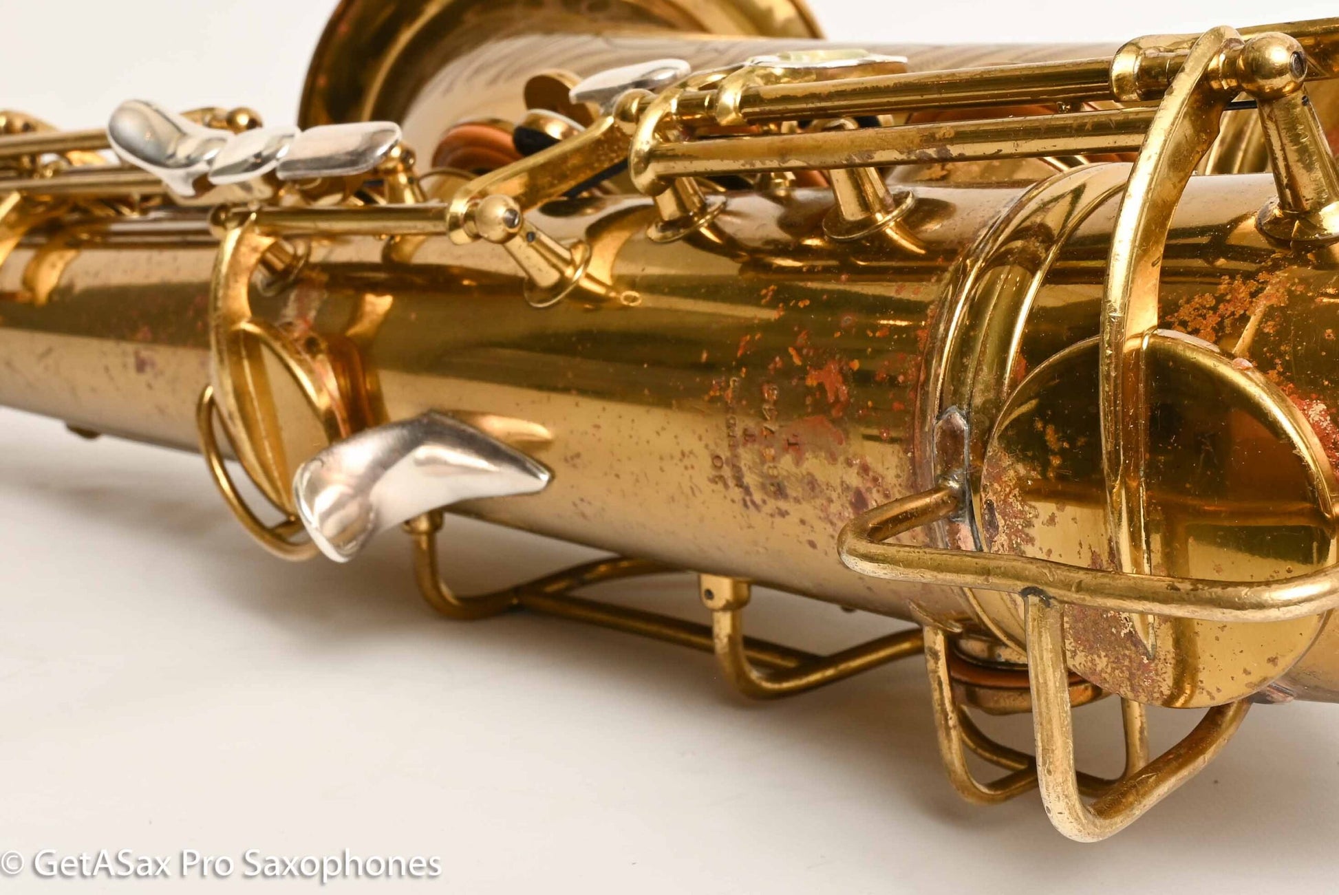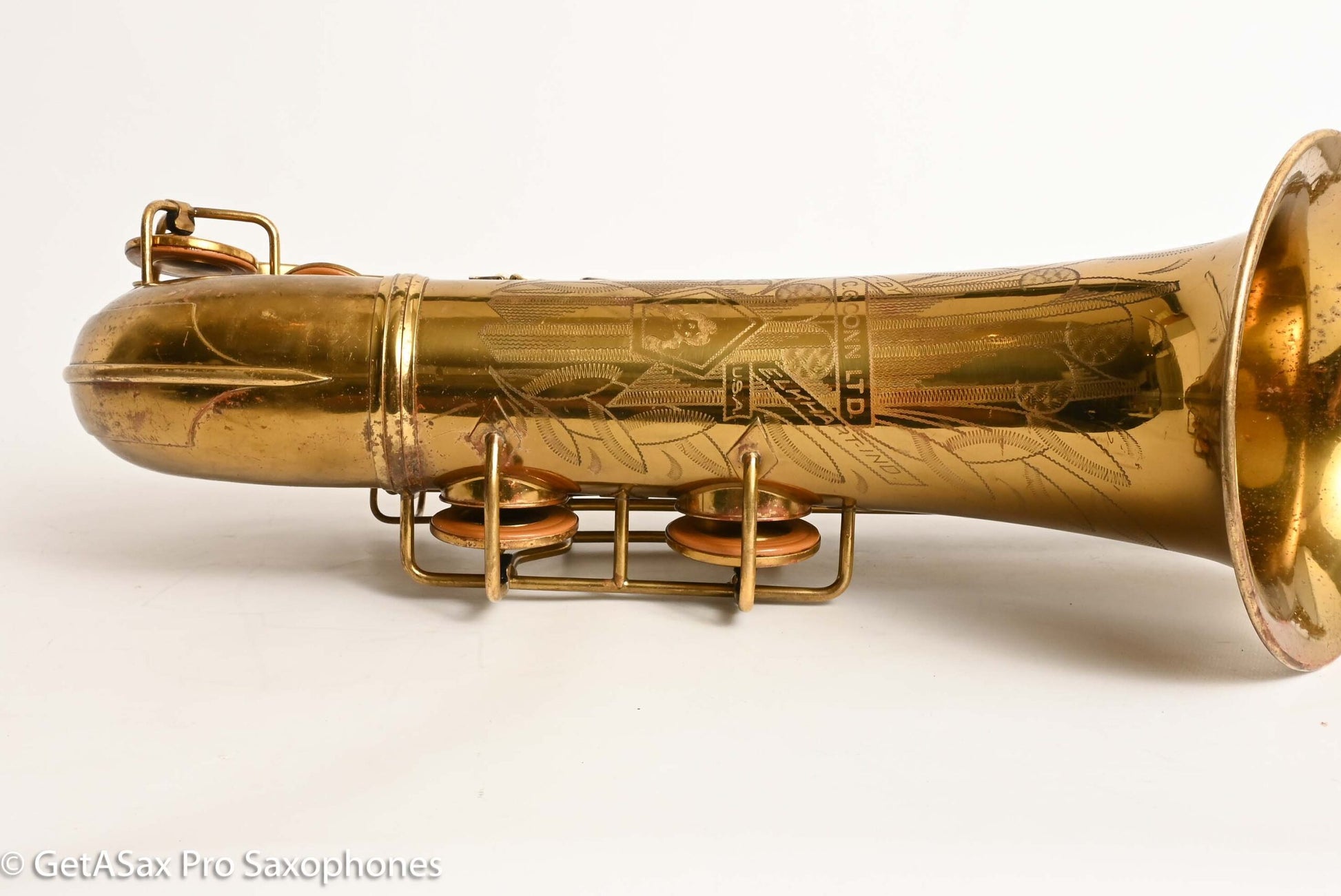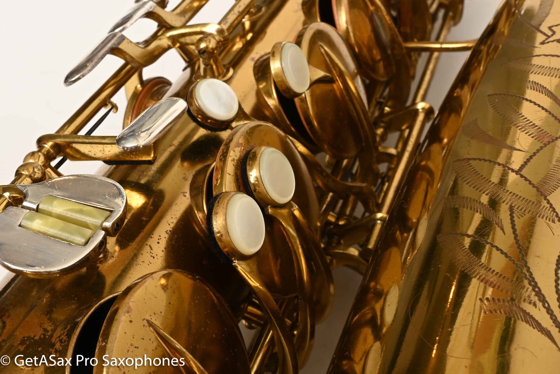The other features that make a 30M special are the fancy neck octave key, the redesigned ‘flatter’ left hand pinky table (which Matt sets up to be really nice and snappy), and the solid silver pieces on every key touch that isn’t already pearl. The engraving is also about twice as extensive as the standard 10M pattern, so everything about the horn is as deluxe as Conn could make it. This particular horn was one owner, and I promised to get it completely restored when I agreed to buy it, so that’s what it got. There were some dents removed from the back of the bow, and a couple of small ones removed from the neck. The keywork is all snug and snappy, and the neck fit is nice and even, so it’s just great mechanically. You can get a sense of the tone in Tyler’s video below (He’s using a Rigotti Gold 3 Medium reed, and a GS SLANT tenor 7* mouthpiece.). It has a warm, powerful voice and also tunes great and feels comfortable under the fingers. It has been played a good amount, but it’s now ready for its next several decades of loving ownership, after having been restored back to top playing condition. If you want a Conn 30M that does everything well and is totally ready to go, and that is original lacquer, this is the one for you.