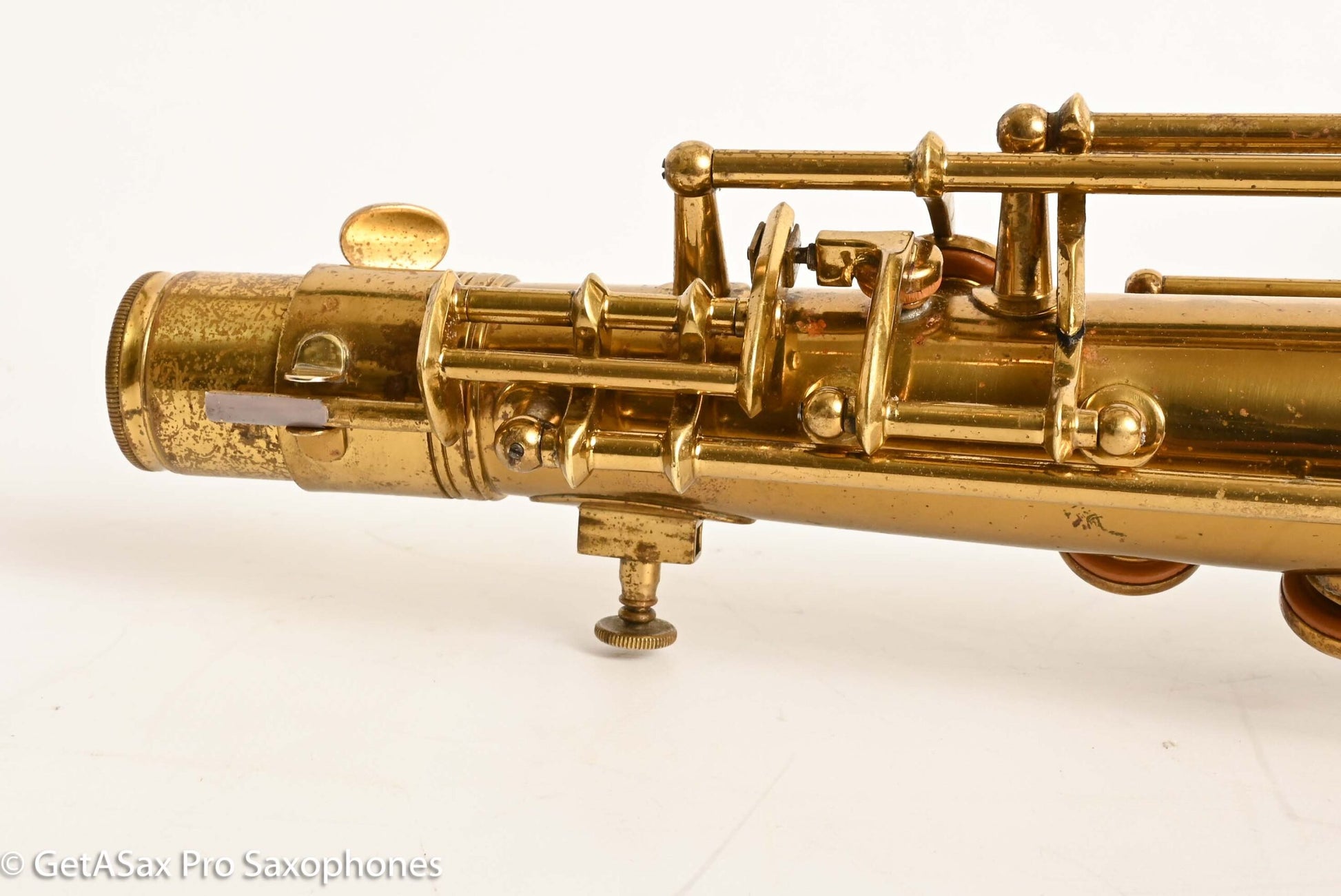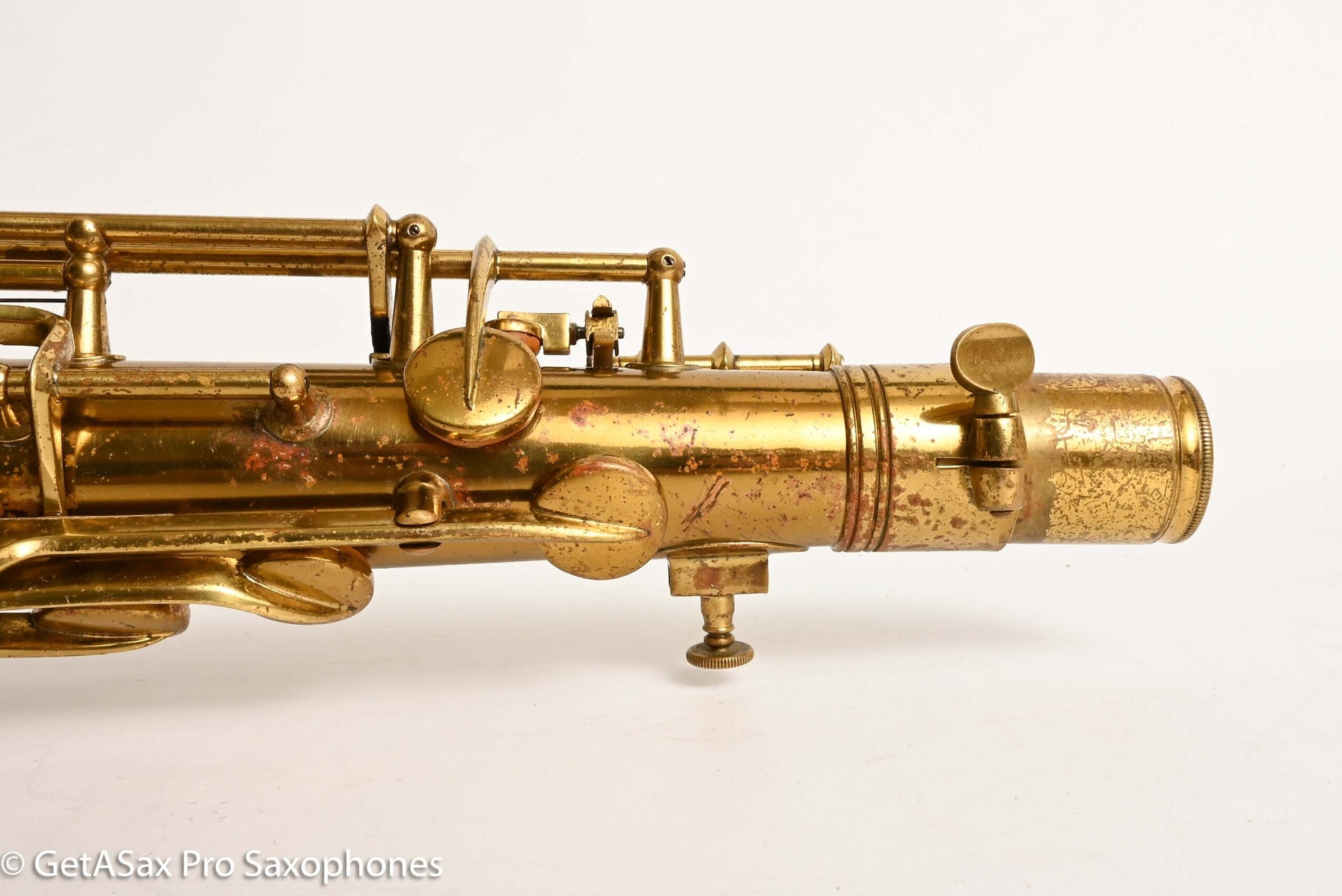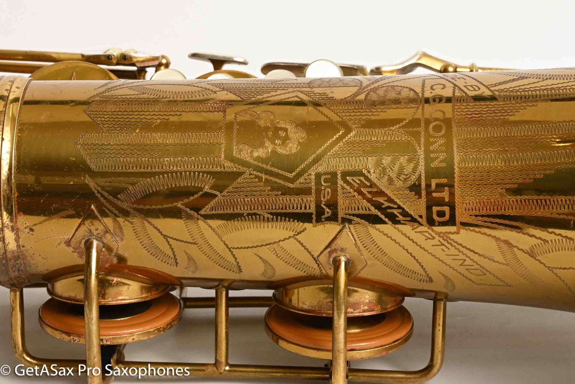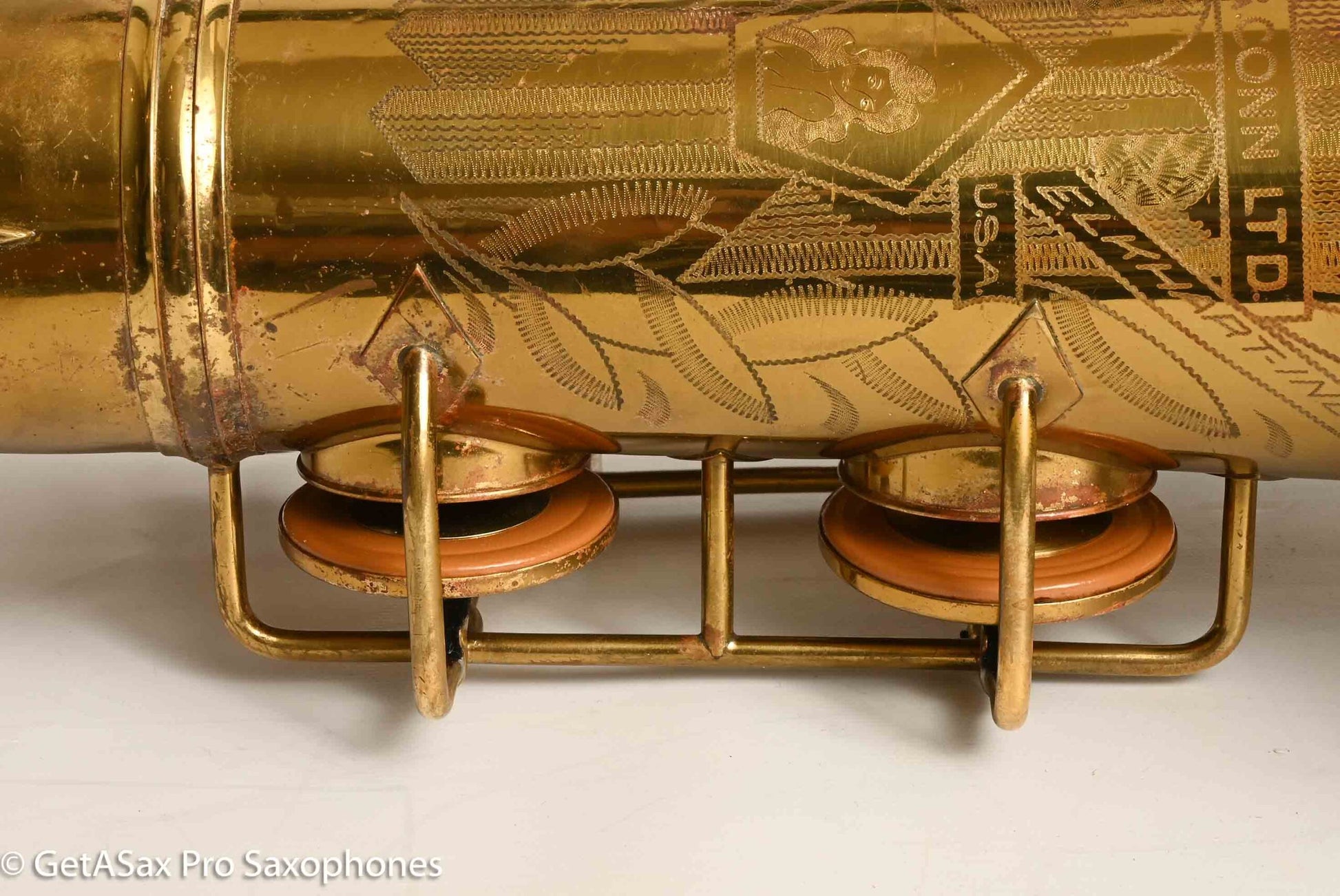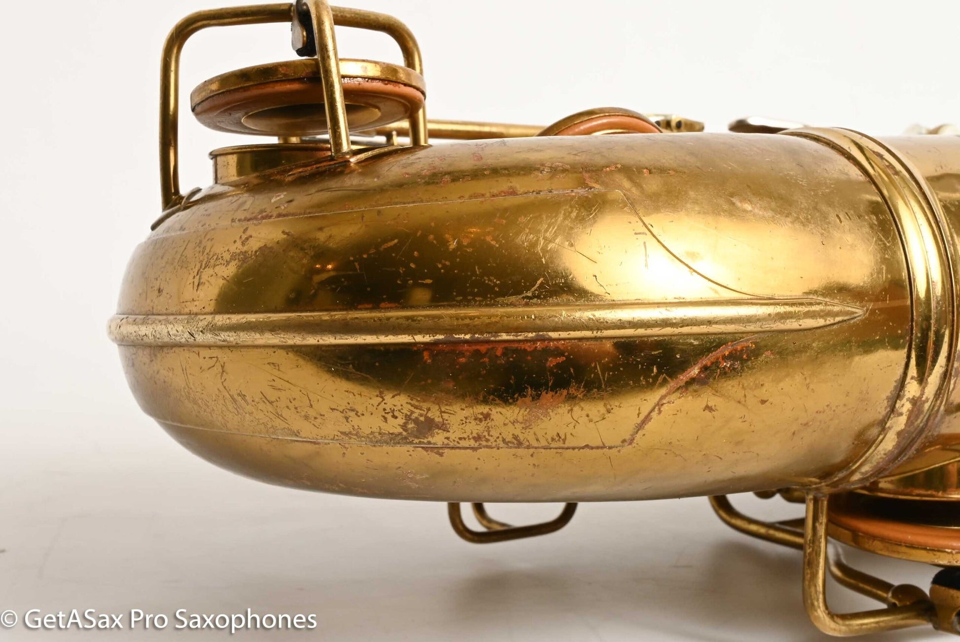 The other features that make a 30M special are the fancy neck octave key, the redesigned ‘flatter’ left hand pinky table (which Matt sets up to be really nice and snappy), and the solid silver pieces on every key touch that isn’t already pearl. The engraving is also about twice as extensive as the standard 10M pattern, so everything about the horn is as deluxe as Conn could make it. This particular horn was one owner, and I promised to get it completely restored when I agreed to buy it, so that’s what it got. There were some dents removed from the back of the bow, and a couple of small ones removed from the neck. The keywork is all snug and snappy, and the neck fit is nice and even, so it’s just great mechanically. You can get a sense of the tone in Tyler’s video below (He’s using a Rigotti Gold 3 Medium reed, and a GS SLANT tenor 7* mouthpiece.). It has a warm, powerful voice and also tunes great and feels comfortable under the fingers. It has been played a good amount, but it’s now ready for its next several decades of loving ownership, after having been restored back to top playing condition. If you want a Conn 30M that does everything well and is totally ready to go, and that is original lacquer, this is the one for you.