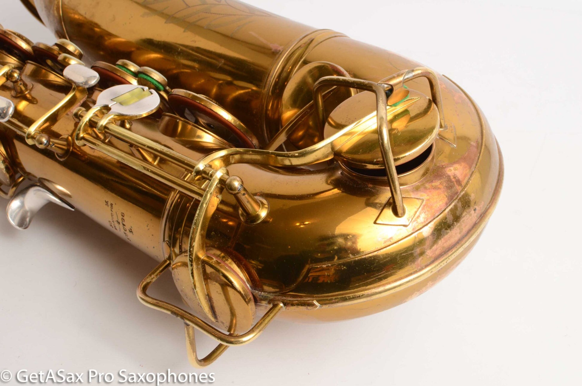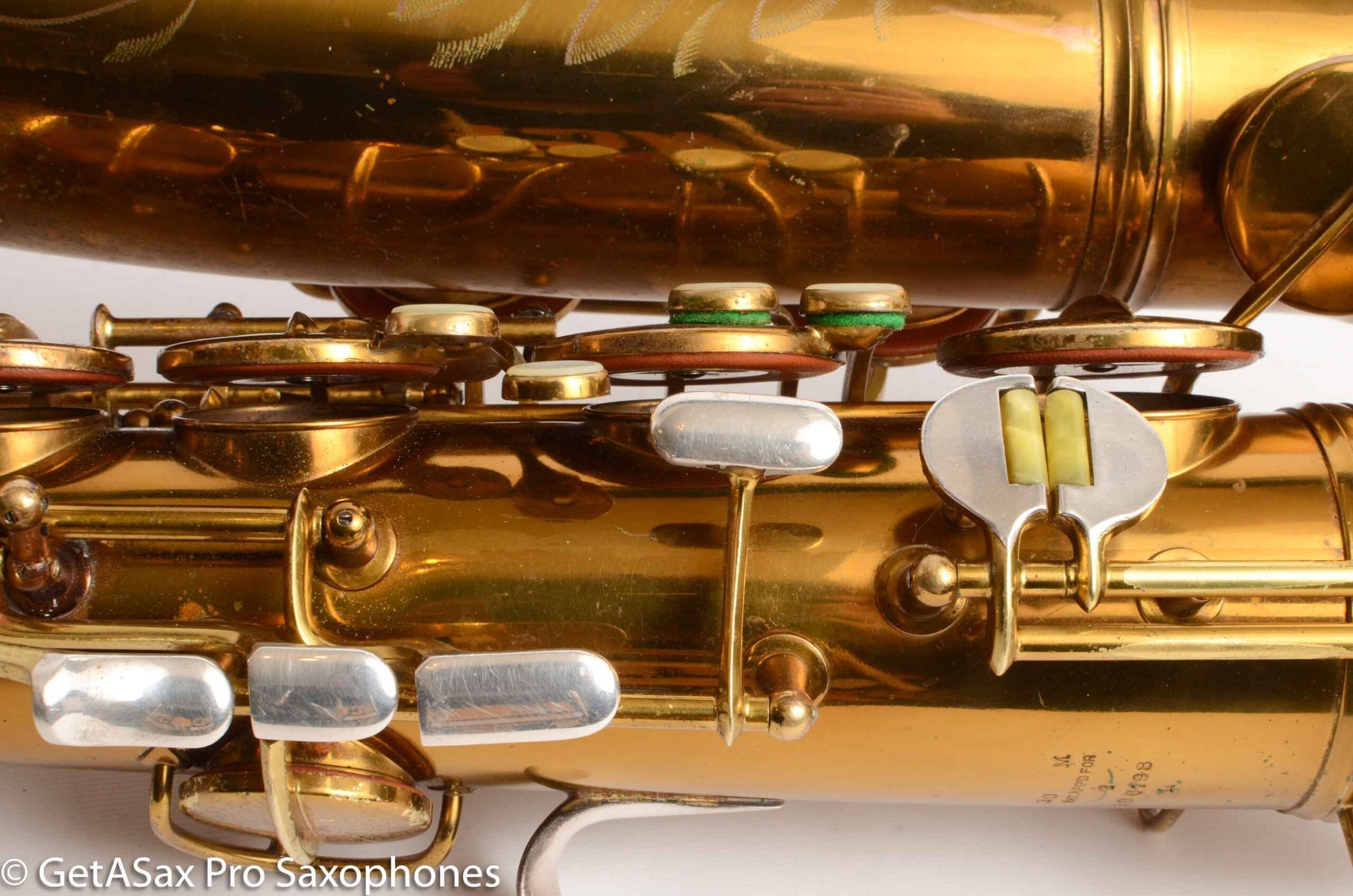 This is a rare and deluxe Conn 30M Connqueror tenor saxophone from 1941, which is one of the best years for Conn saxophones. This tenor has original lacquer and all the crazy extra features that set the ‘Connqueror’ saxophones apart. They’re some of the coolest of all vintage saxophones– everything you touch on the keys is either thick solid silver inlay or mother of pearl. The engraving is deluxe – more than double what is on a 10M, and the keywork is entirely redesigned. The cool thing about the Conn 30M keywork is the ‘permadjust’ mechanism. The big idea here is that once you get the horn correctly setup, all the adjustments can be locked in using a set of disks attached to very fine adjustment screws, which also are locked in place using locking screws. Then the horn’s setup is permanently locked in – no corks or felts to compress, and minimal maintenance needed. Instead of having to install, sand, remove, re-sand, reinstall, and replace corks, your repair shop just needs to turn the right screw a tiny bit in order to setup the horn. Then, if you play the horn till the pads are worn out, you can still just swap out pads without needing to completely overhaul the saxophone for a very long time.