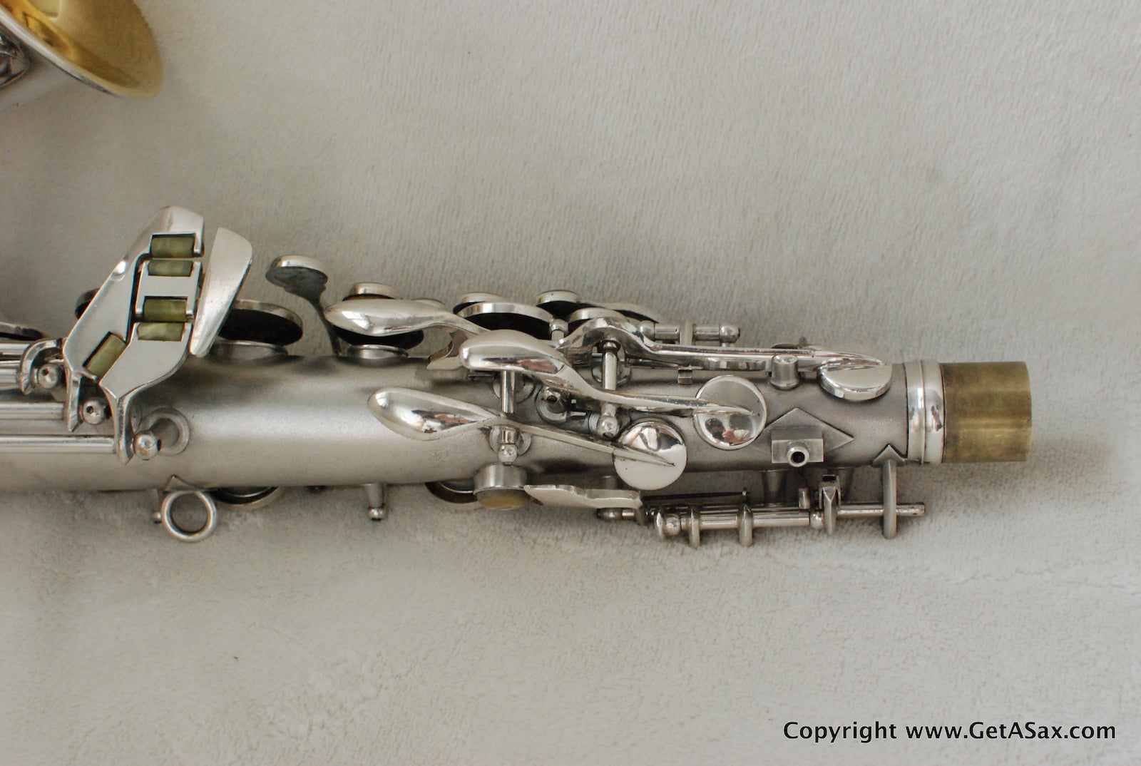 This is a pristine, early silver Conn 6M alto saxophone. It has the rare "Metro" stamp on the body, which is probably something like the VIII stamp that came later to distinguish the best horns. This horn came from the original owner and it is in truly excellent condition with virtually all of the original silver plate intact, and a dark gold wash remaining on the bell. There are no dents, no dings, no past repairs at all. The neck is perfect, as is the bell and bottom bow. This horn has been gently polished, and it is ready for a repad. The original pads have been removed, so the horn is being sold as-is, needing pads. It is waiting in line for a repad along with lots of other horns, so here is your chance to get it more quickly and have the tech of your choice do the work.