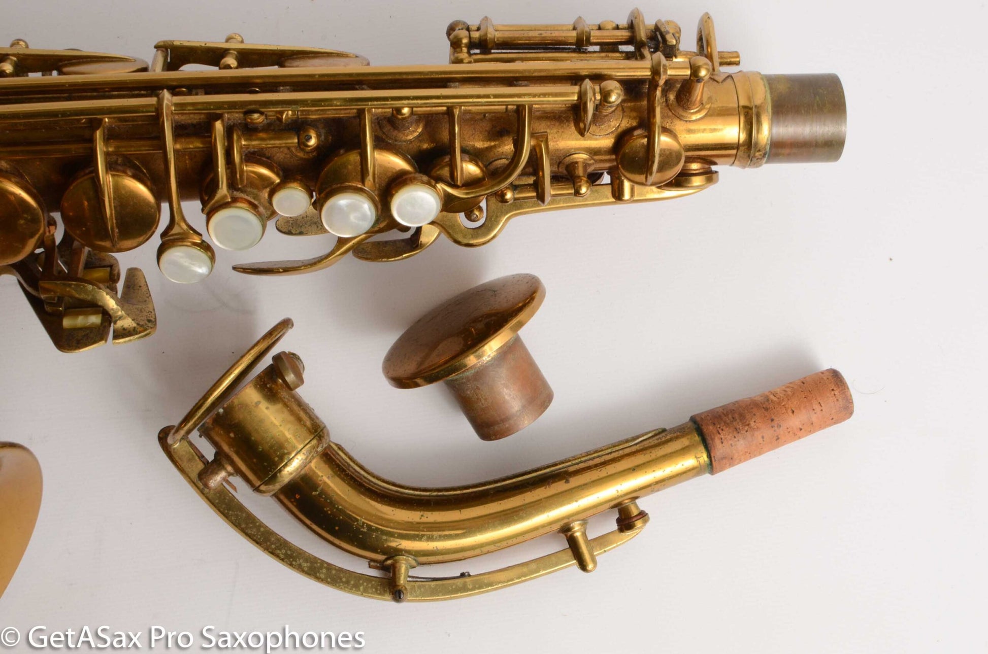 This is a beautiful original lacquer pre-war Conn 6M Alto saxophone in excellent condition with the rare and desirable ‘NY’ Neck. I’m not sure why it is called that, but this means the neck without microtuner and with the octave key going over the top and around the tenon in a large loop. This is only the second one I have seen that still had its ‘sombrero’ shaped neck octave key protecting tool in the case. This goes in the neck tenon to keep the loop of the octave key in perfect shape. This 6M has original pads from 1938 and needs an overhaul, but it is priced very low for what you get. These are among the best playing alto saxophones of all time. I play a Conn very much like this myself, and it blows the walls down while also tuning better than almost any other saxophone at the same time. It’s fantastic.