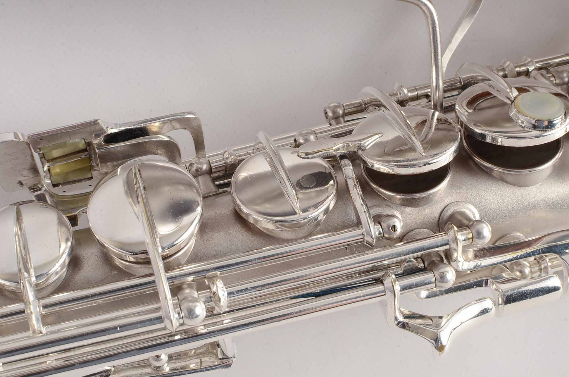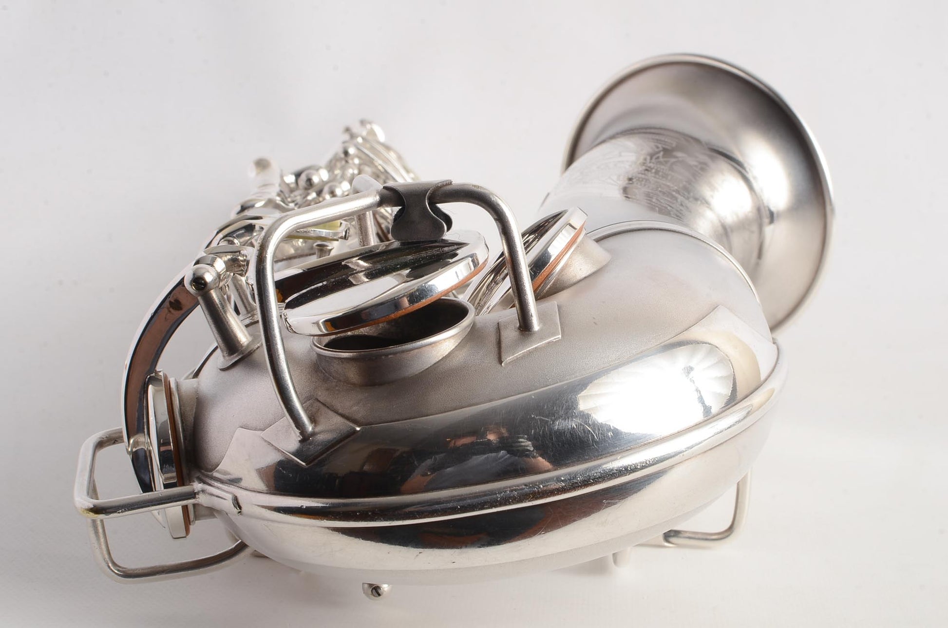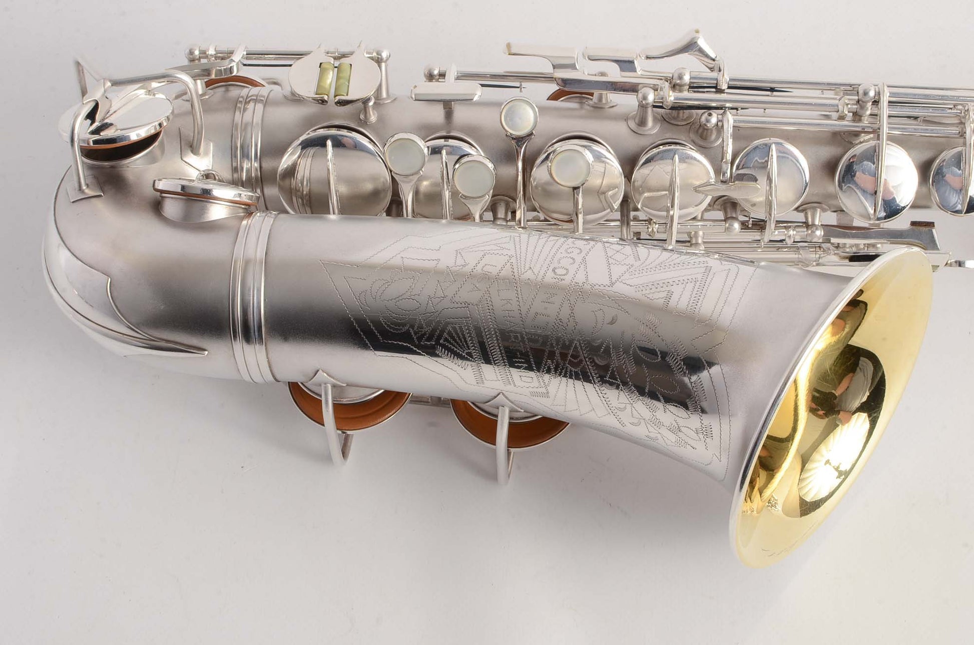 The Conn 6M transitional takes many forms, and this particular original silver plated example is from 1932. It features art deco engraving (a style which only appears for a couple of years), left hand bell keys, 6M style keywork everywhere except the left hand pinky table, which is New Wonder II style. This is the last iteration before the transitional becomes nearly identical to the 6M, and to my ears these have a bit wider tone of the New Wonder II than the transitionals just after it- and in fact around this serial range is my favorite of the transitionals, playing-wise.