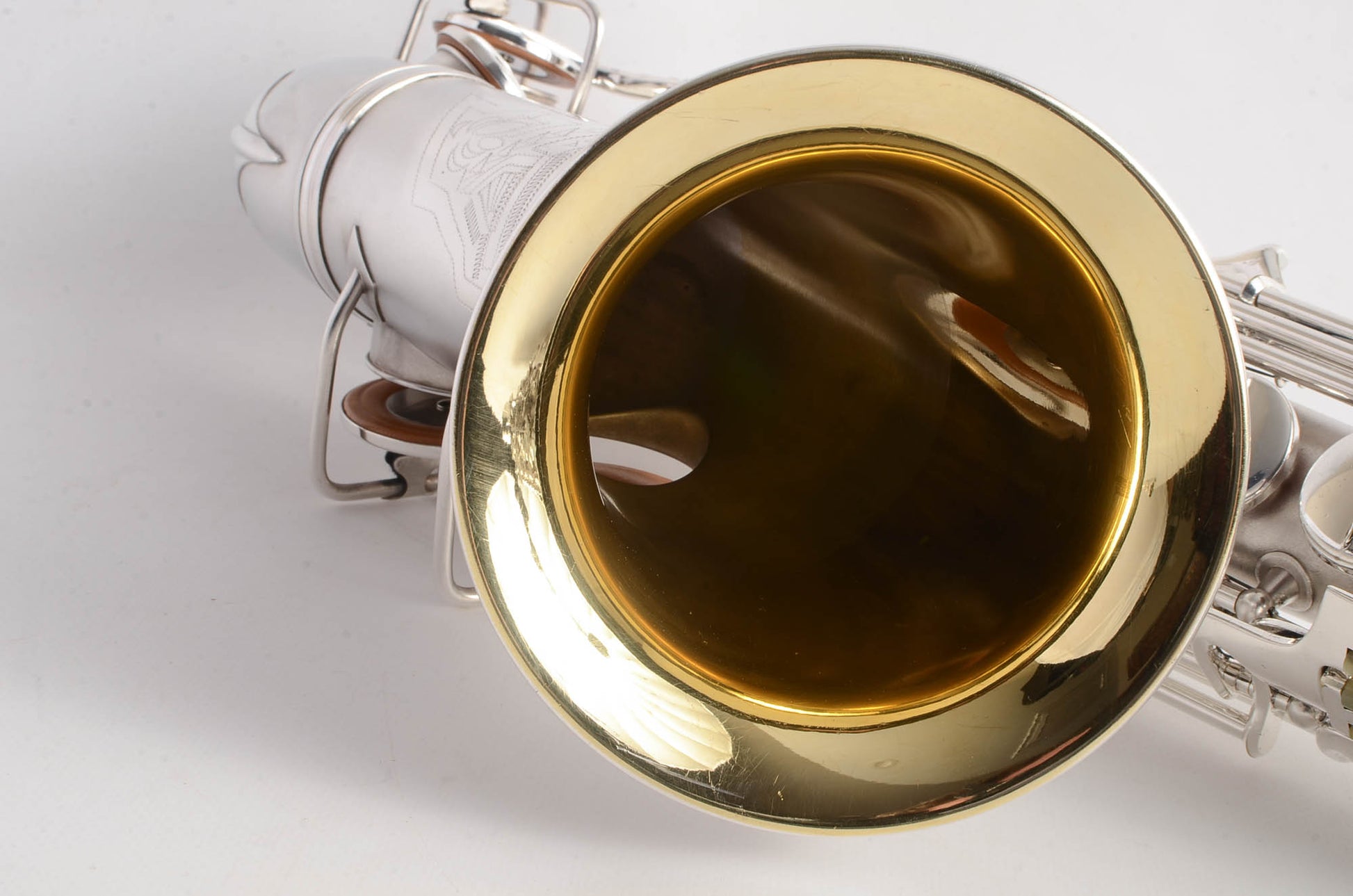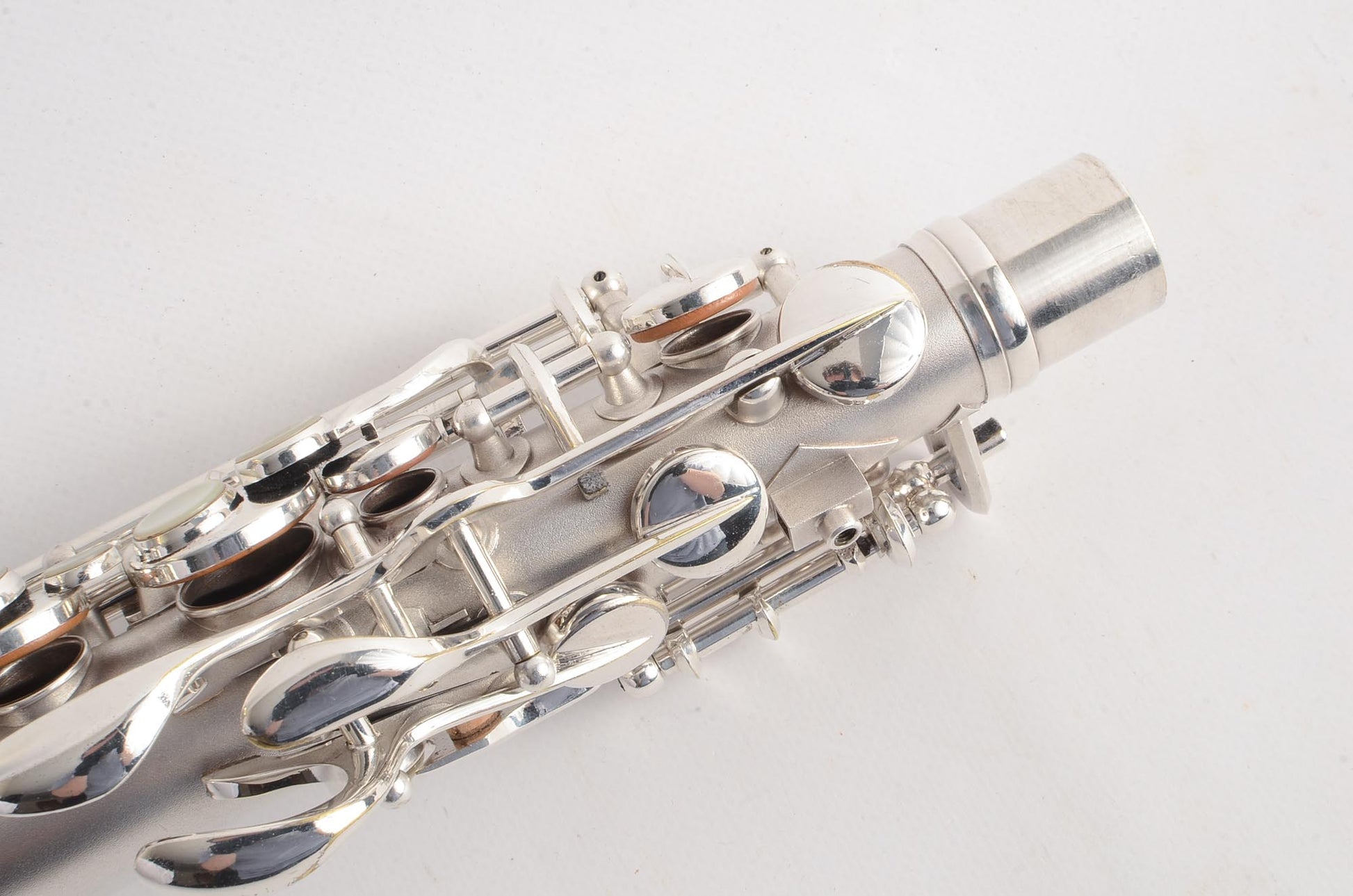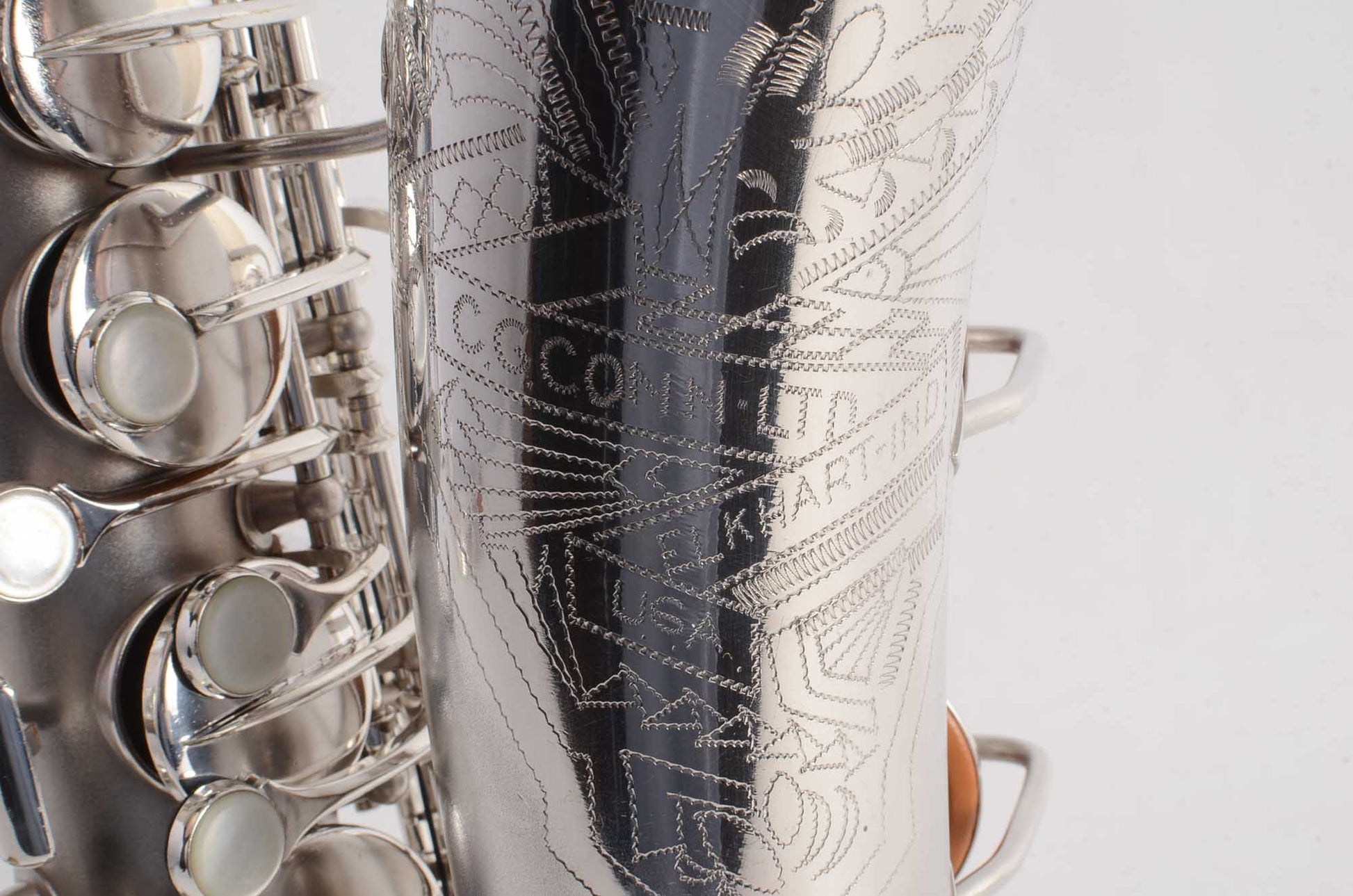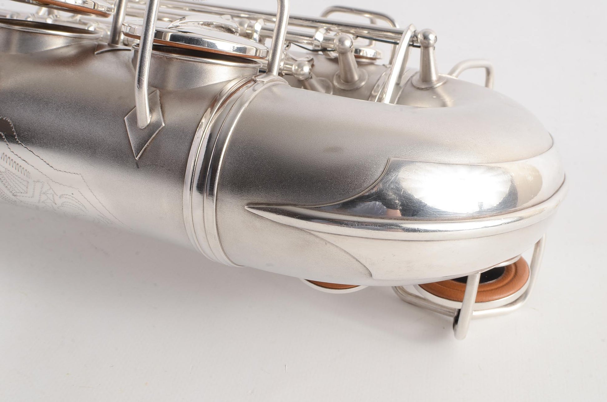 The Conn 6M transitional takes many forms, and this particular original silver plated example is from 1932. It features art deco engraving (a style which only appears for a couple of years), left hand bell keys, 6M style keywork everywhere except the left hand pinky table, which is New Wonder II style. This is the last iteration before the transitional becomes nearly identical to the 6M, and to my ears these have a bit wider tone of the New Wonder II than the transitionals just after it- and in fact around this serial range is my favorite of the transitionals, playing-wise.