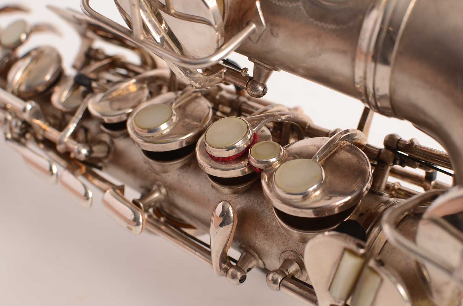 The condition is very good - original silver plate and gold wash in the bell are both almost all present. There’s no significant damage, nor are there serious past repairs. The only repairs I see are resoldered low Eb and C key guards. These often pop off on their own, or from the smallest provocation on the curved sopranos. I don’t see any evidence of dent work around either key guard, so I do not think there was any sort of damage there. The bell flare, bell, bow, and body tube are all in very good shape.There’s a tiny U shaped piece of metal is missing from the neck, that is usually called the octave guide. It doesn’t have much of a job to do on soprano, as the octave key is so short and doesn’t need to be guided, but there’s a spot under the octave key where it used to be. I could very likely get one made and silver plated to match, though that would take a while. There’s also a foot on the Eb key that rests against a black rubber bumper that makes the Eb action feel snappy. I think that’s an addition, though Conn was always experimenting. Could be easily removed if you want, but it lets Eb open farther than it would using a felt bumper. The rolled tone holes look very good. No damage or wear or filing on this horn.