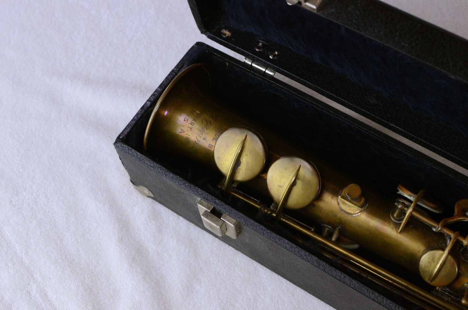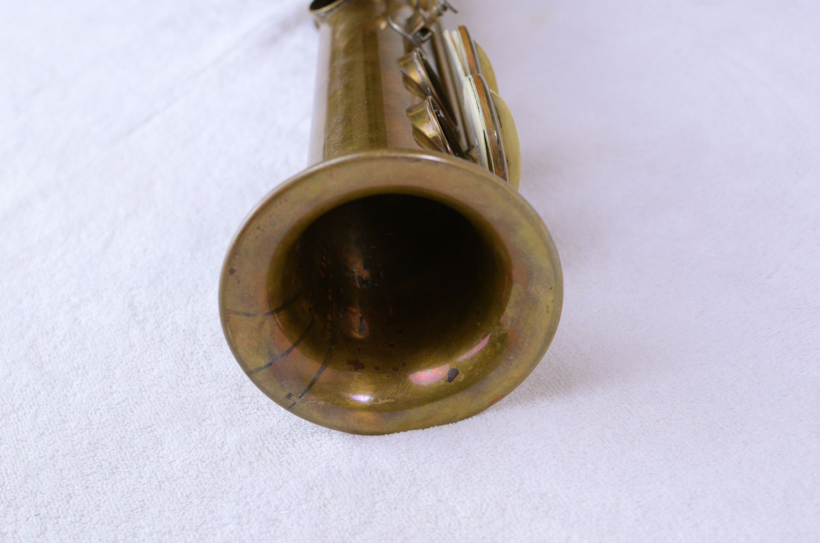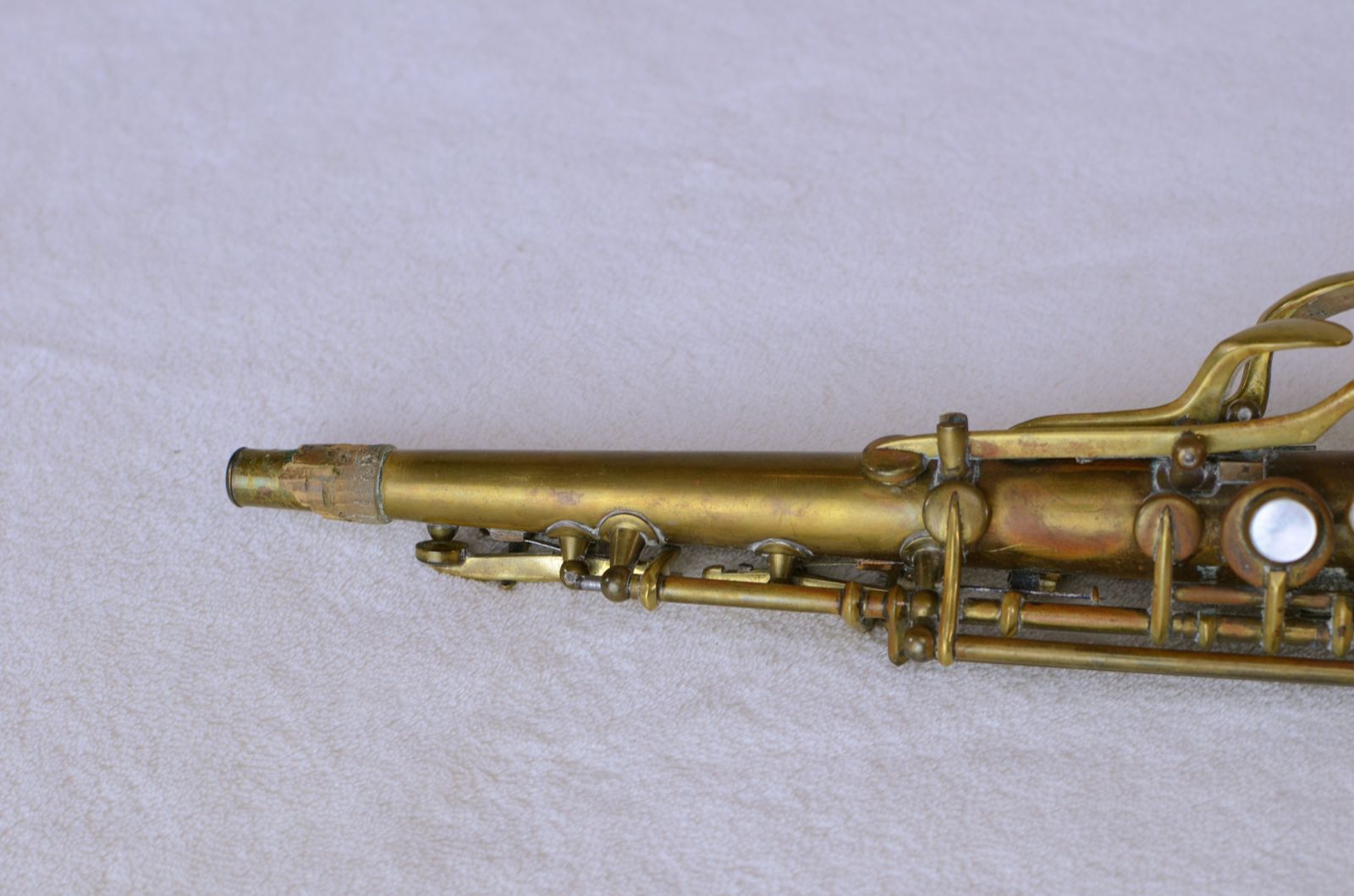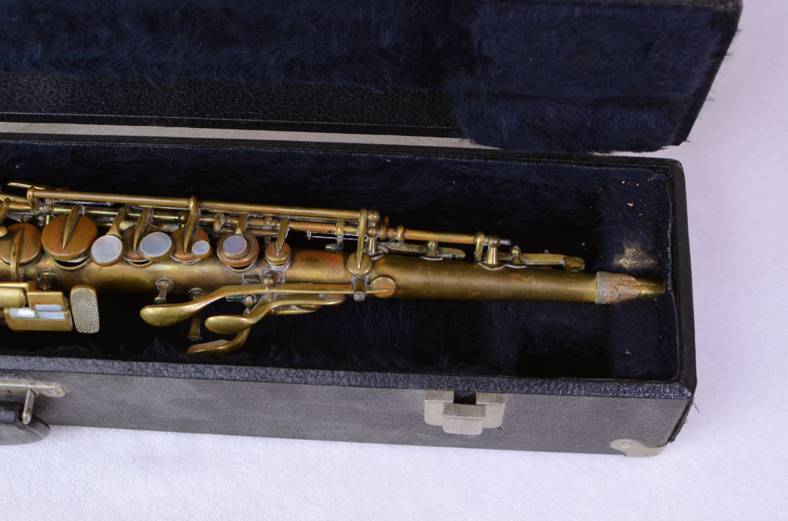This is a mint original Conn New Wonder II soprano SN 154xxx. It has no past repairs, no dents, no dings, nothing. It's still in its original bare brass finish as they came from the factory at this time. It still has all of its white kid leather pads from the factory as well. The nailfile G# key is super-crisp and shows how little this horn has been played. It needs a repad, obviously, in order to be playable at all. But the body is straight and the horn is so pristine that it promises to be an easy and rewarding restoration. If you are looking for a high-quality vintage soprano at a reasonable price that you can restore, this could be a very good option.