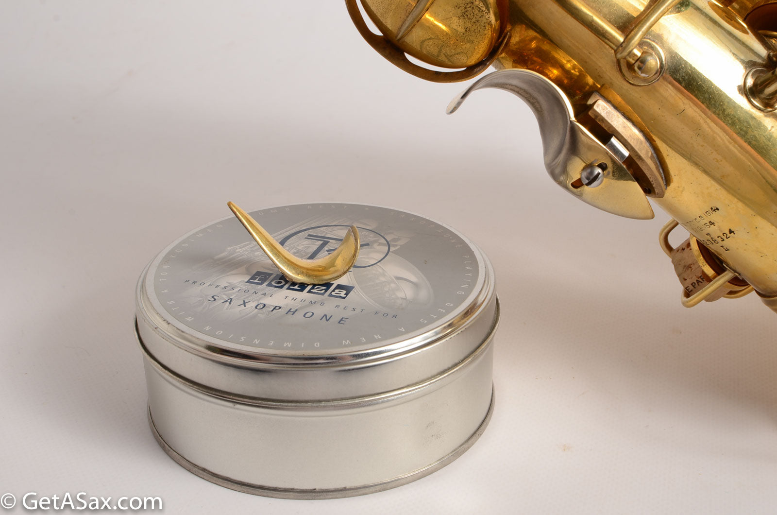 Cosmetically, this horn is also in excellent shape. The gold plate is in great shape, with only some minor wear from use. The body octave pip was resoldered (I think maybe the solder wasn't sealing there?) and there were a few small dings removed from the inside of the back of the bow. The original neck looks great and is not pulled down or damaged. The body tube and bell flare both look excellent as well. This horn has a modern thumb rest installed, and it also includes the original Conn thumb hook. It also has a modern strap hook that is easily removable, and is just attached to the original Conn strap hook. Really cool idea, and easier than soldering a second strap hook. Everybody should do this to improve the balance of Conns. I am going to start carrying this part, if I can't find it for sale elsewhere. It's great!